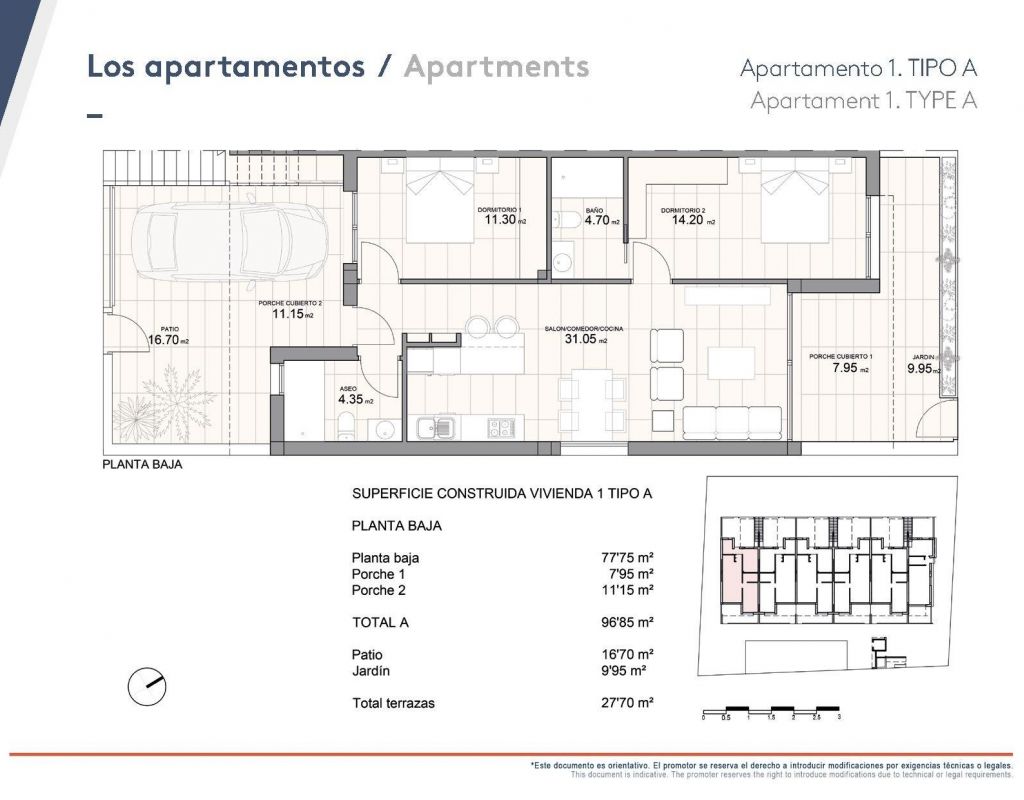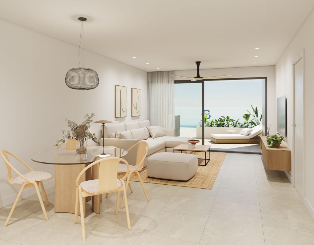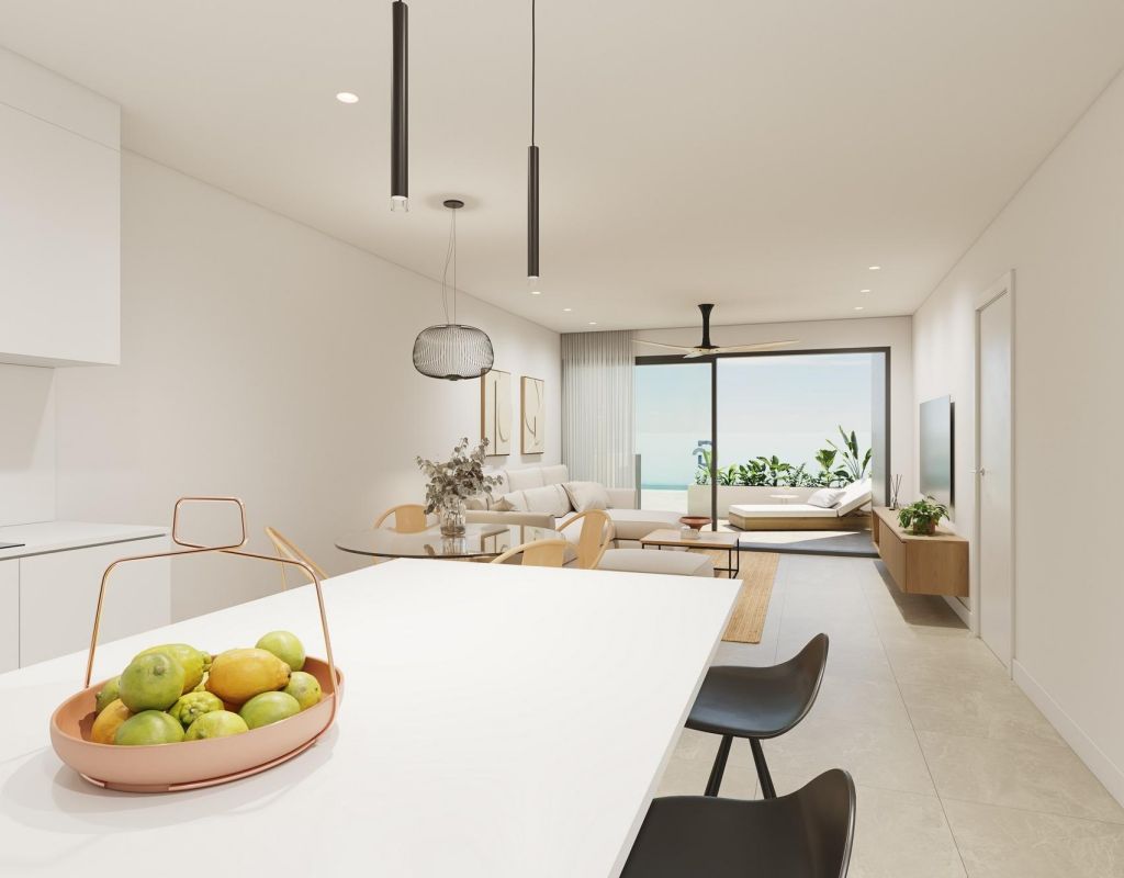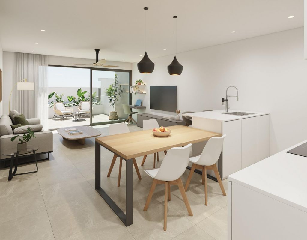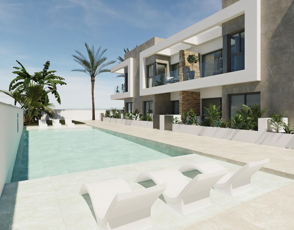 Modern Apartments in Pilar de la Horadada € Exclusive New Build Residential Complex Discover a new residential development of 12 stylish apartments with spacious common areas located in the vibrant town of Pilar de la Horadada, Costa Blanca. This gated community offers modern amenities and is designed to provide comfort and convenience in a prime location, close to all essential services and popular attractions. Exceptional Amenities for a Comfortable Lifestyle The residential complex features a private outdoor garage, bicycle parking with electric charging points, expansive landscaped gardens, and a modern swimming pool with a beach area and sunbeds. There are also changing rooms and restrooms for added convenience. The project is built with high-quality materials, energy-saving systems, and cutting-edge technologies like remote door opening. Thoughtfully Designed Apartments Choose from 2-bedroom apartments with open-plan kitchens, spacious living areas, and terraces. Ground floor apartments come with private gardens, while upper-floor apartments feature terraces and solariums. Each apartment is designed to maximize space and natural light, with a south-facing orientation for optimal comfort. Modern features include LED lighting, pre-installed air conditioning, fully equipped bathrooms, and contemporary kitchen appliances. Prime Location Close to Beaches and Golf Courses Pilar de la Horadada offers easy access to daily necessities, sports facilities, and beautiful beaches just 3 km away. The town is well connected, with Murcia Airport 40 km and Alicante Airport 75 km away. Enjoy world-class golf courses, including five within a 15 km radius, and shopping at La Zenia, just 15 minutes by car.