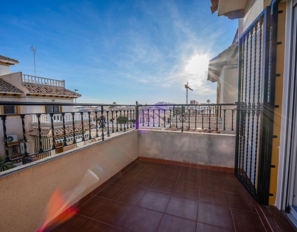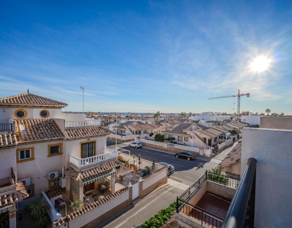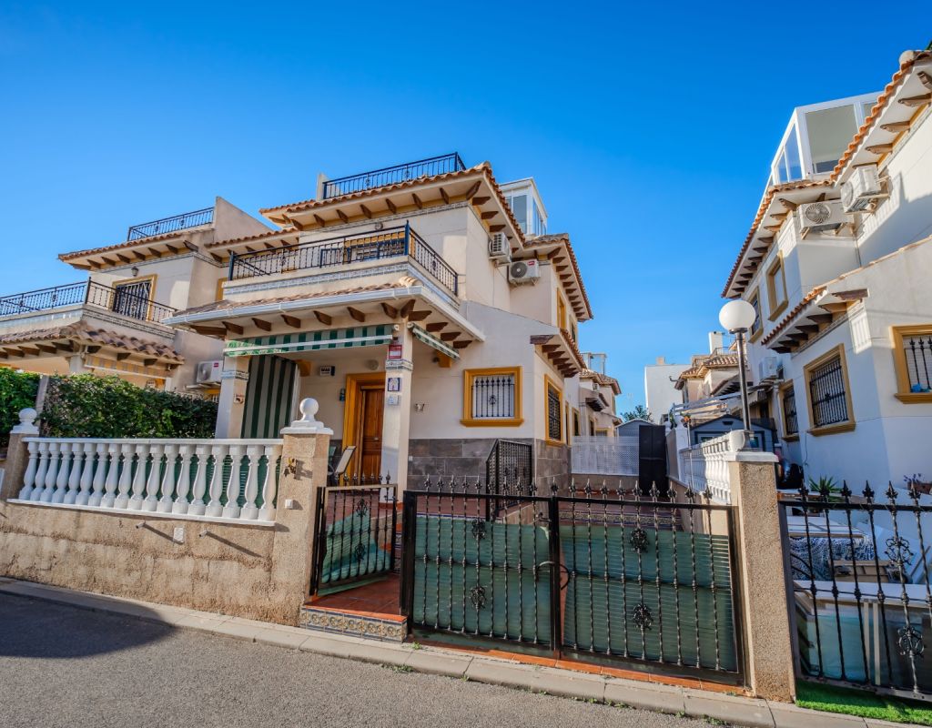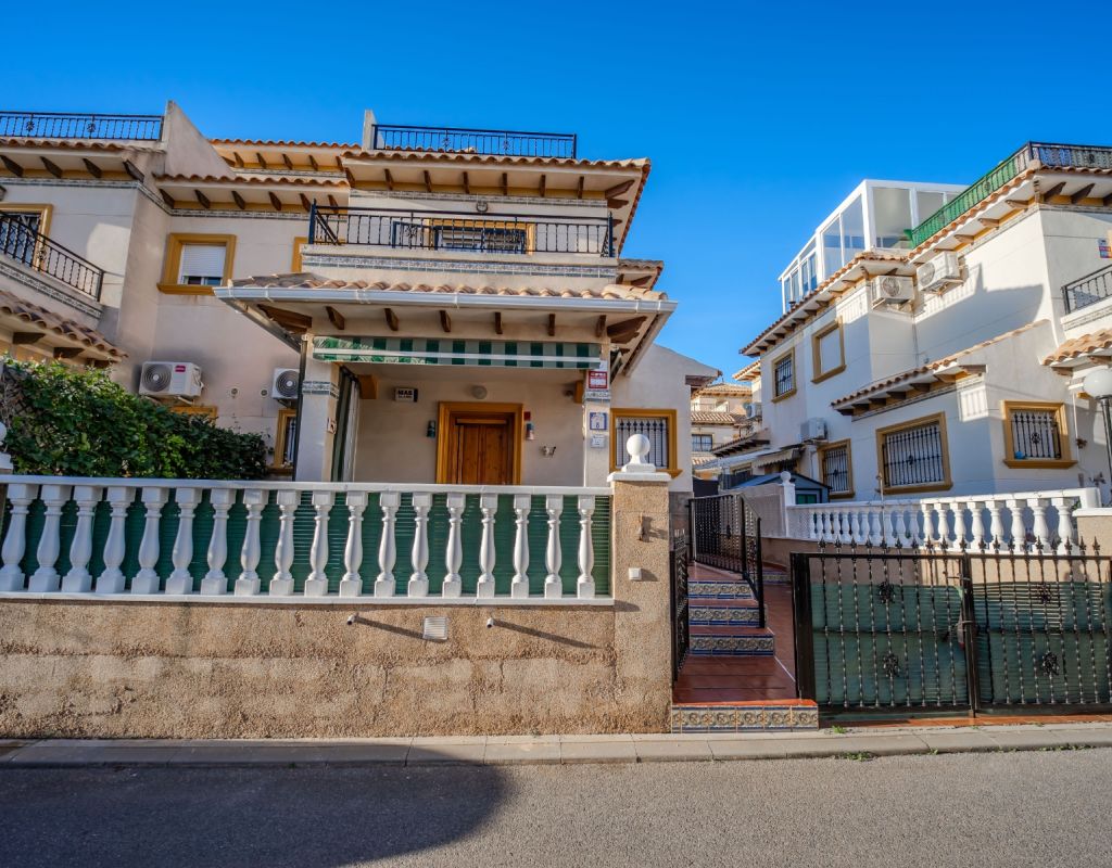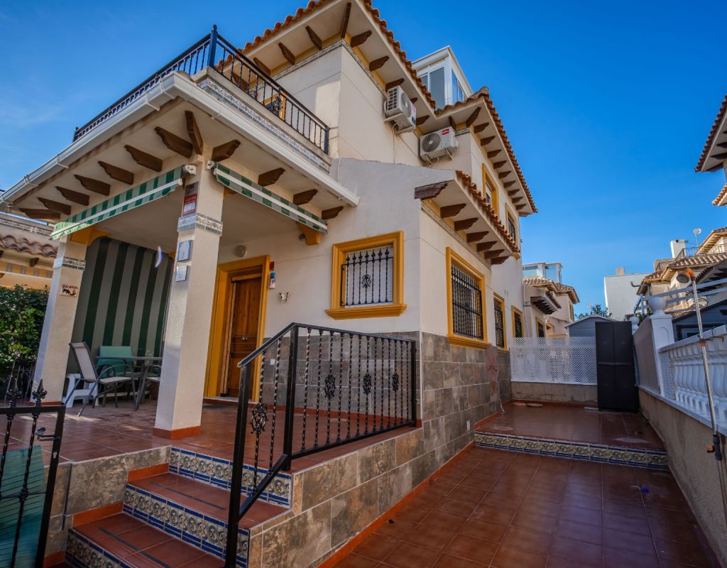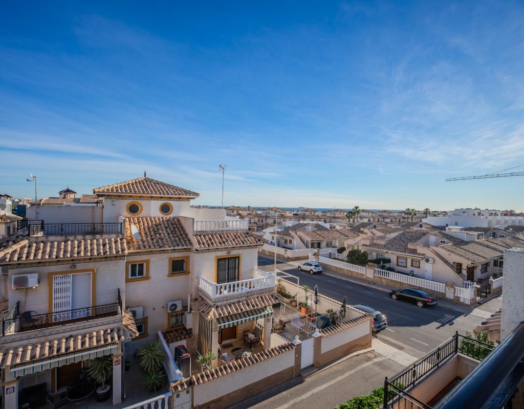 An exceptional opportunity to secure your own traditional-style 2-bedroom, 1.5-bathroom quad house in the highly desirable La Zenia area This beautifully presented and impeccably maintained home perfectly blends comfort, space, and classic Mediterranean charm. The sun-drenched front terrace welcomes you in and provides the perfect setting to enjoy all-day sunshine. A private driveway adds convenience, while the spacious terraces offer ideal outdoor living all year round. The impressive private solarium boasts partial sea views, creating a wonderful space for relaxing, entertaining, or simply soaking up the Costa Blanca lifestyle. The ground floor features a bright and inviting living area, a fully fitted kitchen, a comfortable bedroom, and a convenient guest WC. Upstairs, you will find two generous double bedrooms with built-in wardrobes and a stylish family bathroom. The master bedroom benefits from its own private balcony, and an internal staircase leads to the expansive rooftop solarium complete with storage space and those charming sea views. Set within a well-maintained community with access to a beautiful communal pool, the property is sold fully furnished, including white goods and air conditioning — ready for immediate enjoyment, whether as a permanent residence, holiday home, or investment opportunity. Ideally positioned within walking distance to Zenia Boulevard, a wide selection of restaurants, shops, and the lively Cabo Roig strip, and just a 20-minute stroll to the golden sands of La Zenia Beach. A superb opportunity to own a character-filled home in one of Costa Blanca’s most sought-after coastal locations — early viewing is highly recommended.
