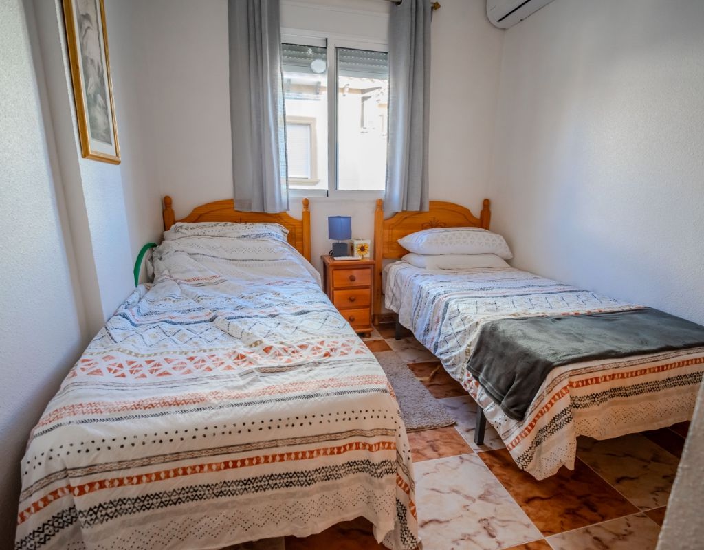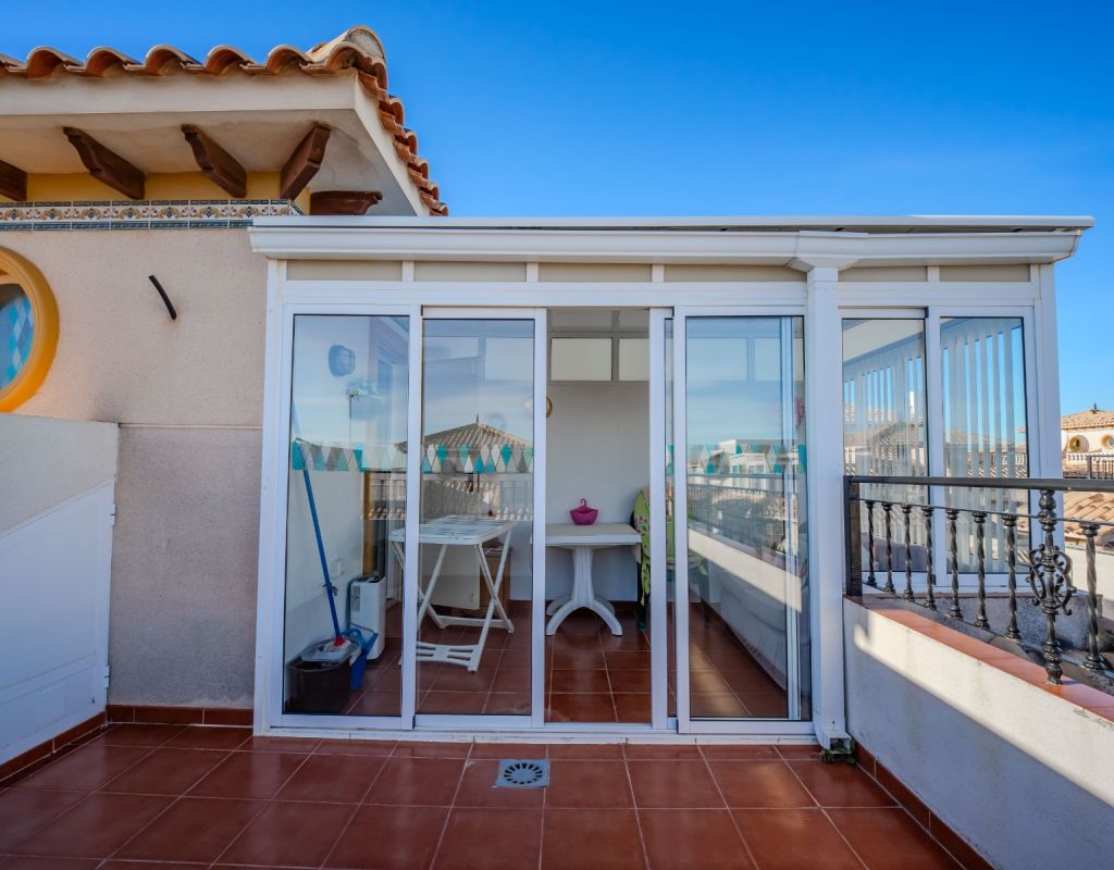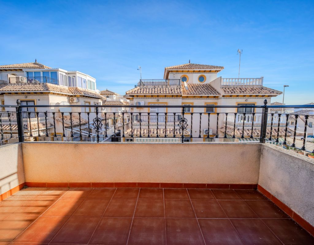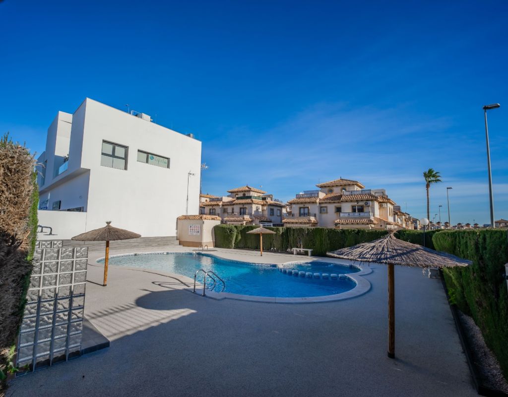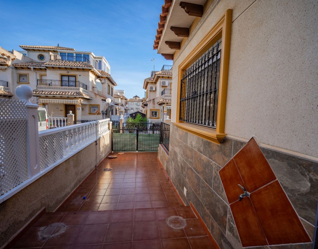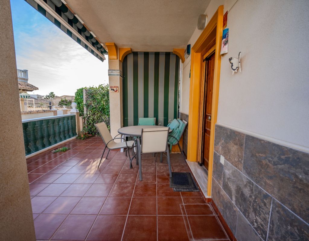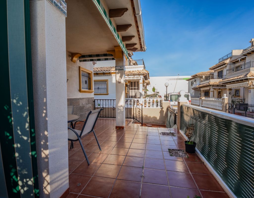 An exceptional opportunity to secure your own traditional-style 2-bedroom, 1.5-bathroom quad house in the highly desirable La Zenia area This beautifully presented and impeccably maintained home perfectly blends comfort, space, and classic Mediterranean charm. The sun-drenched front terrace welcomes you in and provides the perfect setting to enjoy all-day sunshine. A private driveway adds convenience, while the spacious terraces offer ideal outdoor living all year round. The impressive private solarium boasts partial sea views, creating a wonderful space for relaxing, entertaining, or simply soaking up the Costa Blanca lifestyle. The ground floor features a bright and inviting living area, a fully fitted kitchen, a comfortable bedroom, and a convenient guest WC. Upstairs, you will find two generous double bedrooms with built-in wardrobes and a stylish family bathroom. The master bedroom benefits from its own private balcony, and an internal staircase leads to the expansive rooftop solarium complete with storage space and those charming sea views. Set within a well-maintained community with access to a beautiful communal pool, the property is sold fully furnished, including white goods and air conditioning — ready for immediate enjoyment, whether as a permanent residence, holiday home, or investment opportunity. Ideally positioned within walking distance to Zenia Boulevard, a wide selection of restaurants, shops, and the lively Cabo Roig strip, and just a 20-minute stroll to the golden sands of La Zenia Beach. A superb opportunity to own a character-filled home in one of Costa Blanca’s most sought-after coastal locations — early viewing is highly recommended.
