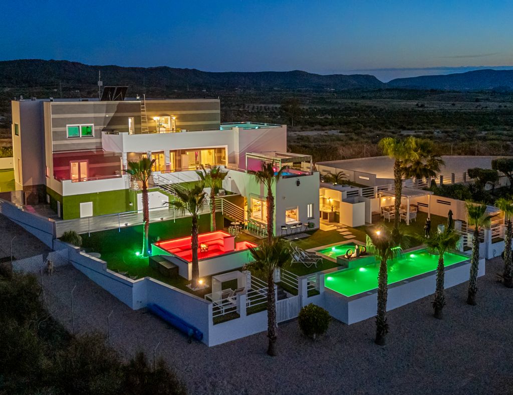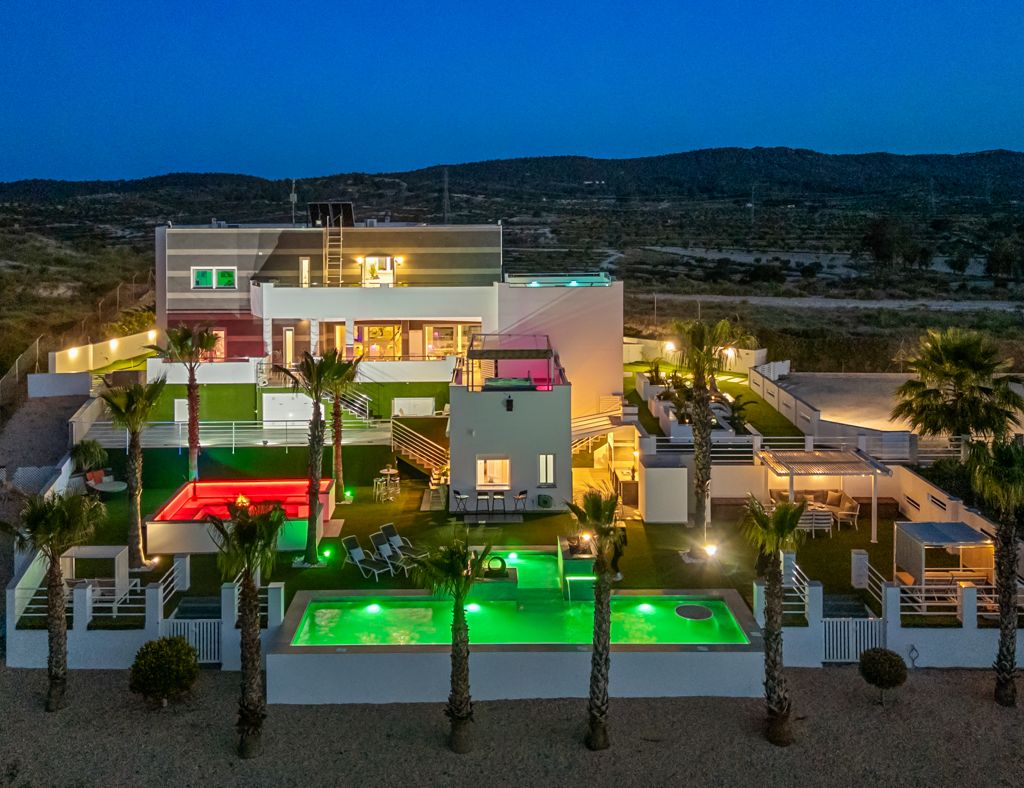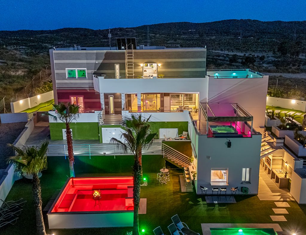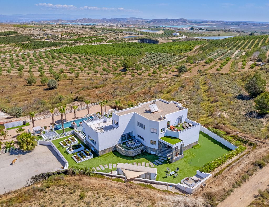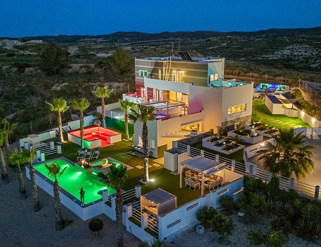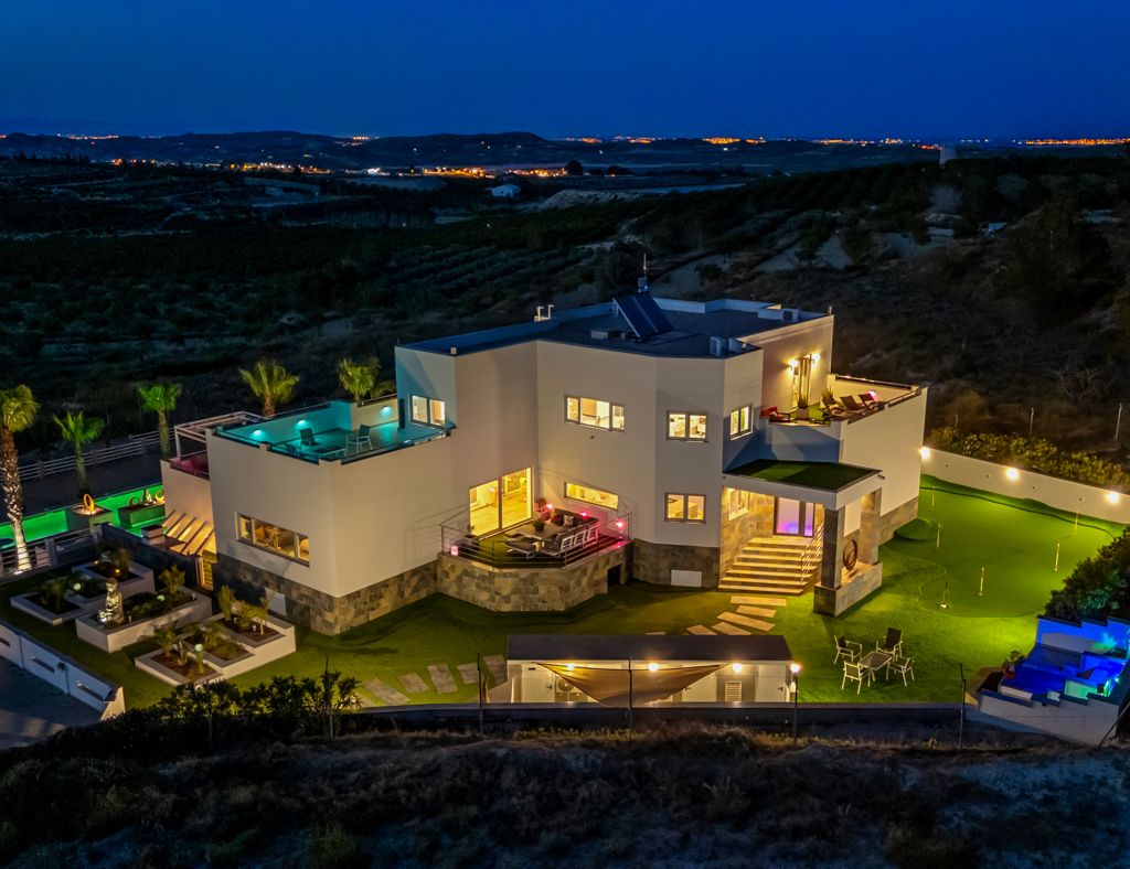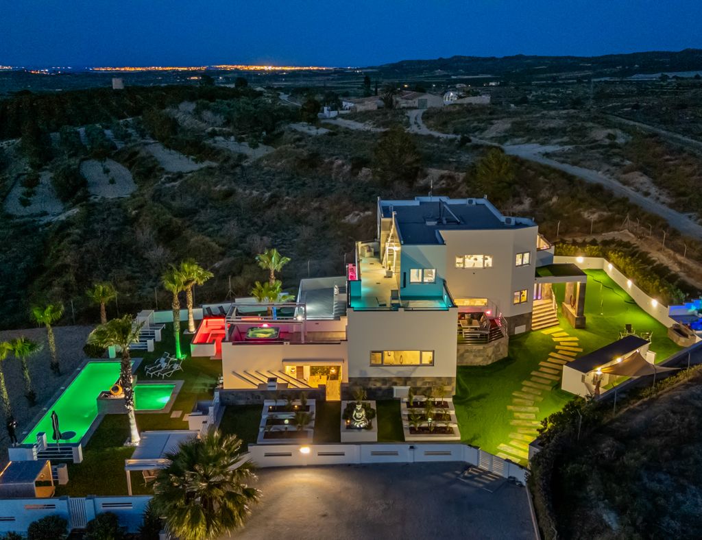 Welcome to this stunning modern eco-finca, expertly crafted to the highest standards and nestled in a picturesque setting on the outskirts of the charming village of Torremendo, Orihuela, Alicante. Key Features: 5 spacious bedrooms and 5 bathrooms, all facing south for optimal sunlight 329m2 of luxurious living space on a vast 16,000m2 plot, perfect for those seeking tranquillity and space Fantastic private swimming pool (12 x 3 meters) with multiple chill-out areas, ideal for relaxation and entertainment Mature trees, mini golfing area, and Jacuzzi, creating a serene oasis Underfloor heating throughout, ensuring a comfortable living environment Pool has a 4x4 shallow area ideal for young children. Property Layout: The ground floor boasts an impressive kitchen with integrated Bosch appliances, seamlessly connecting to the expansive living room and dining area. The unique windows offer breath taking views of the landscape while flooding the interior with natural light. Two bedrooms, a gym (could be converted to a 6th bedroom with an en-suite), and a bathroom complete this level. The first floor is home to the master bedroom, featuring an en-suite bathroom with a deep bathtub and private terrace offering panoramic views. Two additional double bedrooms with a family bathroom and direct access to a large terrace round out this level. With outdoor terraces on this level with shady dining and winter terrace which catches the winter sun. 1 bedroom on this level has a terrace with breath taking views over the Sierra Escalona. Outdoor Oasis: Pool bar table area and fully functional outdoor kitchen with bathroom and BBQ area Jacuzzi with stunning panoramic views Farmable land with various fruit trees and smart irrigation system Eco-Friendly Features: 68 solar panels with 15 kW inverter and 24 x 48-volt batteries for energy efficiency 20 kW backup generator and automatic systems controllable via mobile app Insulated pool cover and automatic chlorine and PH machines for low maintenance Underfloor heating and hot and cold air-conditioning throughout Additional Details: Automatic front gates. Pool Bar has undercover dining area. Panoramic views of the protected natural park, home to eagles, eagle owls, and other wildlife LED lights with interchangeable color schemes throughout the house and garden This modern eco-finca offers the perfect blend of luxury, sustainability, and tranquillity, making it an ideal retreat for those seeking a peaceful and self-sufficient lifestyle. For more information or to arrange a viewing Contact us today!
