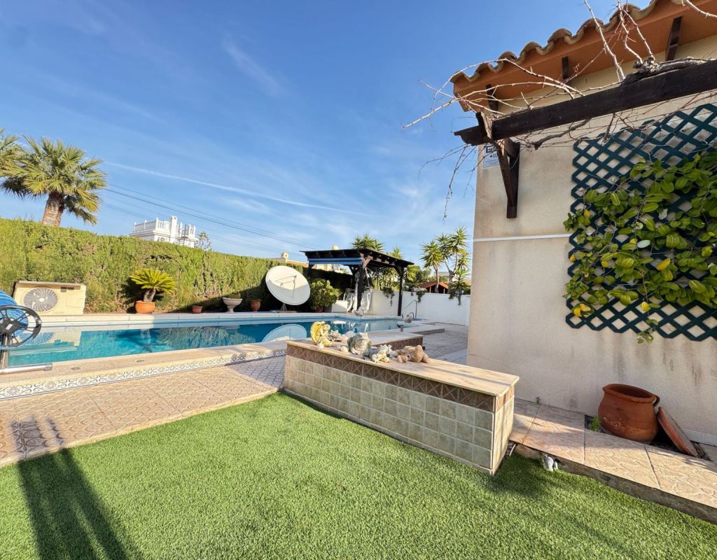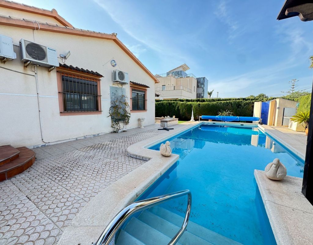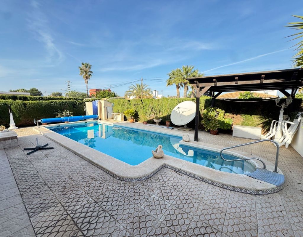 This impressive 3 Bedrooms,2 Bathrooms Detached Villa is located in the sought after area of Cabo Roig. Just minutes walk from the sandy beaches and endless amenities. The property is situated on a 804m2 plot and offers a 178m2 build all on one level. With mature gardens surrounding the property, a drive way, garage and large heated private pool. The property is in its original condition and ready to move into. For more information or to arrange a viewing Contact us today!
