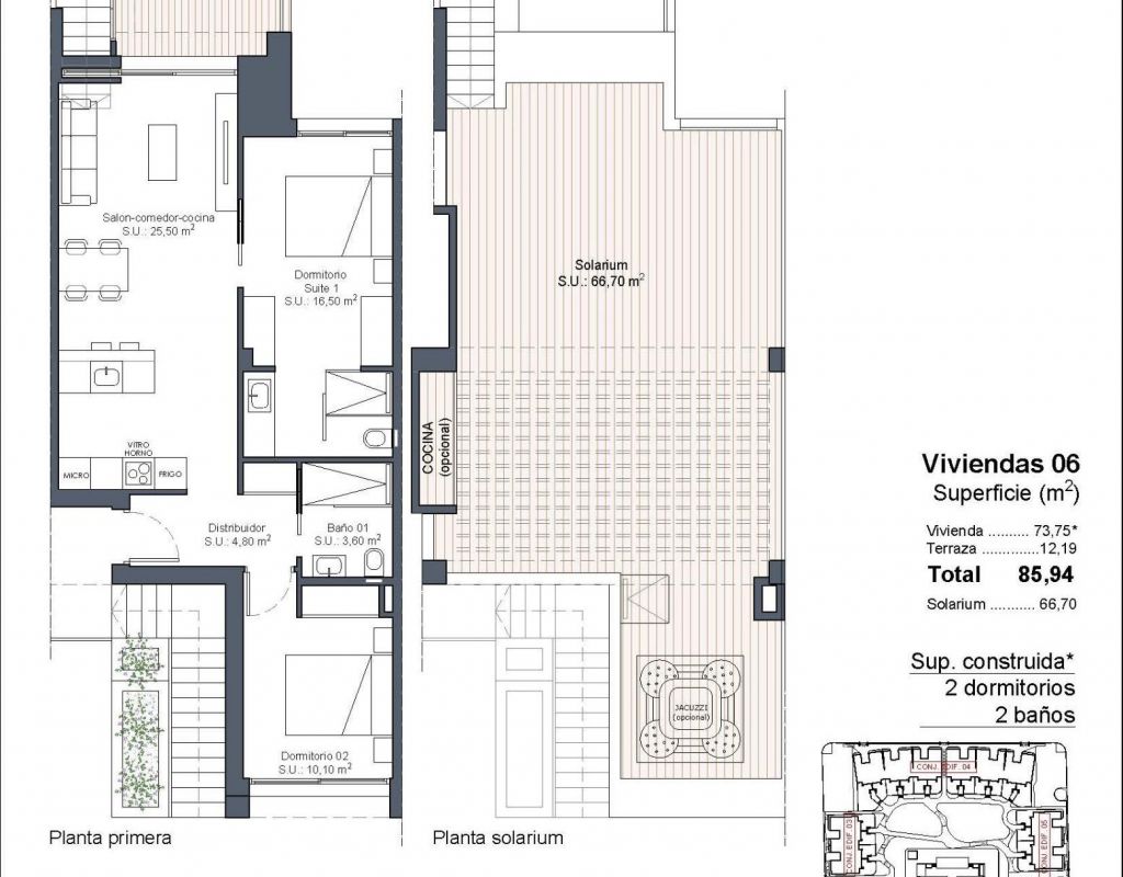 Exclusive New Build Properties in Lo Marabú, Ciudad Quesada Modern Design and Maximum Comfort in a Mediterranean Setting Discover this spectacular residential complex in Lo Marabú, Ciudad Quesada, comprising 80 2 and 3 bedroom homes with 2 bathrooms. Designed with a modern and efficient approach, these properties offer spacious terraces, cross ventilation and high quality finishes to maximise comfort and energy efficiency. The ground floor properties have private gardens, while the top floor properties have private solariums with pre-installation for a Jacuzzi and outdoor shower. In addition, the development has communal swimming pools surrounded by gardens, creating a perfect environment for relaxation and conviviality. High Quality Features for an Exclusive Lifestyle Each home has been designed to offer maximum comfort, with top quality materials and a contemporary design: Large sliding aluminium windows with thermal break. Motorised blinds for greater comfort. Climalit 4+4/14/4/4+4 glazing for thermal and acoustic insulation. Armoured front door with security lock. Fully fitted kitchens with electrical appliances included. Bathrooms with furniture, mirrors and shower screens. 150L aerothermal system for hot water. Complete installation of ducted air conditioning (hot/cold). Lighting in all rooms already incorporated. Parking space included. Thanks to its double façade design, the homes offer natural cross ventilation, providing coolness in summer and reducing energy consumption in air conditioning. Privileged location in Ciudad Quesada Lo Marabú is an exclusive residential area within Ciudad Quesada (Rojales), surrounded by natural spaces and with all services within easy reach. The urbanization is very close to the salt lakes of La Mata and Torrevieja, an ideal environment to enjoy nature and improve your wellbeing. From your new home, you will have quick access to the main points of interest in the area: Guardamar del Segura and Torrevieja beaches - 10 km (15 minutes by car). Alicante-Elche Airport (ALC) - 38 km (35 minutes by car). Murcia-Corvera Airport (RMU) - 65 km (50 minutes drive). Prestigious golf courses - Less than 5 km. Shopping centres and restaurants - Just a few minutes away. Quick access to the AP-7 and N-332 highways, connecting to the whole of the Costa Blanca. A Perfect Home for Enjoying the Mediterranean With their combination of modern design, strategic location and exceptional natural surroundings, these homes in Lo Marabu are ideal for permanent residence, holiday home or investment property. Don't miss out on this unique opportunity. Contact us today for more information or to arrange a viewing of your future home in Ciudad Quesada.