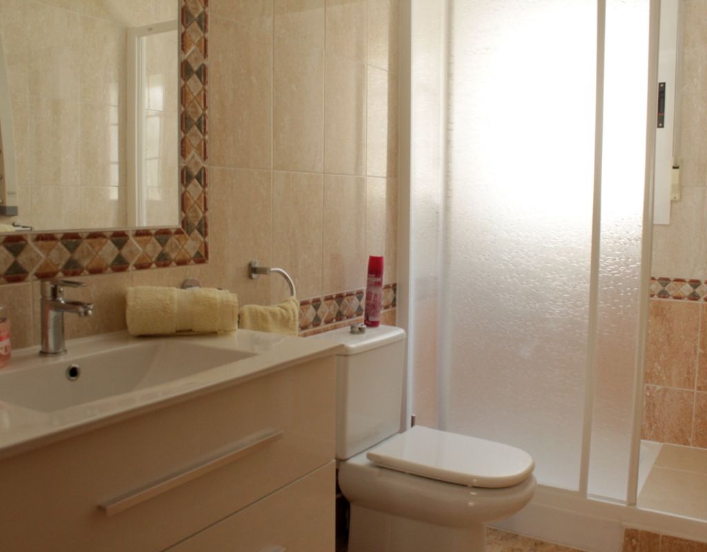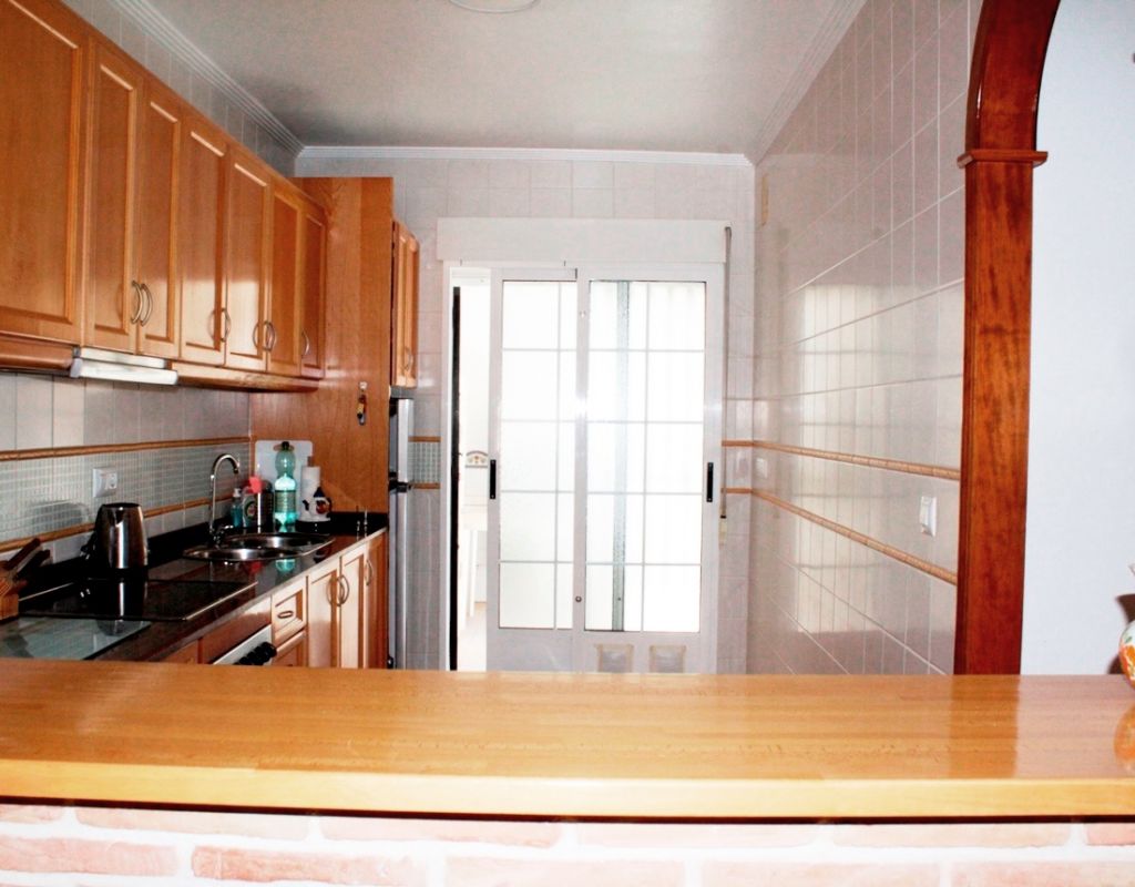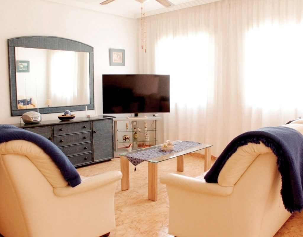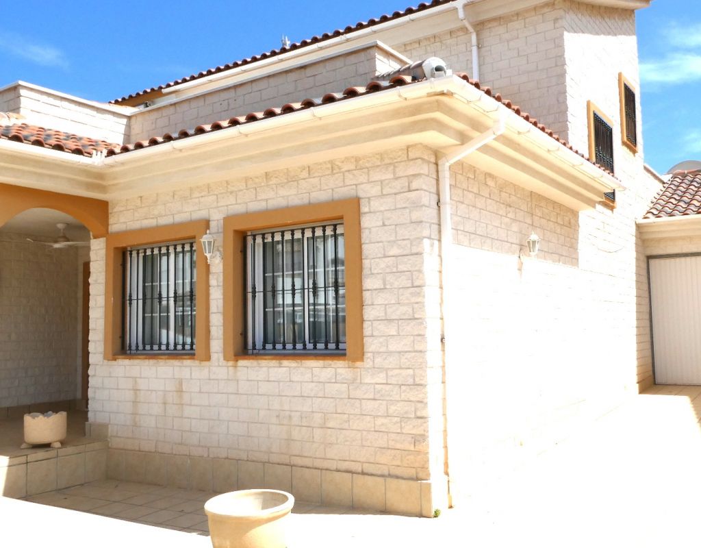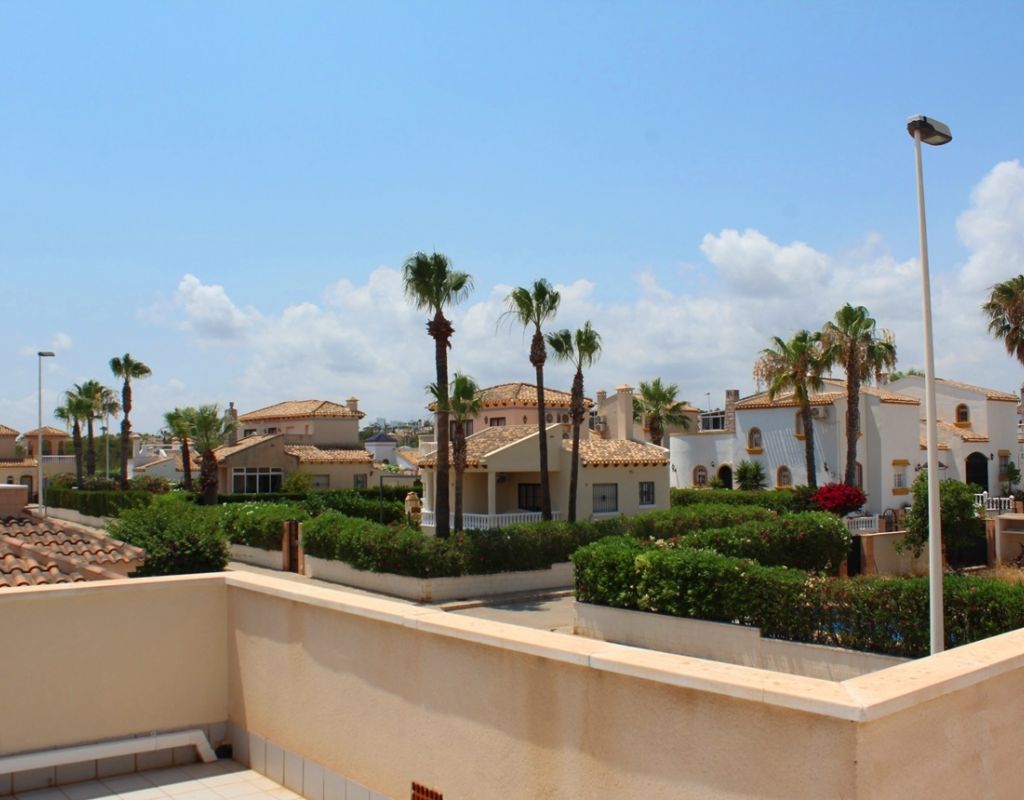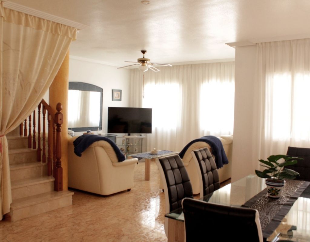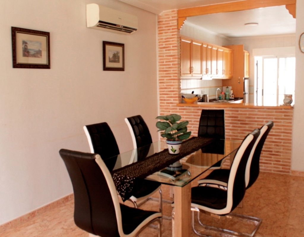 Spacious 135m2 semi detached property with 3 bedrooms and 2 bathrooms situated in the popular area of Los Dolses- Villamartin Golf. The property consists of a large living/dining area, open plan fully equipped kitchen, utility room/patio of 21 m2 plus a double bedroom and bathroom on the ground floor. A staircase leads to the first floor with 2 bedrooms and a bathroom and a large sunny roof terrace . Nice tiled garden of 200 m2 and private garage of 18 m2. The property is sold fully furnished inclduing air conditioning in the main living area and bedrooms. Los Dolses is a very popular area located within walking distance to 4 centres with various shops, a large grocery store, pharmacy, banks and restaurants / bars of all kind. It is only 2 km to beautiful sandy beaches and 5 min.by car to 4 golf courses (Villamartin, Las Ramblas, Campoamor and Las Colinas). Shopping opportunities are also many! Only 3 minutes from the coasts largest shopping center “Zenia Boulevard". Torrevieja town is 8 km away and it is 45 min. to Alicante Airport and 40 min. to Corvera Murcia Airport.