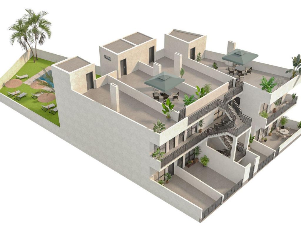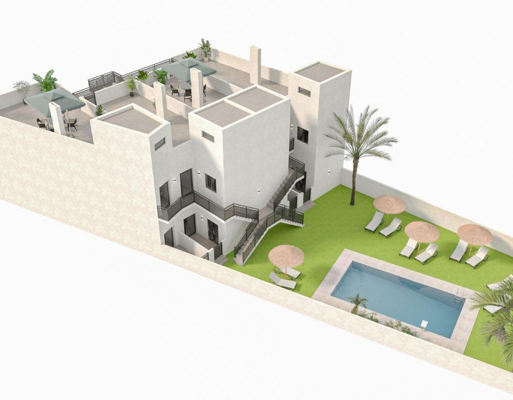 New Build Homes in La Canalosa with Communal Pool Rural Tranquillity with Modern Amenities Welcome to this exclusive residential development in La Canalosa, a charming hamlet in Hondón de las Nieves, Alicante. This new-build development offers a peaceful lifestyle surrounded by nature, with all the amenities you need to enjoy everyday life. With a total of 8 homes with 2 bedrooms and 1 bathroom, it is the ideal option for those seeking peace, comfort and connection with the natural environment. Property Types to Suit All Tastes The ground floor properties have front terraces and rear patios, and three of them offer space to park your car within the private plot. The upper floor properties have a private solarium with storage room, ideal for enjoying the sun all year round and the excellent Mediterranean climate that characterises the area. Specifications and Features Each home has been designed with a practical and modern approach: Pre-installation of ducted air conditioning Security entrance door Bathroom cabinet with mirror High-quality exterior carpentry The residential complex also has a communal swimming pool surrounded by landscaped areas, perfect for relaxing and enjoying time with the family. Natural surroundings and healthy lifestyle La Canalosa is the ideal destination for those who value a simple, healthy lifestyle surrounded by nature. Its rural landscapes invite you to take walks in the open air, go hiking, cycling or simply enjoy the silence and beauty of the surroundings. Just a few minutes away, Hondón de las Nieves offers additional services, local history and a renowned wine tradition. Distances to points of interest Local school: 0.1 km Sports facilities: 0.3 km Medical centre: 3 km Central market: 4 km Golf course: 16 km Shopping centres: 17 km Elche: 26 km Alicante: 26 km Alicante-Elche Airport: 33 km Costa Blanca beaches: 38 km Invest in Wellbeing and Nature This development represents an excellent opportunity to acquire a modern home in a unique and well-connected rural setting. Perfect as a main residence, holiday home or investment with great potential for capital appreciation. Contact us today to schedule your visit and discover your new home in La Canalosa.