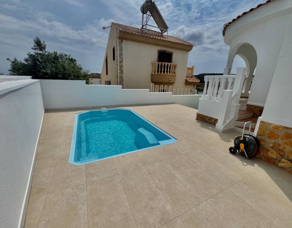 Stunning 2-Bedroom Villa with Private Pool & Panoramic Views – Move-In Ready Located just 10 minutes from the beach and only 5 minutes from golf courses and local amenities, this beautifully refurbished villa offers the ideal blend of comfort, convenience, and style. Set on a generous 214m² plot with 64m² of internal living space, this south-facing home is filled with natural light and boasts a fresh, modern finish throughout. The villa features one spacious master bedroom with patio doors leading to a private terrace and an en suite bathroom, plus a second single bedroom – perfect as a guest room, home office, or children’s room. Step outside and enjoy your own private haven, complete with a small private pool, landscaped garden, and panoramic views. Whether you're soaking up the sun or entertaining guests, the outdoor space is both peaceful and practical. Key Features: 2 Bedrooms | 2 BathroomsBuilt: 64m² | Plot: 214m²Private Pool & Pool ViewPrivate GardensOff-Road Parking (2 Spaces)South-Facing OrientationAir Conditioning & Mosquito BlindsSeparate Kitchen + Utility RoomRecently Refurbished | Excellent ConditionClose to Beach, Golf, Amenities & Airport