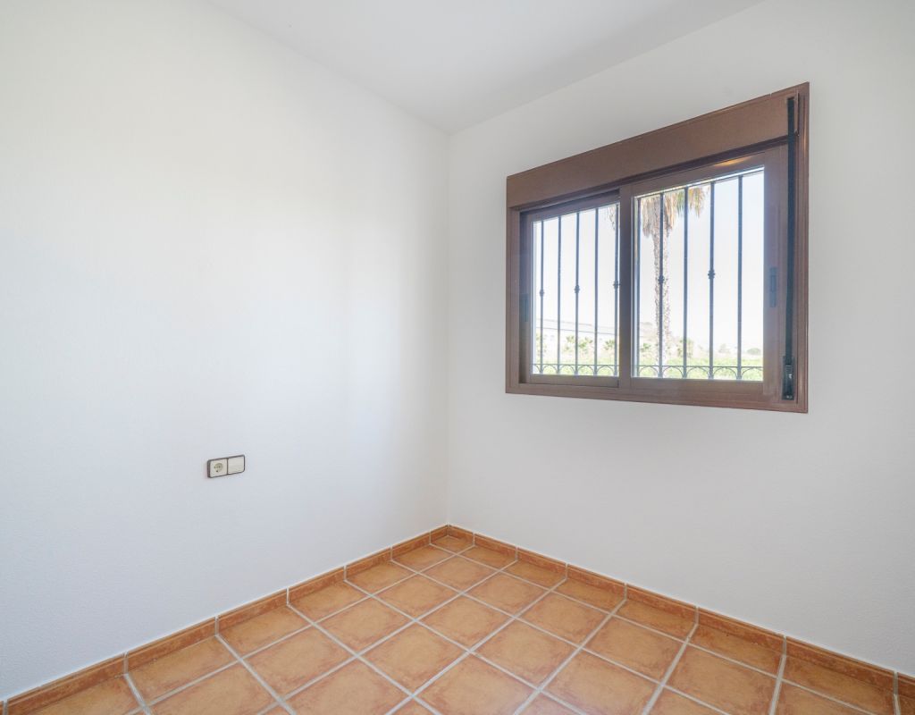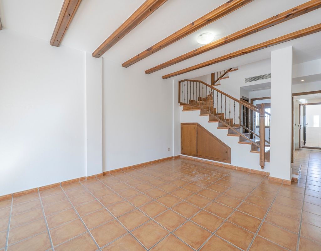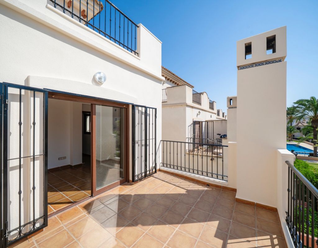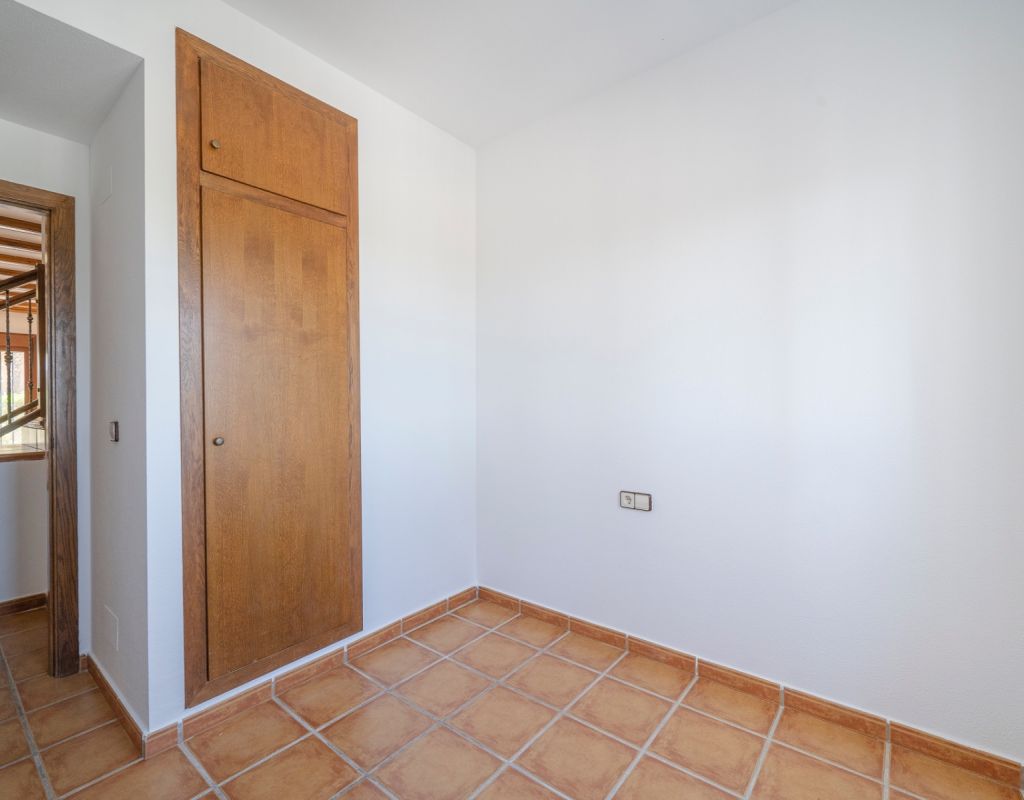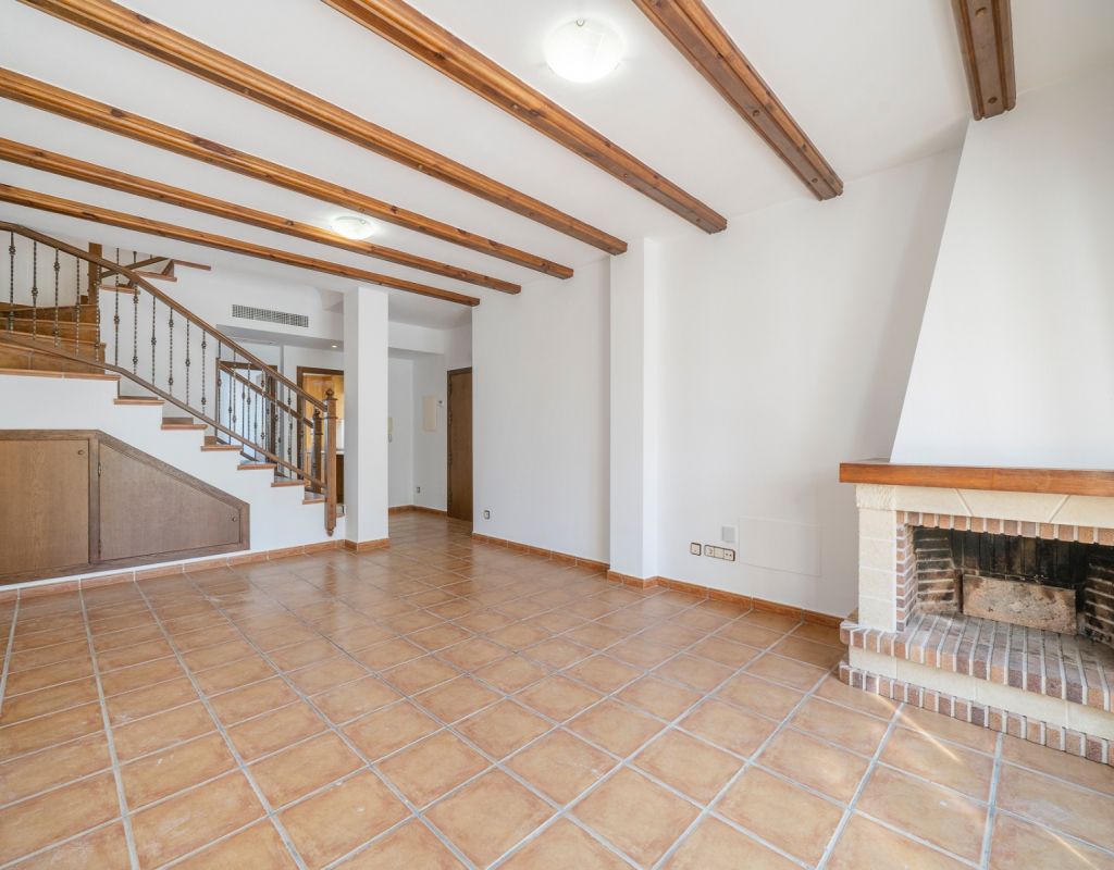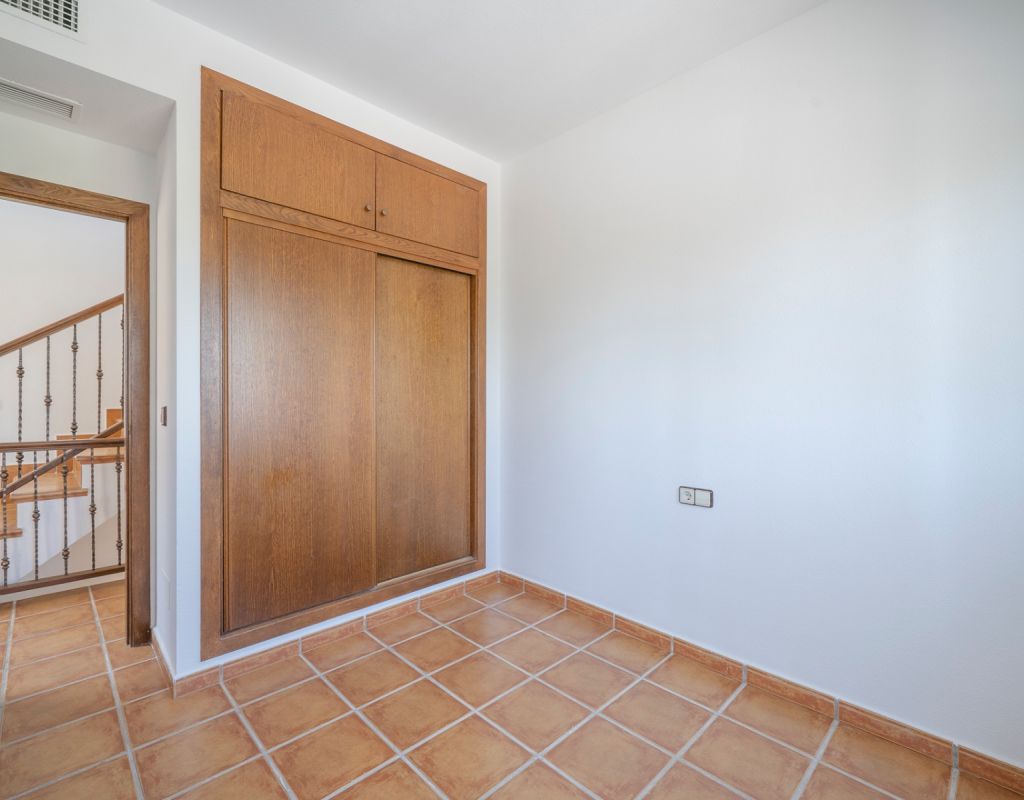 Terraced Bungalow in the "Paradise Golf" Residential Complex This charming terraced bungalow is located in the exclusive "Paradise Golf" complex and is ready to move into. The property features a front garden with parking space and a cozy rear porch with a barbecue, offering direct access to the living room. On the ground floor, you'll find a spacious living room with a fireplace, an independent kitchen with a utility room, one bedroom with a built-in wardrobe, and a bathroom with a shower. The first floor includes three bedrooms with built-in wardrobes — one with a balcony and the other with a lovely private terrace — as well as a full bathroom. On the top floor, there is a sunny solarium terrace with open views, perfect for relaxing or sunbathing. The complex offers a communal swimming pool. The bungalow has been recently painted and is in excellent condition. Sold unfurnished.