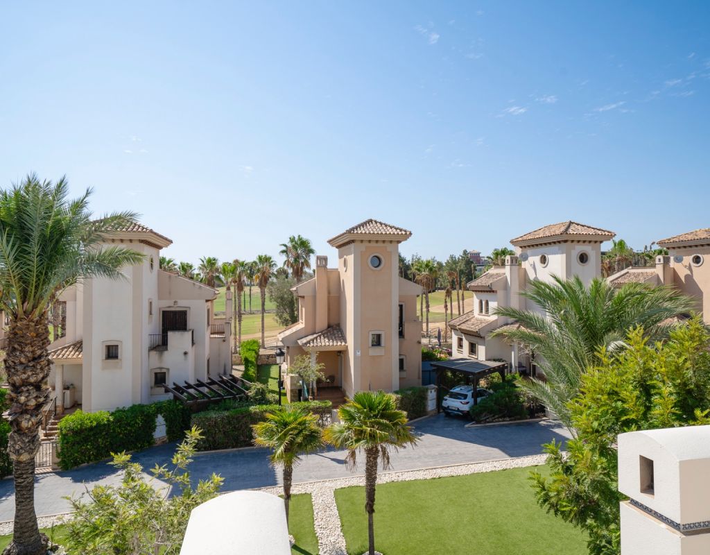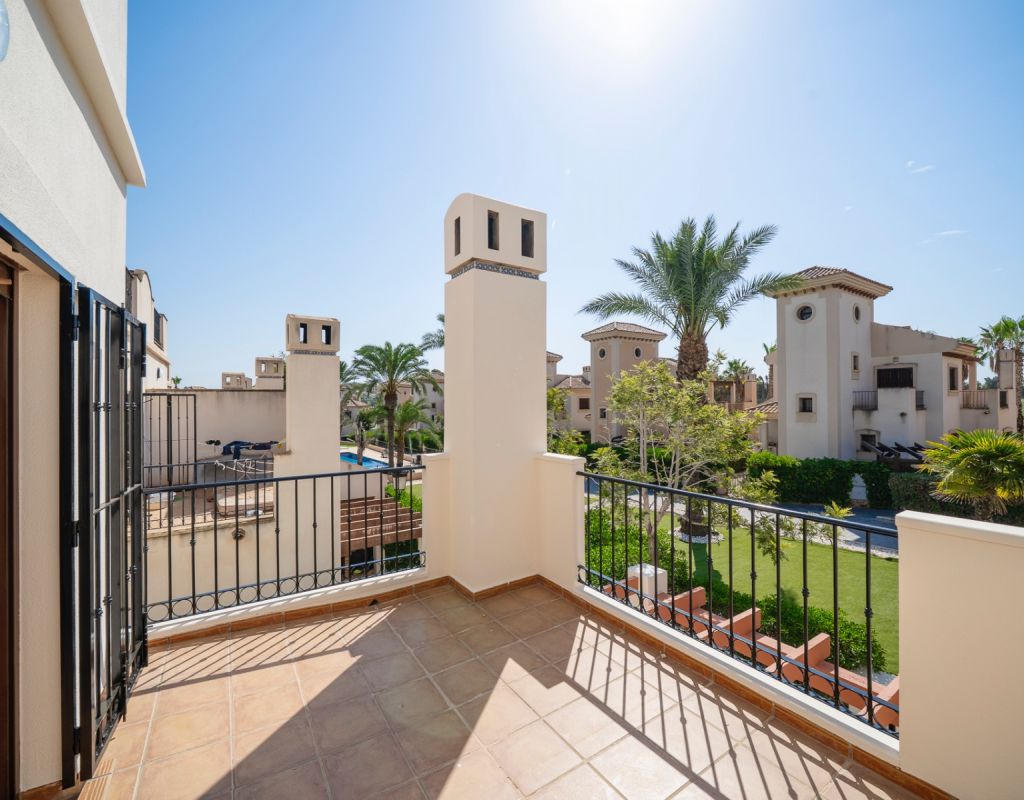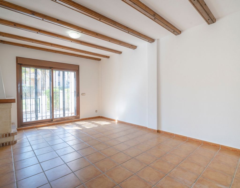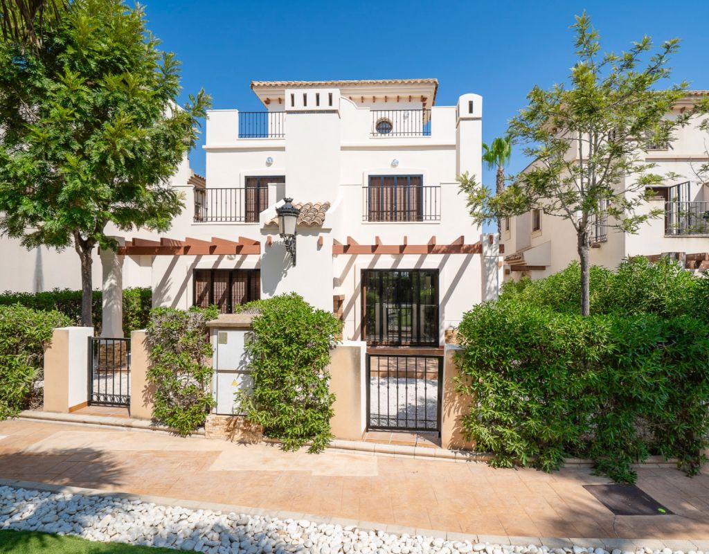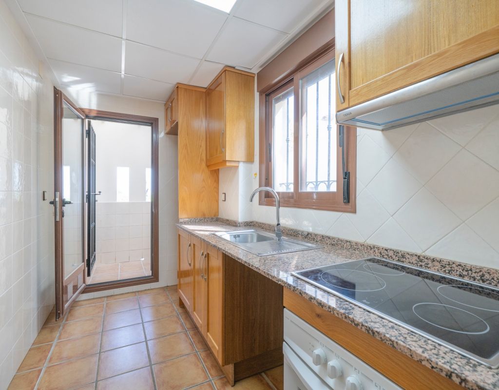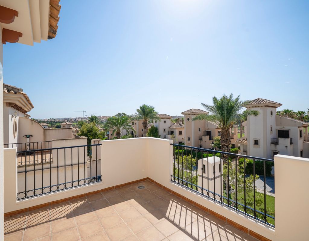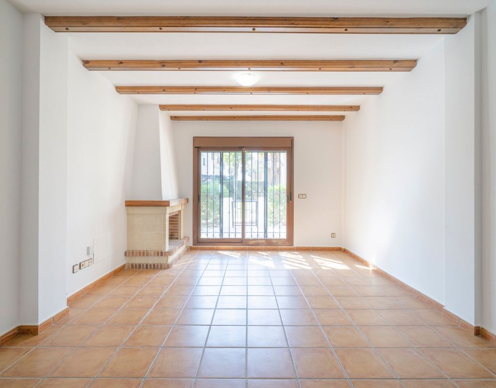 Terraced Bungalow in the "Paradise Golf" Residential Complex This charming terraced bungalow is located in the exclusive "Paradise Golf" complex and is ready to move into. The property features a front garden with parking space and a cozy rear porch with a barbecue, offering direct access to the living room. On the ground floor, you'll find a spacious living room with a fireplace, an independent kitchen with a utility room, one bedroom with a built-in wardrobe, and a bathroom with a shower. The first floor includes three bedrooms with built-in wardrobes — one with a balcony and the other with a lovely private terrace — as well as a full bathroom. On the top floor, there is a sunny solarium terrace with open views, perfect for relaxing or sunbathing. The complex offers a communal swimming pool. The bungalow has been recently painted and is in excellent condition. Sold unfurnished.