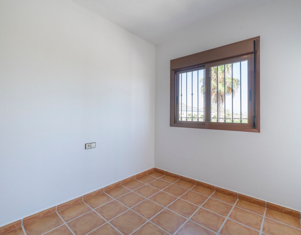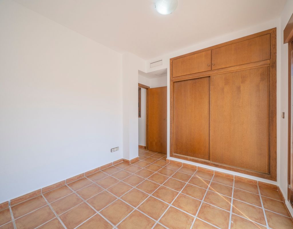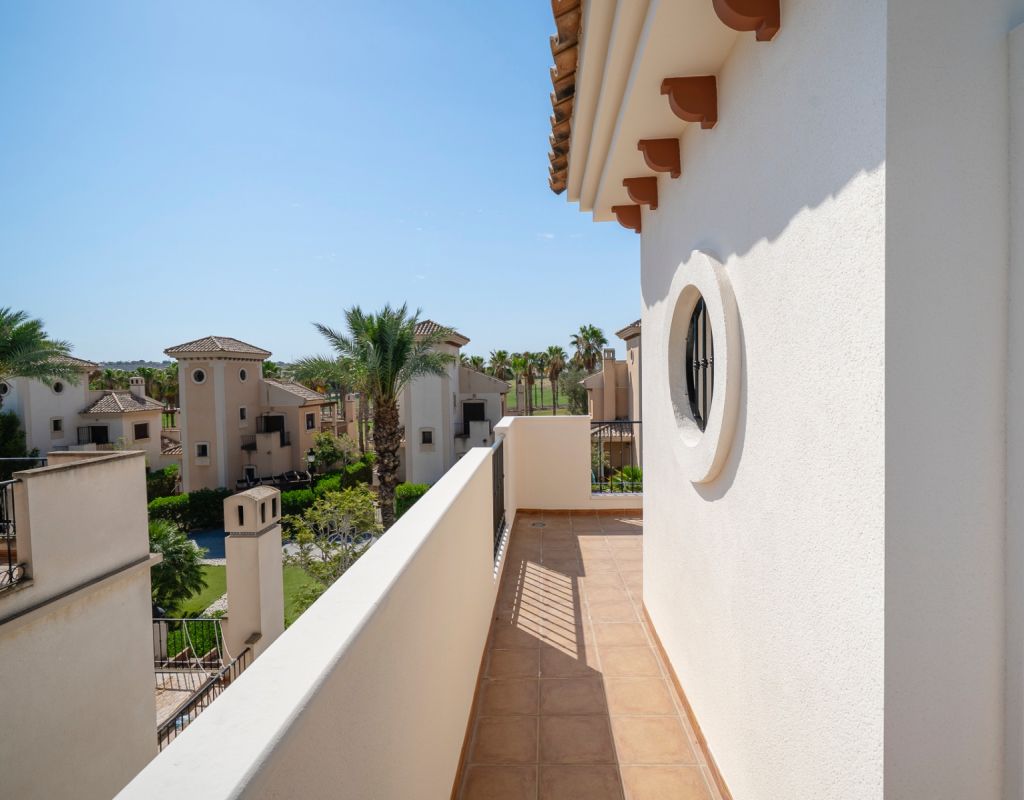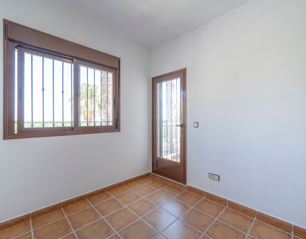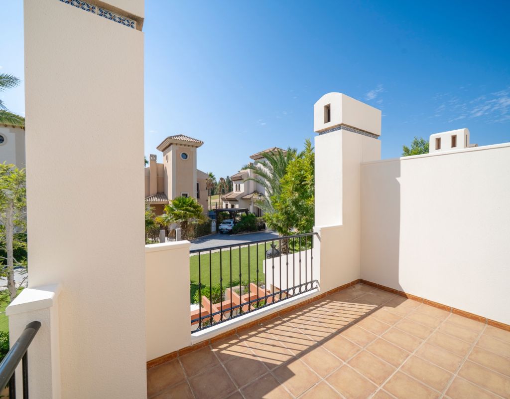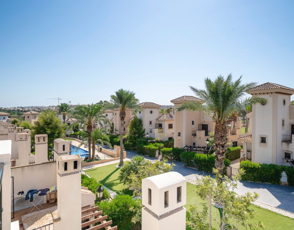 Terraced Bungalow in the "Paradise Golf" Residential Complex This charming terraced bungalow is located in the exclusive "Paradise Golf" complex and is ready to move into. The property features a front garden with parking space and a cozy rear porch with a barbecue, offering direct access to the living room. On the ground floor, you'll find a spacious living room with a fireplace, an independent kitchen with a utility room, one bedroom with a built-in wardrobe, and a bathroom with a shower. The first floor includes three bedrooms with built-in wardrobes — one with a balcony and the other with a lovely private terrace — as well as a full bathroom. On the top floor, there is a sunny solarium terrace with open views, perfect for relaxing or sunbathing. The complex offers a communal swimming pool. The bungalow has been recently painted and is in excellent condition. Sold unfurnished.