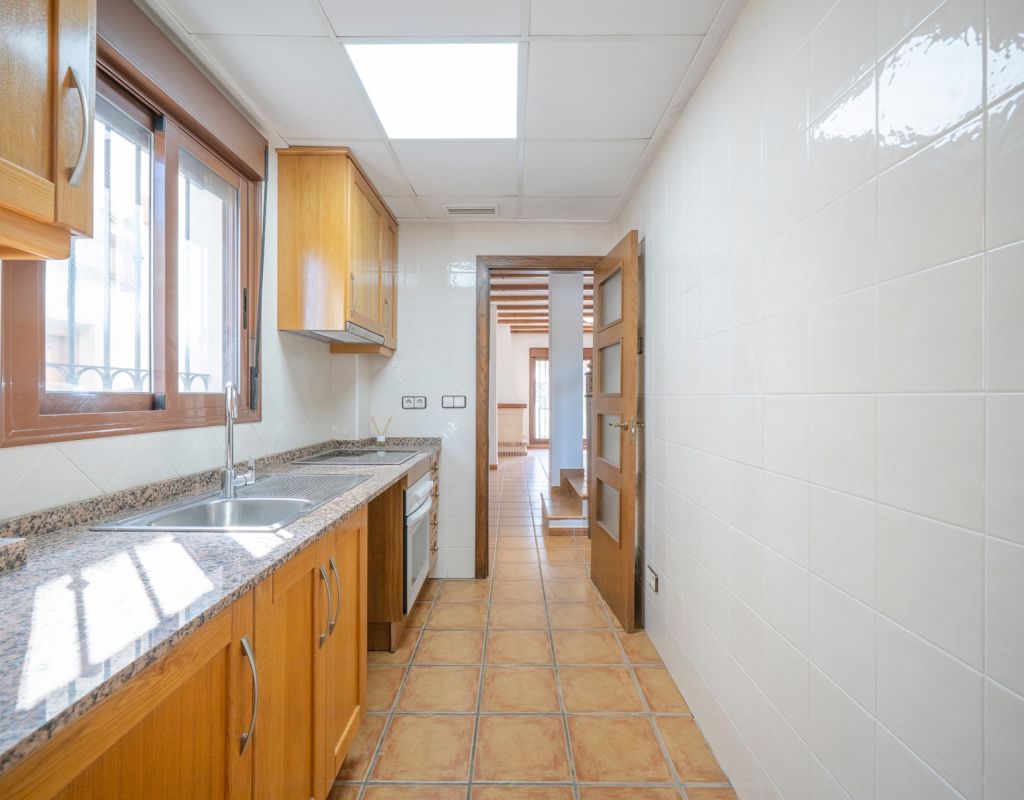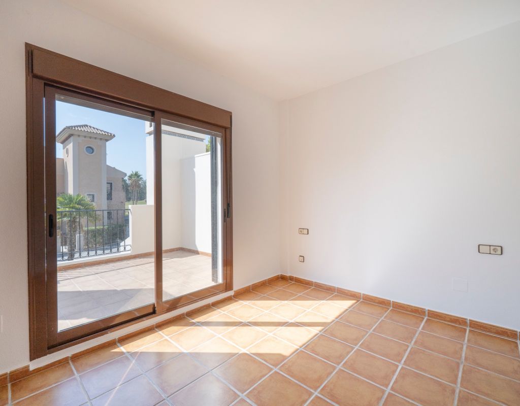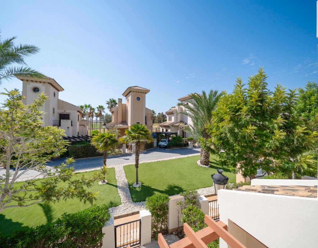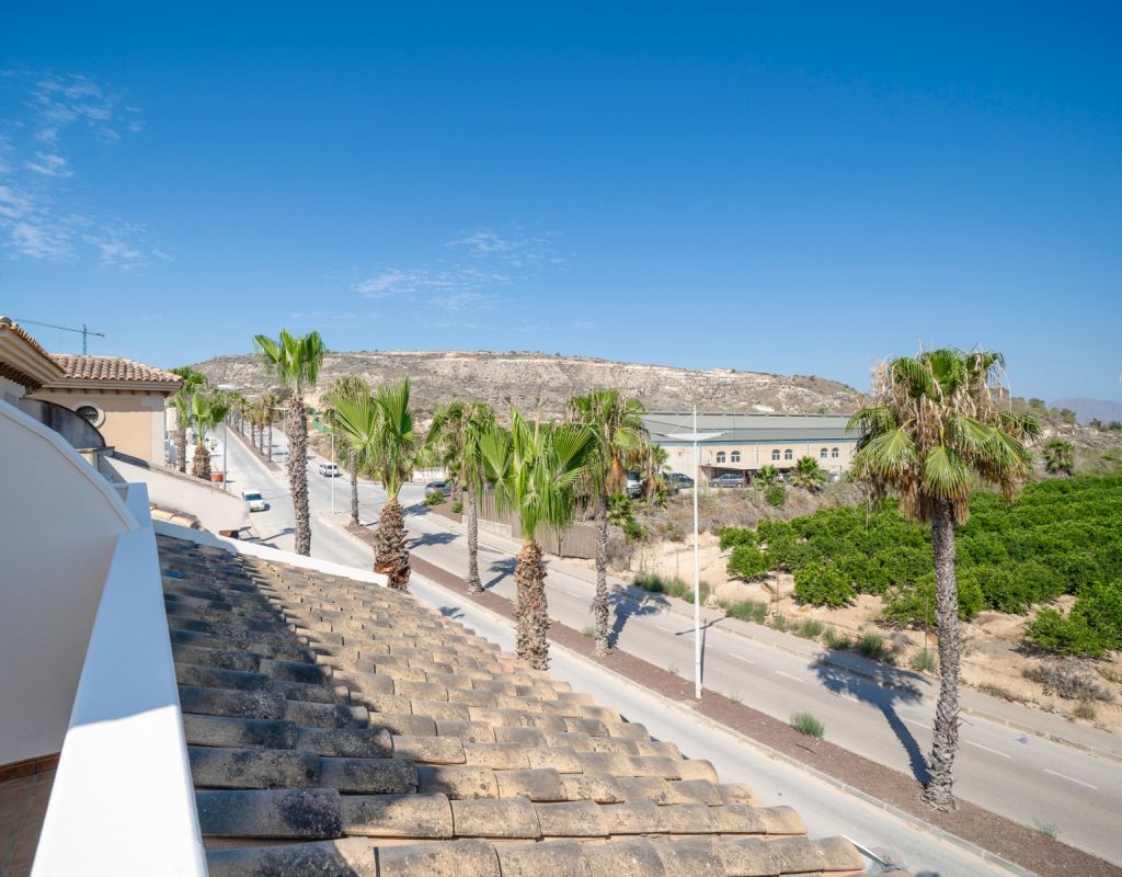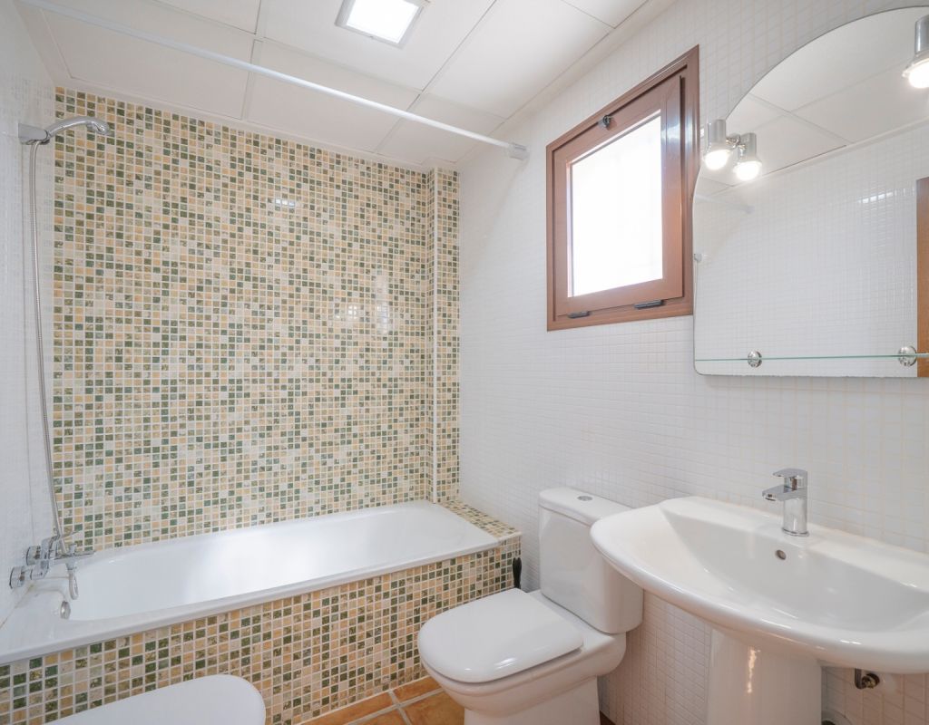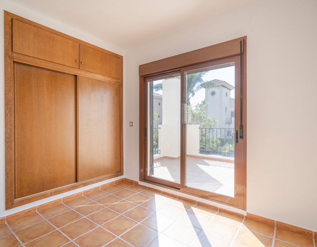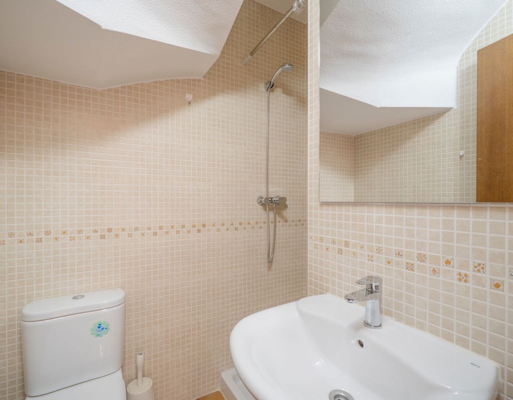 Terraced Bungalow in the "Paradise Golf" Residential Complex This charming terraced bungalow is located in the exclusive "Paradise Golf" complex and is ready to move into. The property features a front garden with parking space and a cozy rear porch with a barbecue, offering direct access to the living room. On the ground floor, you'll find a spacious living room with a fireplace, an independent kitchen with a utility room, one bedroom with a built-in wardrobe, and a bathroom with a shower. The first floor includes three bedrooms with built-in wardrobes — one with a balcony and the other with a lovely private terrace — as well as a full bathroom. On the top floor, there is a sunny solarium terrace with open views, perfect for relaxing or sunbathing. The complex offers a communal swimming pool. The bungalow has been recently painted and is in excellent condition. Sold unfurnished.