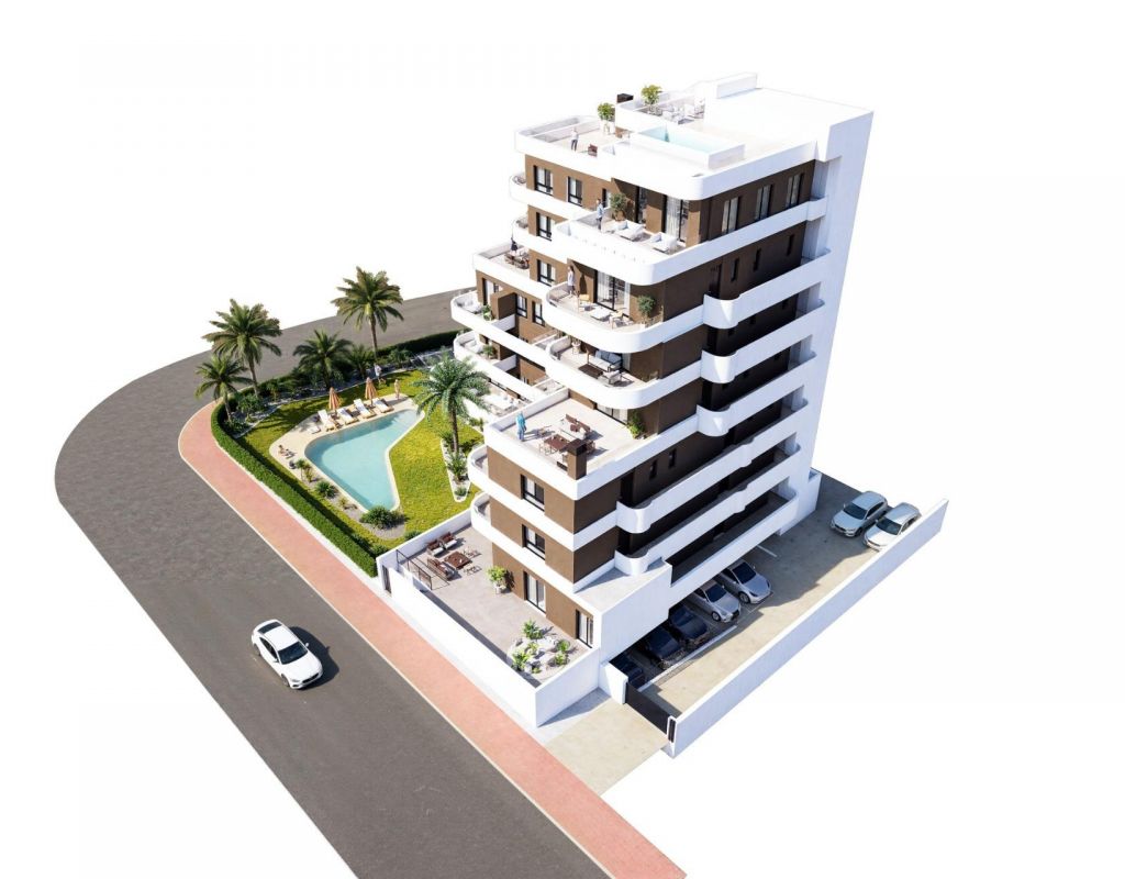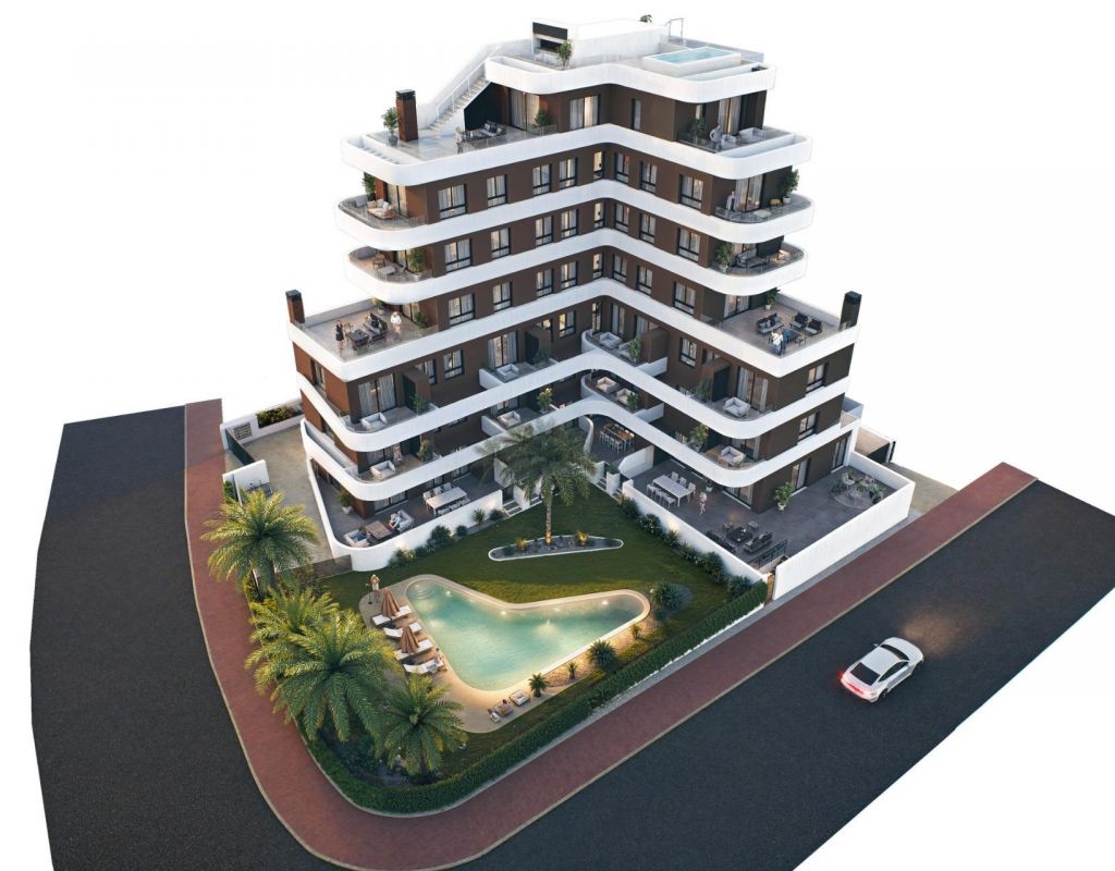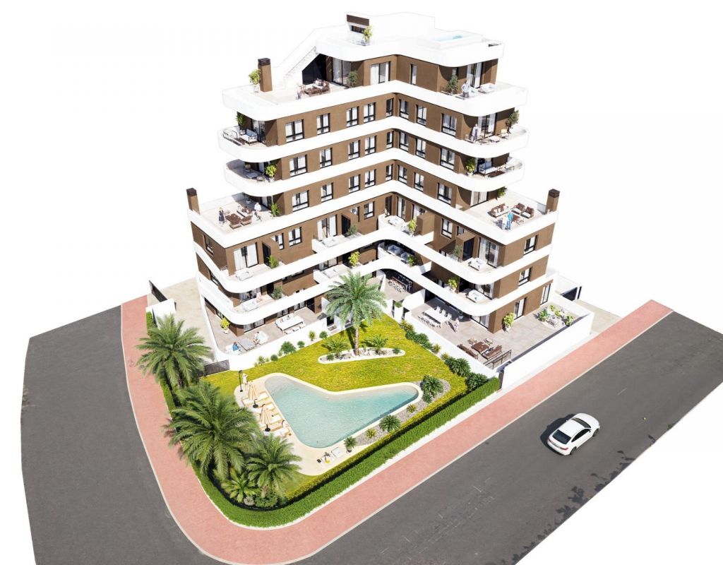 New Build Apartments in Guardamar del Segura € Modern Living Just 1.4 km from the Beach Discover a new residential development in Guardamar del Segura, Alicante, offering just 19 exclusive, modern homes designed for comfortable, contemporary living on the Costa Blanca. Ideally located just 1.4 km from the beach and a short walk from the town center, this development combines style, practicality, and a prime coastal setting. Exclusive Residential Project with Limited Availability This boutique development features 2 and 3-bedroom apartments with a range of layouts to suit different needs: Ground-floor units with spacious private terraces Mid-level apartments with generous balconies or open terraces. A spectacular penthouse with a private solarium and swimming pool Each property showcases elegant, curved architectural lines, glass railings, and modern finishes€ideal for both year-round residence or a luxurious holiday retreat. Premium Finishes and Energy-Efficient Features Designed for comfort and sustainability, each home includes: Reinforced front door for added security Fully furnished kitchen with appliances included Energy-efficient aerothermal system for hot water Private parking space included in the price The building also features a communal swimming pool and landscaped garden areas, perfect for enjoying the sunny Mediterranean climate. Prime Location in Guardamar del Segura Situated in a well-connected and vibrant part of Guardamar, this development provides easy access to nature, beaches, and essential services. Residents enjoy proximity to supermarkets, restaurants, medical centers, parks, and the town€s famous pine forest and dunes. Key distances: Guardamar town center € 1 km Closest beach € 1.4 km Marina € 2 km Reina Sofía Park € 1.5 km La Marquesa Golf (Ciudad Quesada) € 9 km Habaneras Shopping Center (Torrevieja) € 13 km Alicante-Elche Airport € 33 km Public transport connections include direct bus lines to Alicante and Torrevieja, offering easy access without the need for a car. Secure Your Apartment on the Costa Blanca Whether you€re looking for a permanent residence, vacation property, or smart investment, this new development in Guardamar del Segura is the perfect choice. Contact us today to learn more or reserve your new home by the sea.