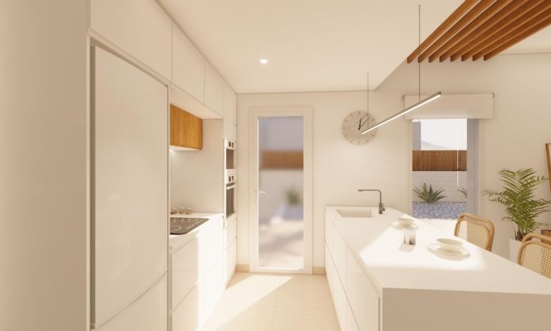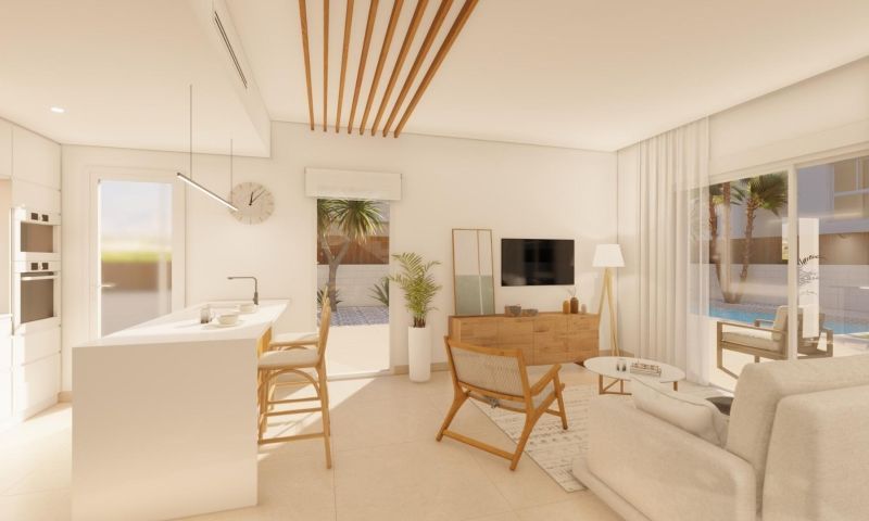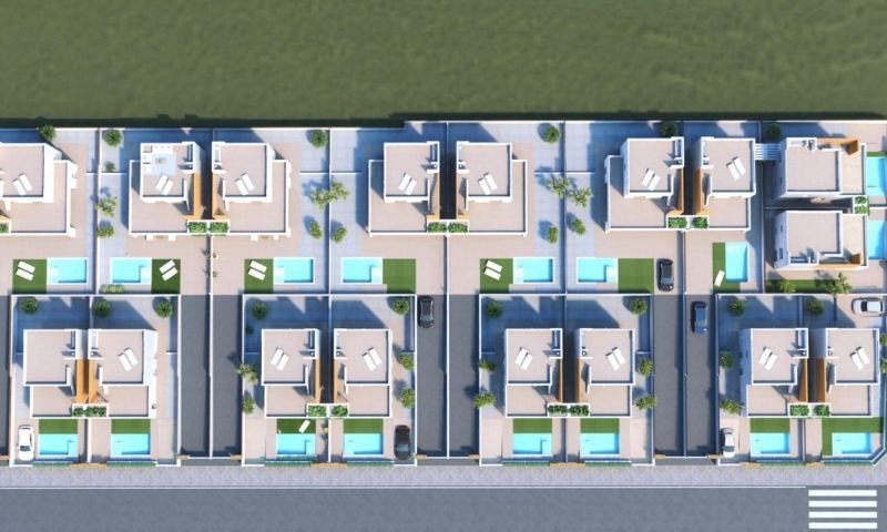 NEW BUILD VILLAS IN PILAR DE LA HORADADA New Build villas in Pilar de la Horadada. The interior of the villas consist of 3 bedrooms, 3 bathrooms en suite, large open plan living room with kitchen all located on two floors. The exteriors have a large landscaped garden with private swimming pool and parking space. New Build Villas where you will find the best Mediterranean style adapted to modern design. Residential consists of 17 villas located in Pilar de la Horadada, surrounded by all the services you need and just a few minutes from the beach. Pilar de la Horadada is a typical Spanish village in the most southern part of the Costa Blanca. The large main street has supermarkets, lots of shops, restaurants and bars and some lovely squares. The beautiful beaches of Torre de la Horadada and Mil Palmeras with fine sand promenade is just 5 minutes away. In Pilar de la Horadada there is also a well-developed cycling and walking path network, and there is also a large offer of various sports activities. Lo Romero 18 hole golf course is just a short drive from town. The airports of Corvera (Murcia) and Alicante are respectively 40 and 55 minutes away.