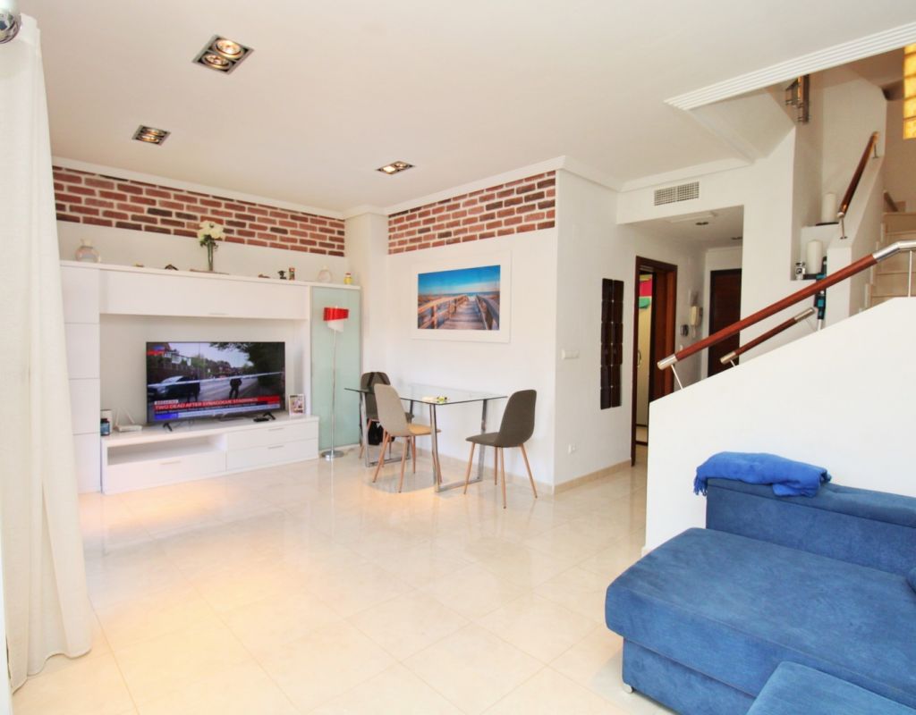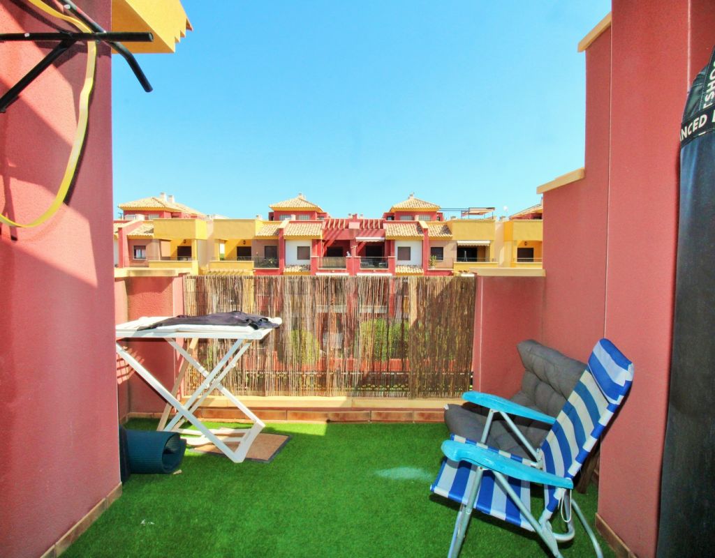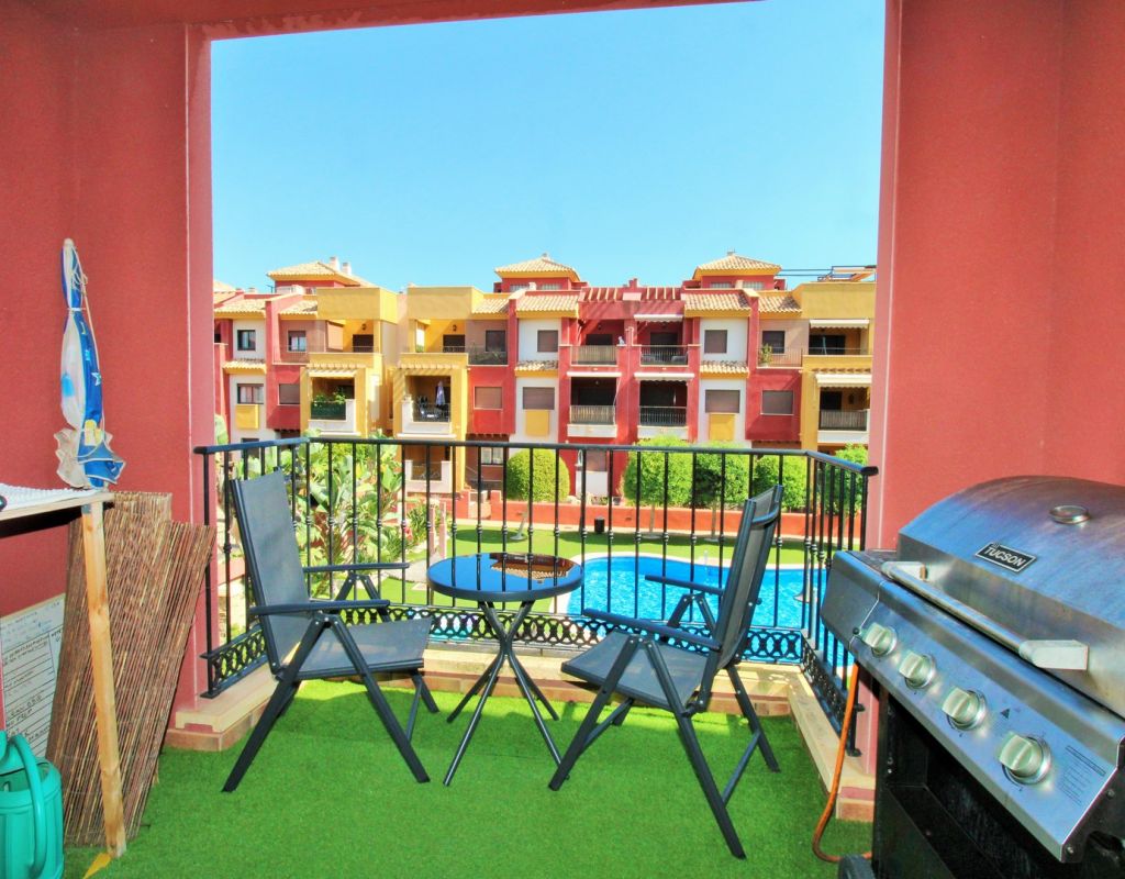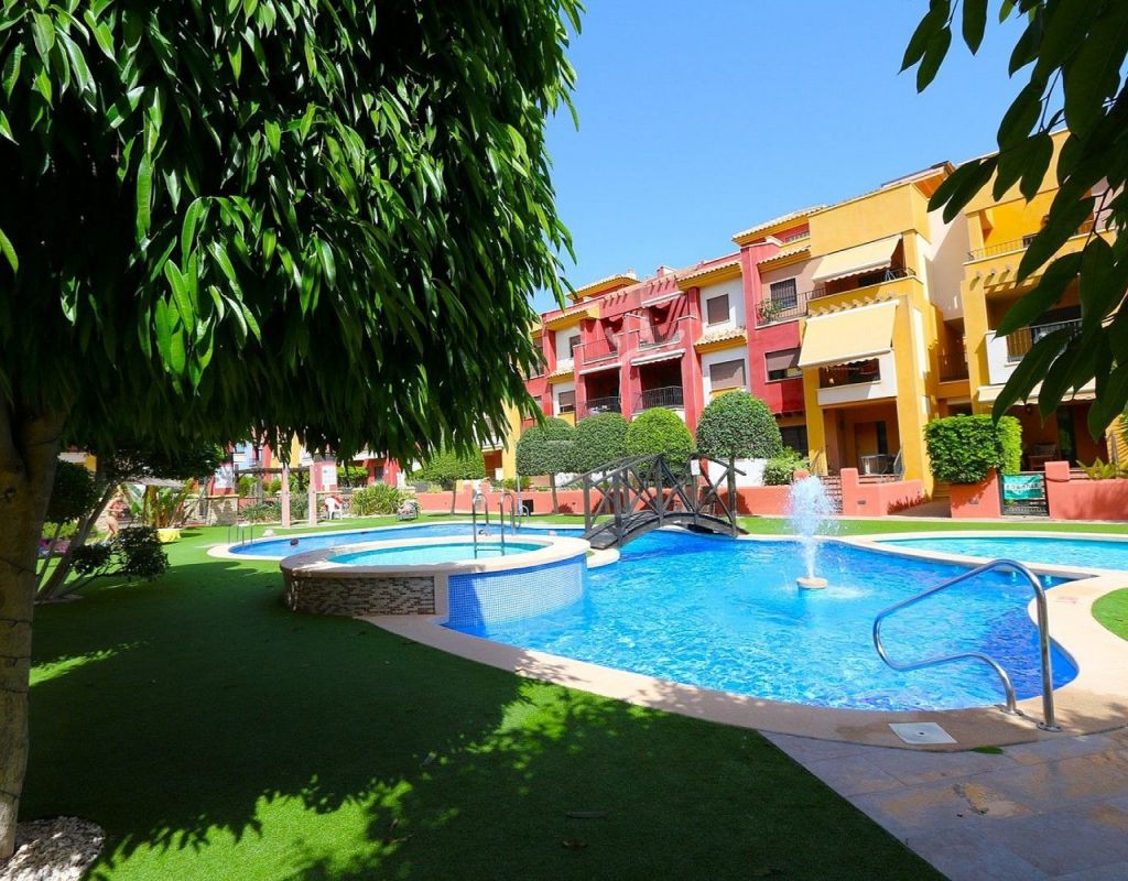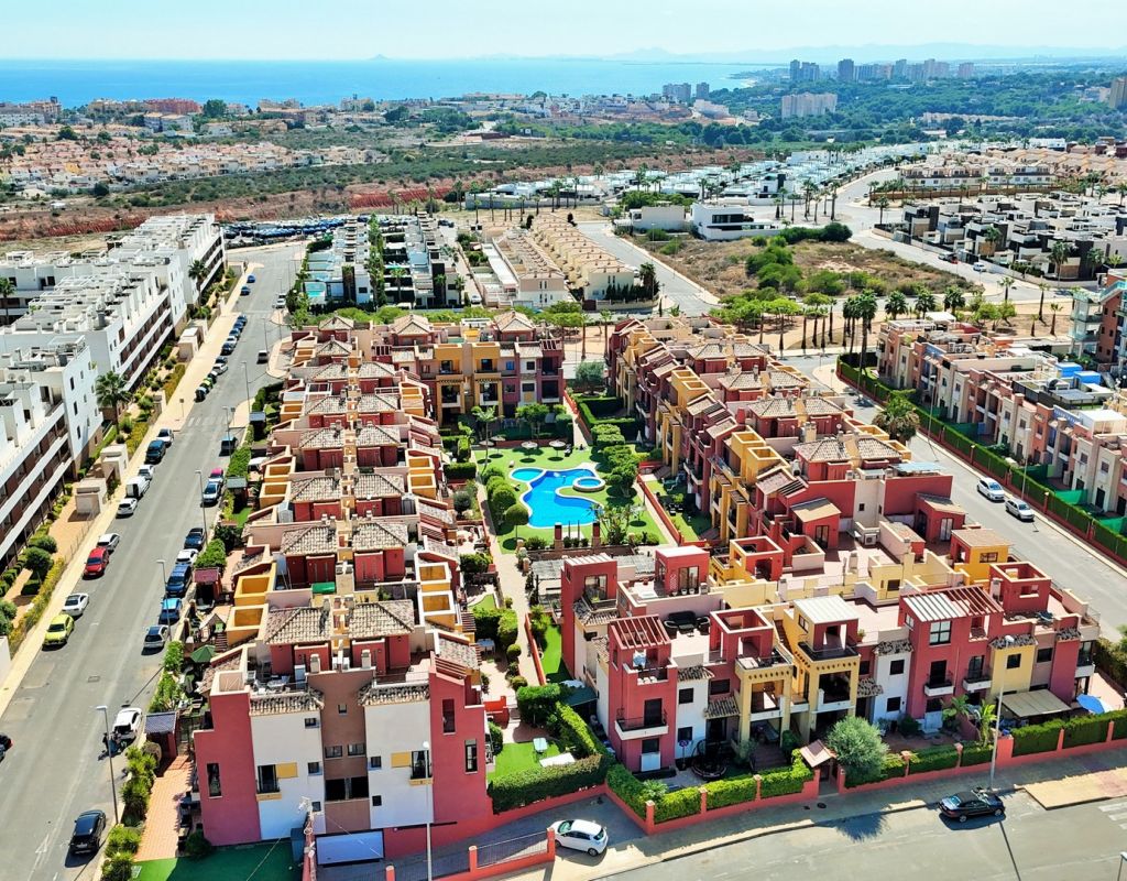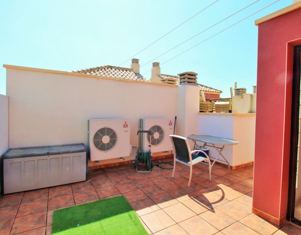 This well-presented duplex apartment is located within the prestigious Royal Park Spa development in Lomas de Cabo Roig, one of the most sought-after residential areas on the Orihuela Costa. Set within a secure gated community, the property enjoys attractive views over the communal pool and landscaped gardens and benefits from access to exclusive on-site spa facilities. The apartment offers two bedrooms and 1.5 bathrooms and includes an underground parking space in the price. Residents of Royal Park Spa enjoy use of a luxury wellness area, featuring an indoor heated swimming pool, gym, sauna, and steam room, making it ideal for year-round living or holidays. On the ground floor, the property comprises an entrance hallway, a spacious lounge-dining area with access to a covered balcony overlooking the pool, a separate fully fitted kitchen with adjoining utility room, and a guest toilet. Upstairs, there are two double bedrooms sharing a generous family bathroom with bath and shower. The master bedroom features its own private terrace with open views across the gardens. Internal stairs lead up to a large private roof solarium, complete with a built-in BBQ area, providing an excellent space for outdoor dining, sunbathing, and entertaining. Ideally situated within walking distance of bars, restaurants, and a supermarket, this property offers an excellent combination of comfort, leisure facilities, and convenient location in one of the area’s most desirable residential complexes.