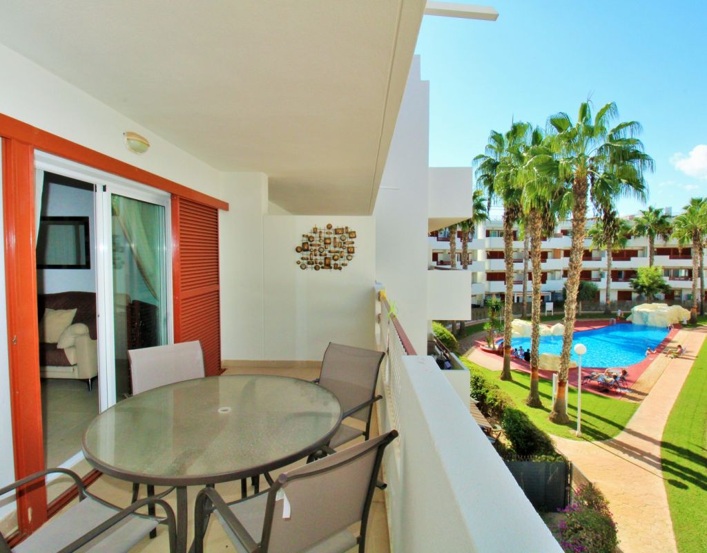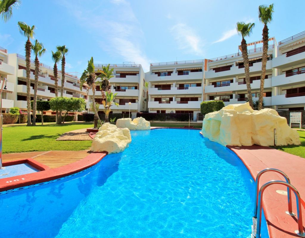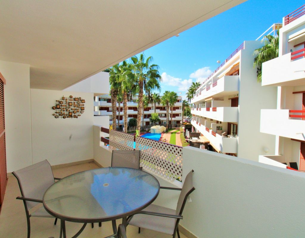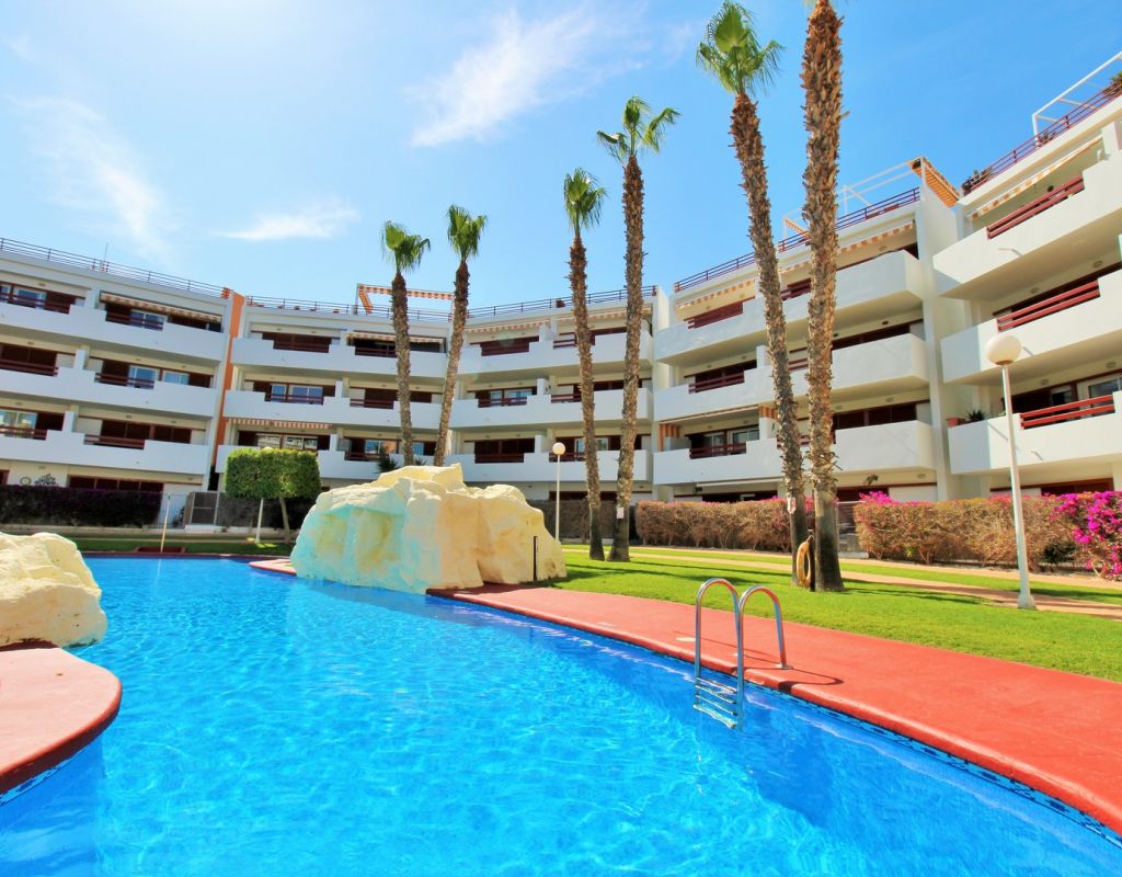 This beautifully presented 2-bedroom, 2-bathroom second-floor apartment (with lift access) is located in the highly sought-after El Rincon complex in Playa Flamenca. Ideally positioned overlooking the communal pool and gardens, the property enjoys a bright aspect and plenty of natural light thanks to its corner position with no adjoining block. The interior comprises an open lounge and dining area with patio doors leading to a private balcony offering attractive pool and garden views, an open-plan kitchen, and two double bedrooms each with fitted wardrobes and en-suite bathrooms featuring underfloor heating. The apartment also benefits from a utility/storage room, ducted air-conditioning throughout, and secure underground parking. Recent upgrades include new flooring and contemporary bathroom vanity units, while the entire community has recently been repainted, ensuring a fresh and well-maintained appearance. Residents enjoy access to two pristine communal swimming pools surrounded by lush gardens, creating a peaceful and inviting atmosphere. Perfectly situated, the apartment is just a short stroll from three supermarkets, the Playa Flamenca and Citrus commercial centres, offering a fantastic choice of bars, restaurants, and shops. The Playa Flamenca beach and Zenia Boulevard shopping mall are only a few minutes’ drive away. Whether you’re looking for a holiday retreat, permanent residence, or rental investment, this apartment offers excellent value in one of the Costa Blanca’s most desirable coastal locations. Don’t miss this opportunity!