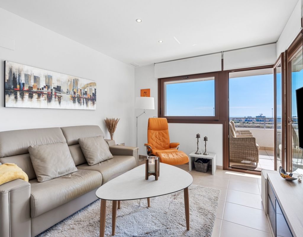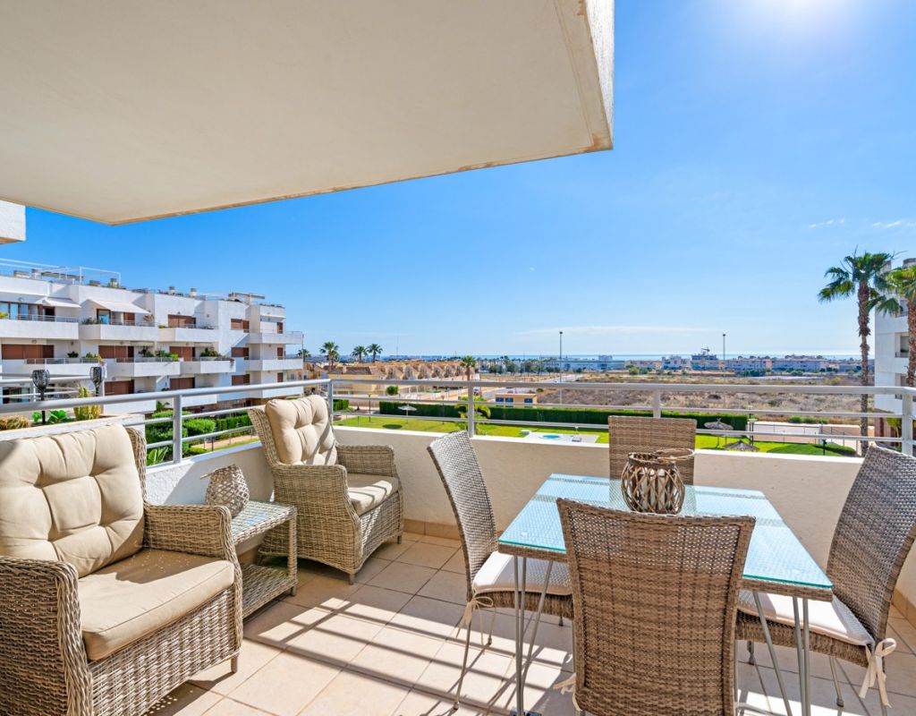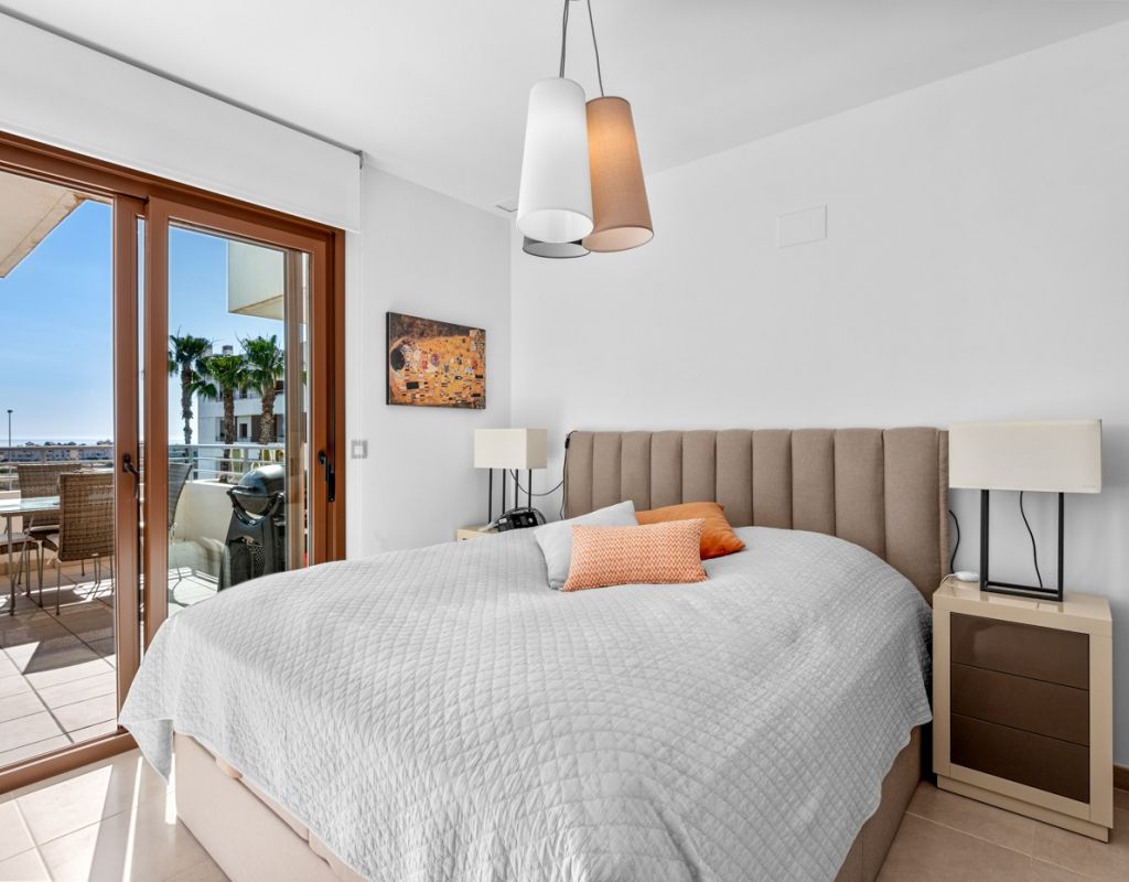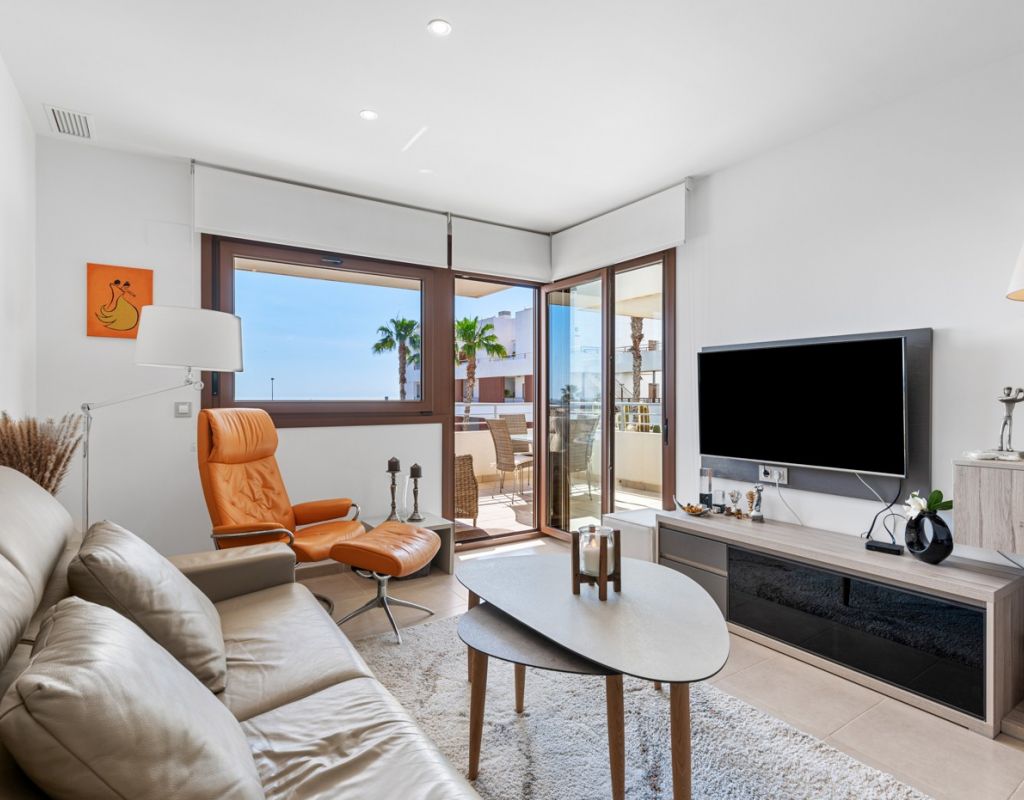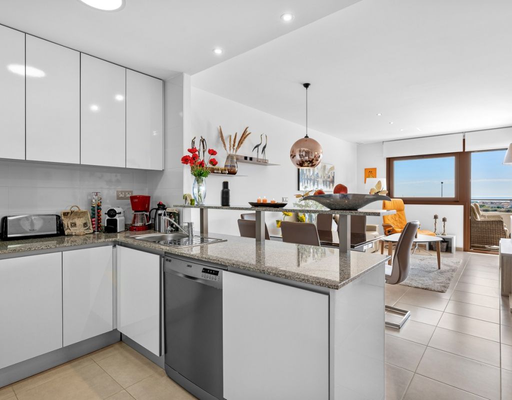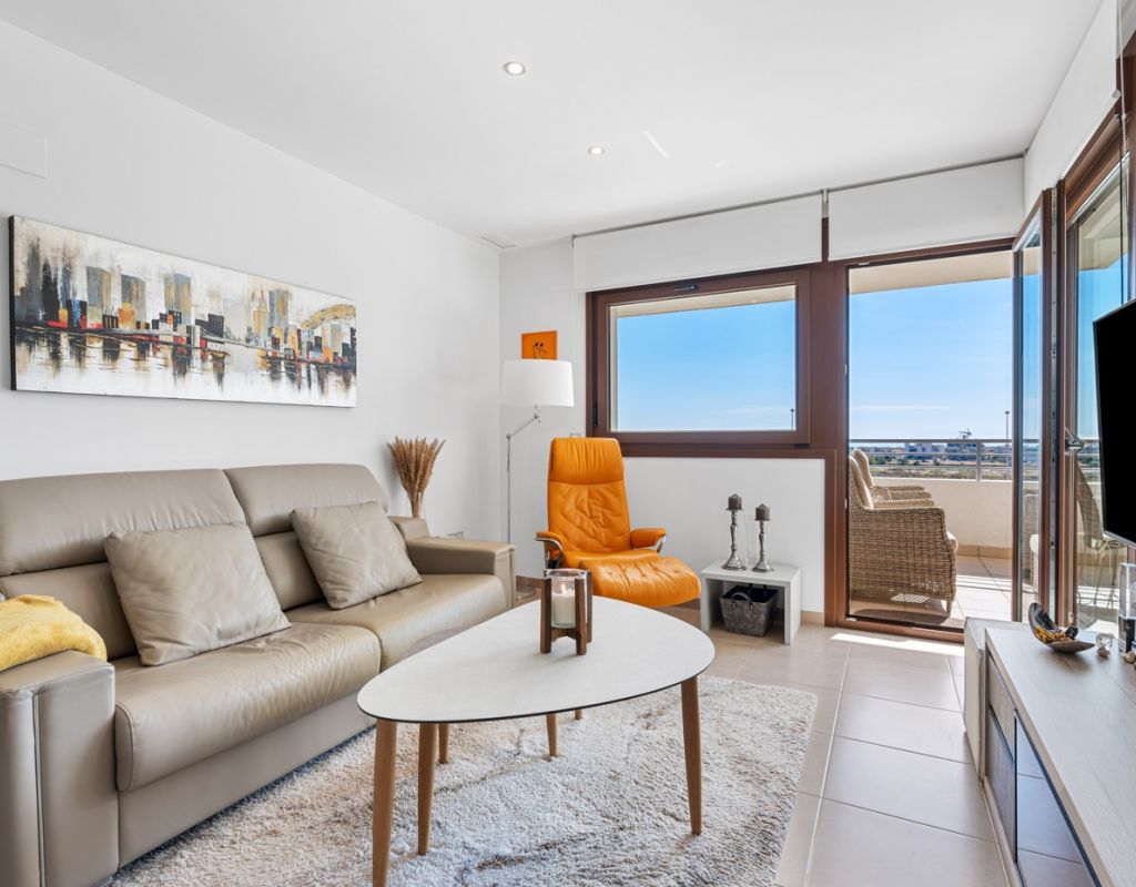 Bright and spacious apartment with sea views – close to La Zenia Boulevard. Lomas de Cabo Roig. Terrazas de Campoamor. This is a beautiful modern apartment with high ceilings and large windows that let in plenty of natural light. Here you will get a fantastic sea view and a warm atmosphere. The apartment has 2 bedrooms, 2 bathrooms, a storage room, an enclosed utility room, and a good-sized kitchen. The apartment offers: - Bright and airy living room with large windows and an open plan layout - Bedrooms with plenty of space and natural light - Under-bed storage - Cabinet for practical storage - Private, indoor parking - Gated community - Walking distance to restaurantes and grocery store Short walk to La Zenia Boulevard – one of the Costa Blanca’s largest shopping centres with over 150 shops, restaurants, a pharmacy and a bowling alley. Not far from the apartment are both Las Ramblas Golf and Las Colinas Golf & Country Club which are two outstanding golf courses located in Orihuela Costa, Alicante. This is a rare opportunity to live in an apartment that combines comfort, views and a prime location.