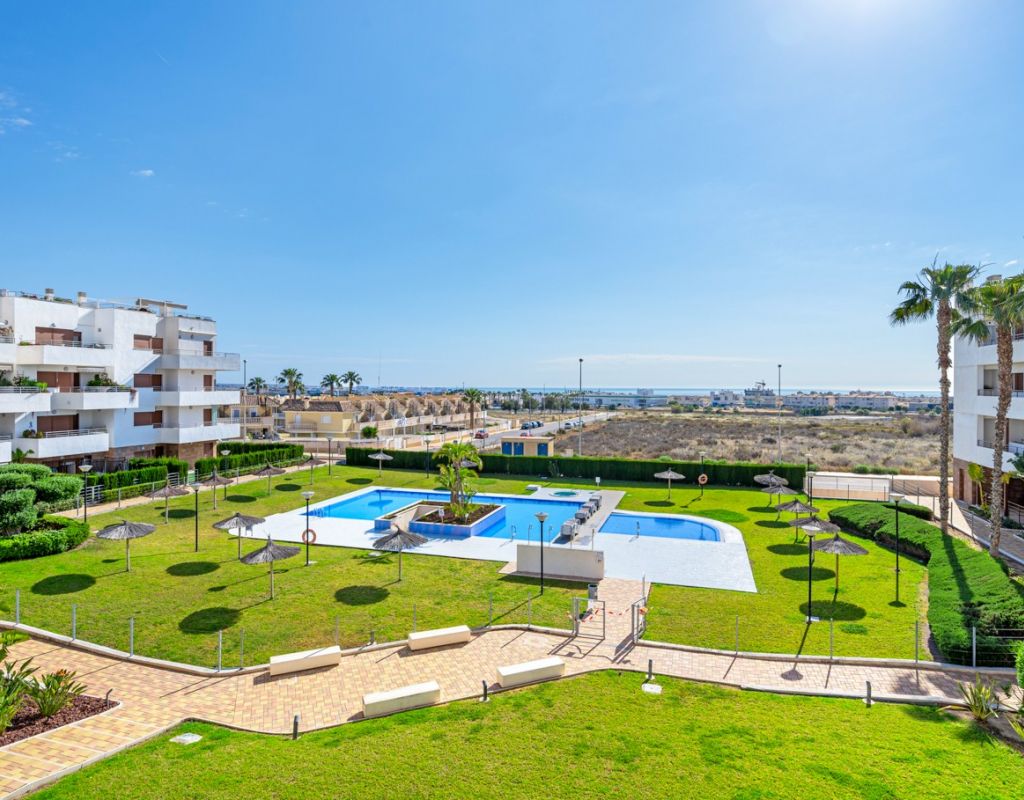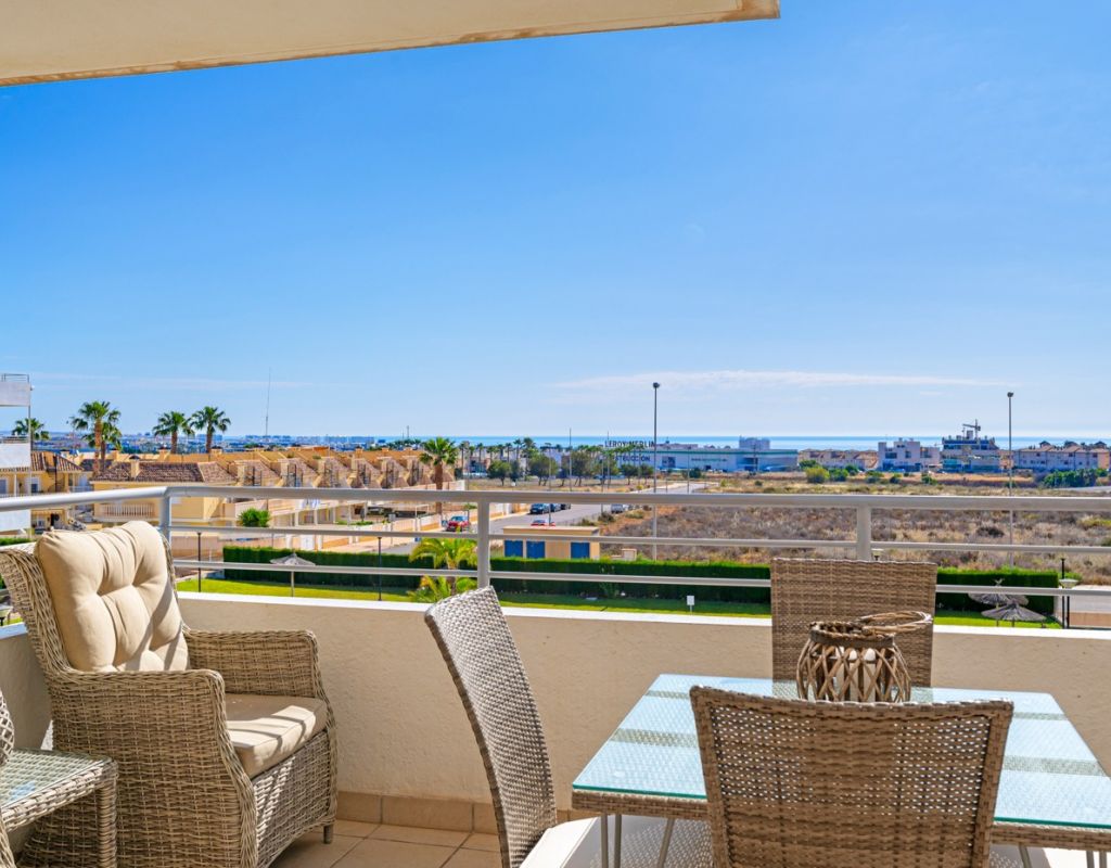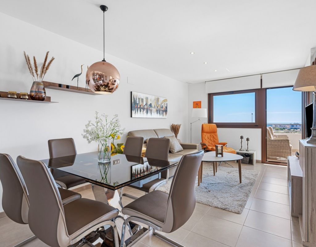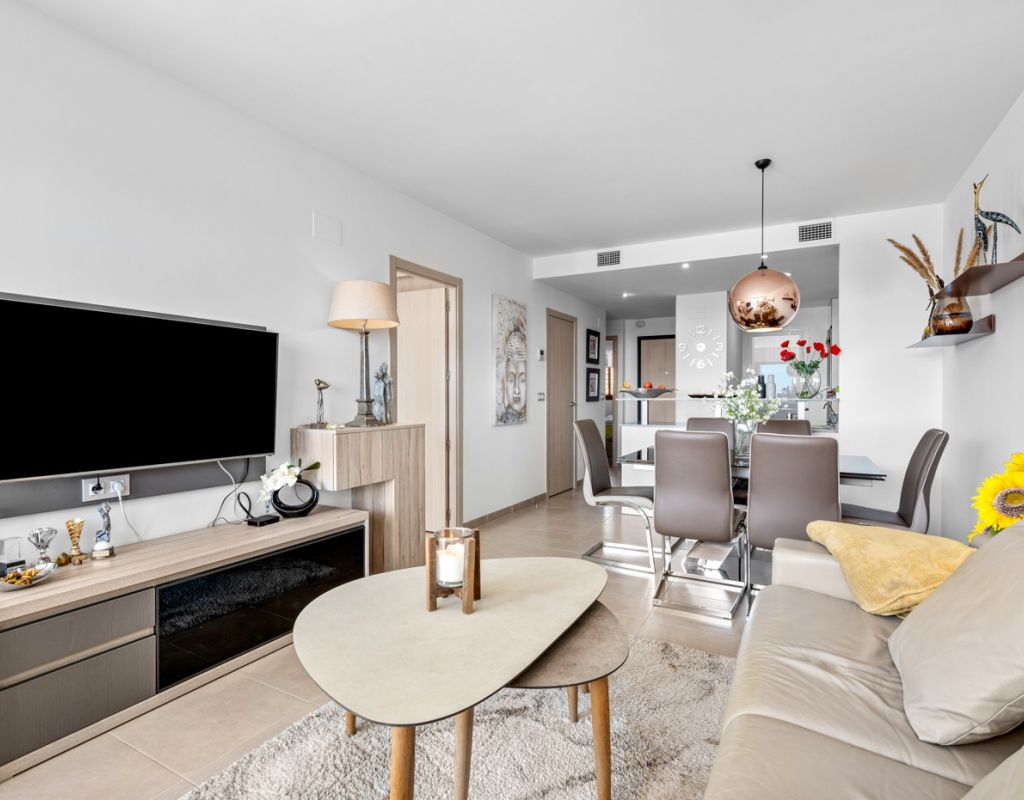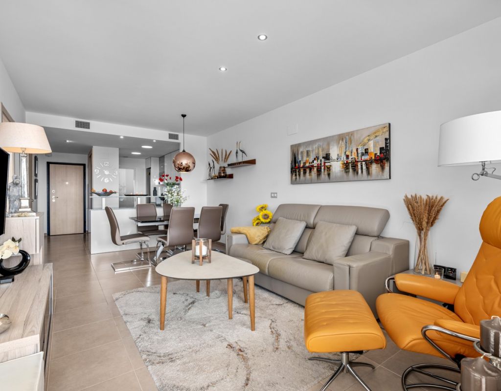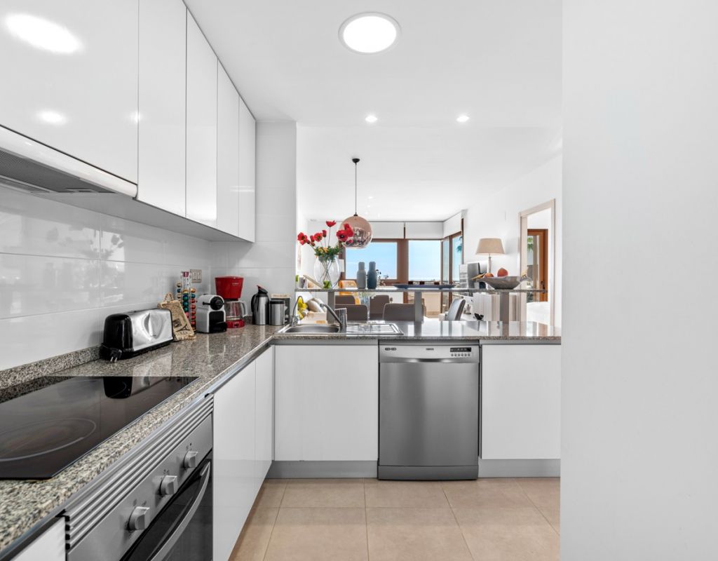 Bright and spacious apartment with sea views – close to La Zenia Boulevard. Lomas de Cabo Roig. Terrazas de Campoamor. This is a beautiful modern apartment with high ceilings and large windows that let in plenty of natural light. Here you will get a fantastic sea view and a warm atmosphere. The apartment has 2 bedrooms, 2 bathrooms, a storage room, an enclosed utility room, and a good-sized kitchen. The apartment offers: - Bright and airy living room with large windows and an open plan layout - Bedrooms with plenty of space and natural light - Under-bed storage - Cabinet for practical storage - Private, indoor parking - Gated community - Walking distance to restaurantes and grocery store Short walk to La Zenia Boulevard – one of the Costa Blanca’s largest shopping centres with over 150 shops, restaurants, a pharmacy and a bowling alley. Not far from the apartment are both Las Ramblas Golf and Las Colinas Golf & Country Club which are two outstanding golf courses located in Orihuela Costa, Alicante. This is a rare opportunity to live in an apartment that combines comfort, views and a prime location.