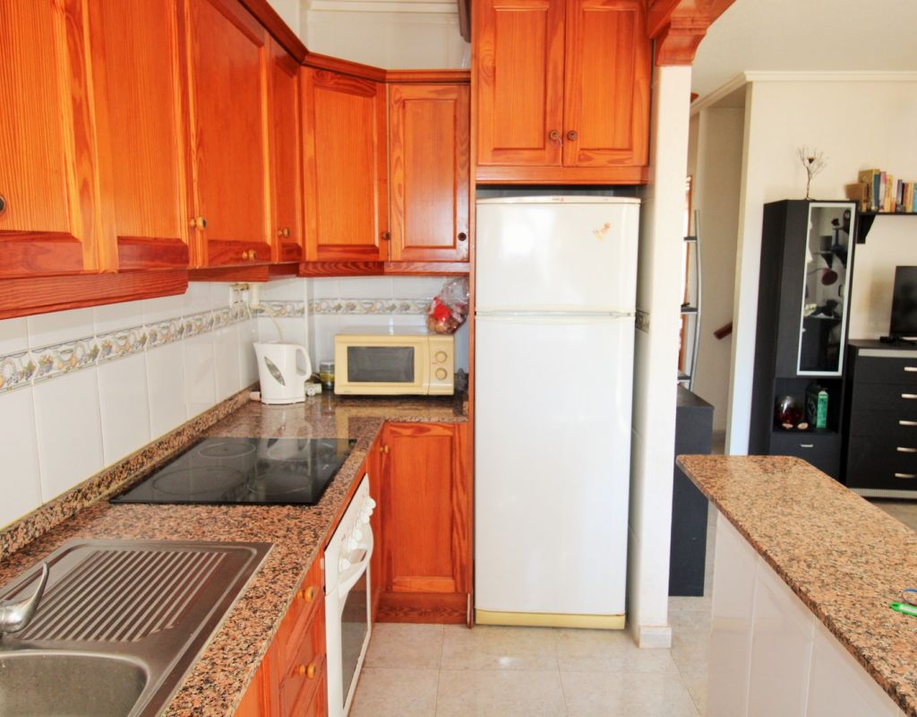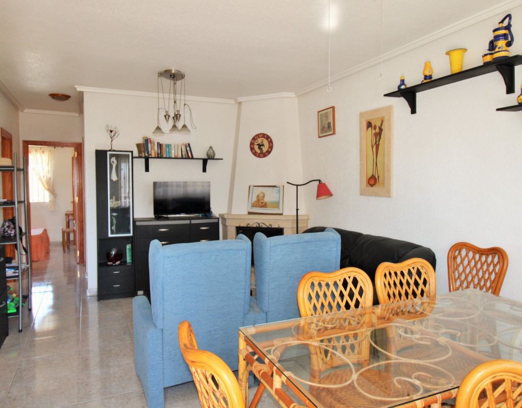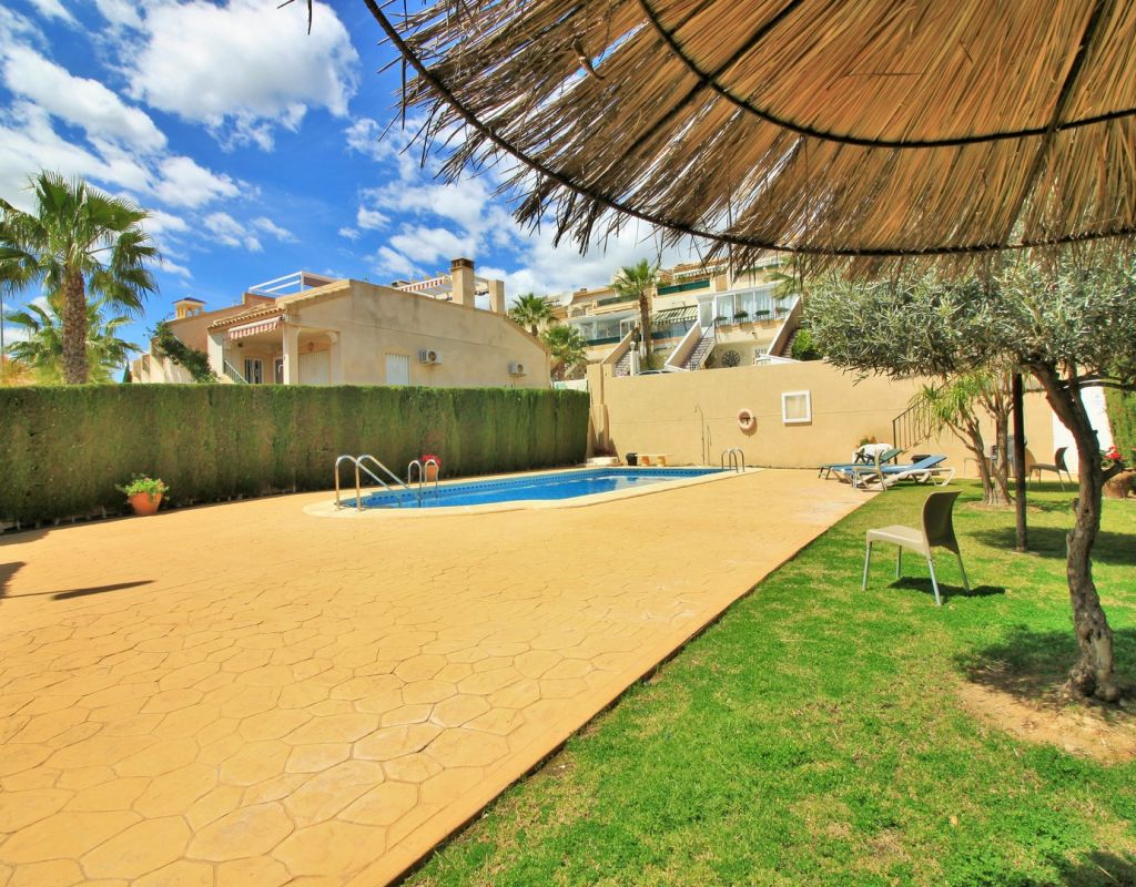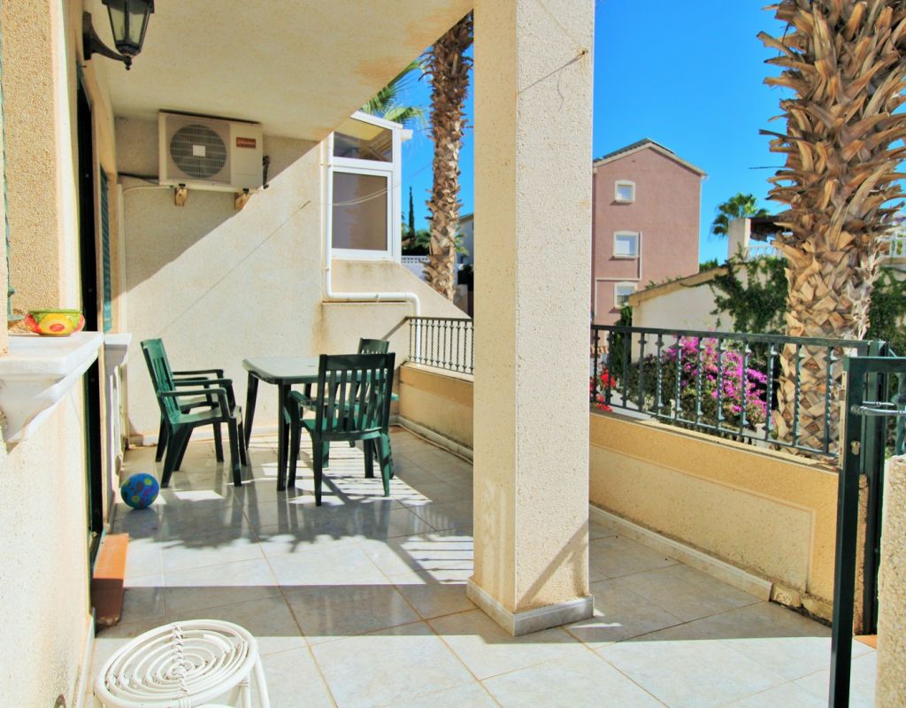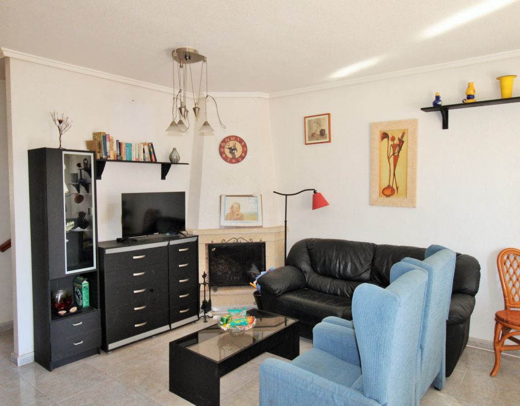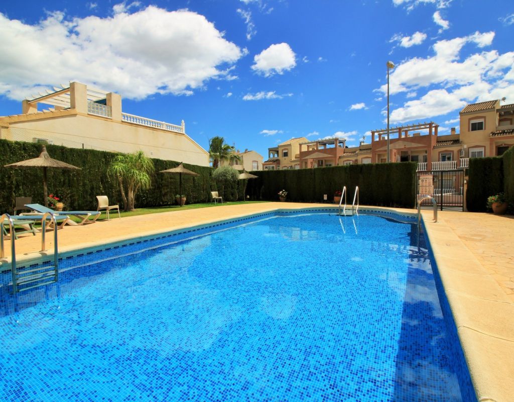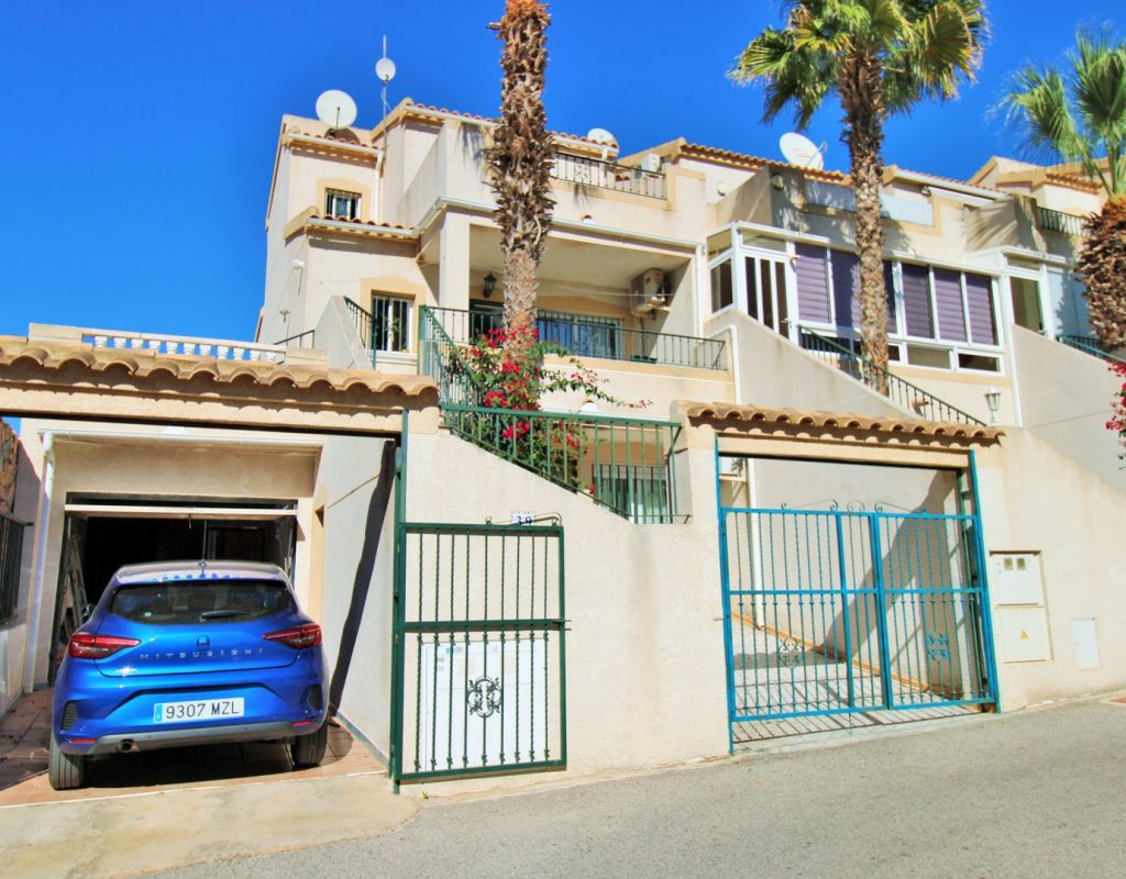 Substantial semi-detached townhouse with a large underbuild in the sought-after community of Montegolf VI in Villamartin. The property offers 3 bedrooms and 2 bathrooms in the main living accommodation, with additional flexible living space in the underbuild. Externally, the home benefits from a private rear garden, off-road parking, a front terrace, and a roof solarium. Residents also enjoy the use of a beautiful communal pool within the development. The main level features a raised front terrace leading into a bright living and dining area with feature fireplace, a fitted kitchen to the side, two double bedrooms, and a family bathroom. The upper floor offers the master bedroom with its own bathroom and direct access to the roof solarium. The spacious semi-basement level provides additional accommodation, currently used as a separate apartment comprising lounge area, three bedrooms, a bathroom, and a secondary kitchen. This space is ideal for guests, extended family, hobbies, fitness studio, or home office use. Located within a short walk of the Villamartin Plaza and golf course, and just a few minutes' drive to the beaches of the Orihuela Costa and the Zenia Boulevard shopping centre, this property offers excellent versatility in a highly popular residential setting.