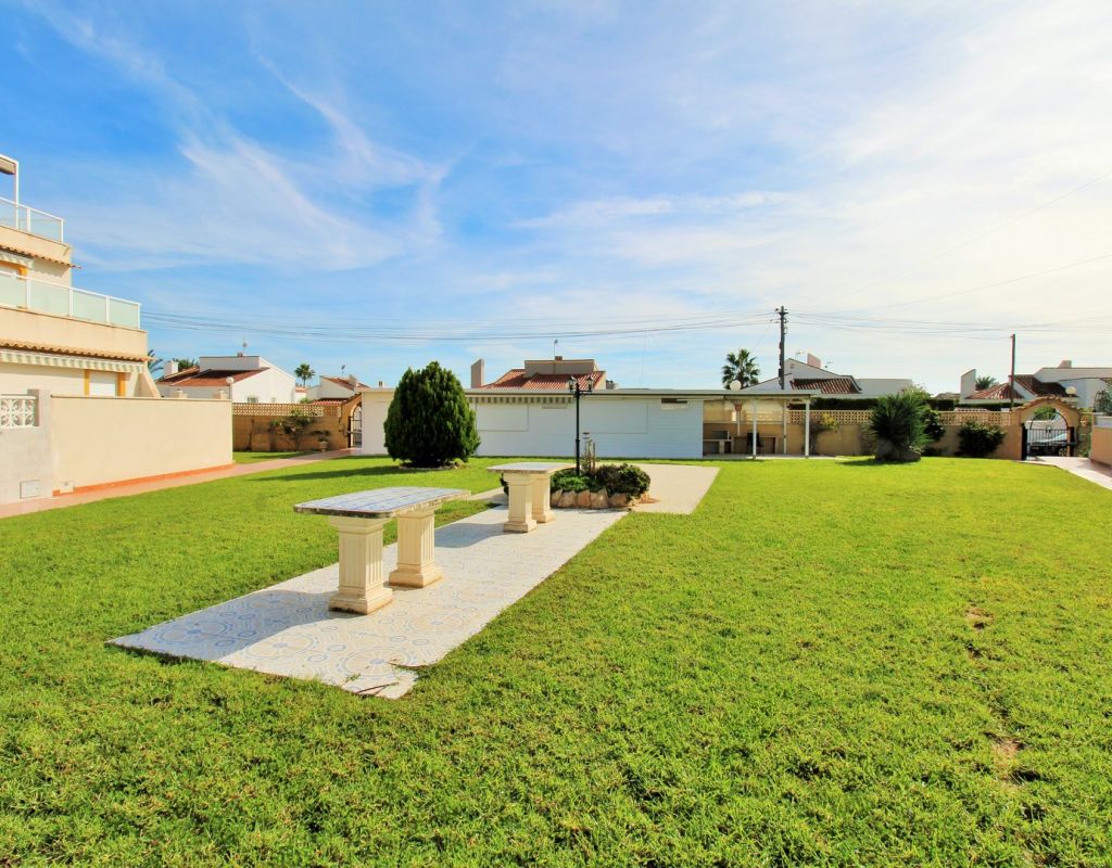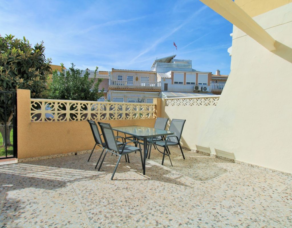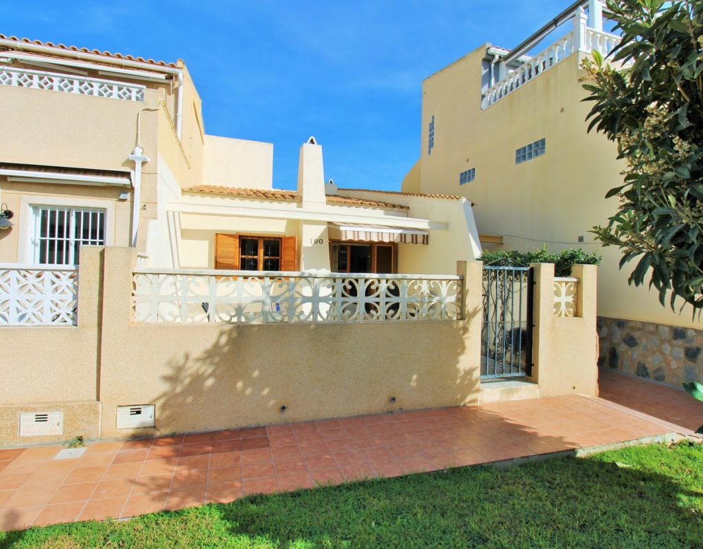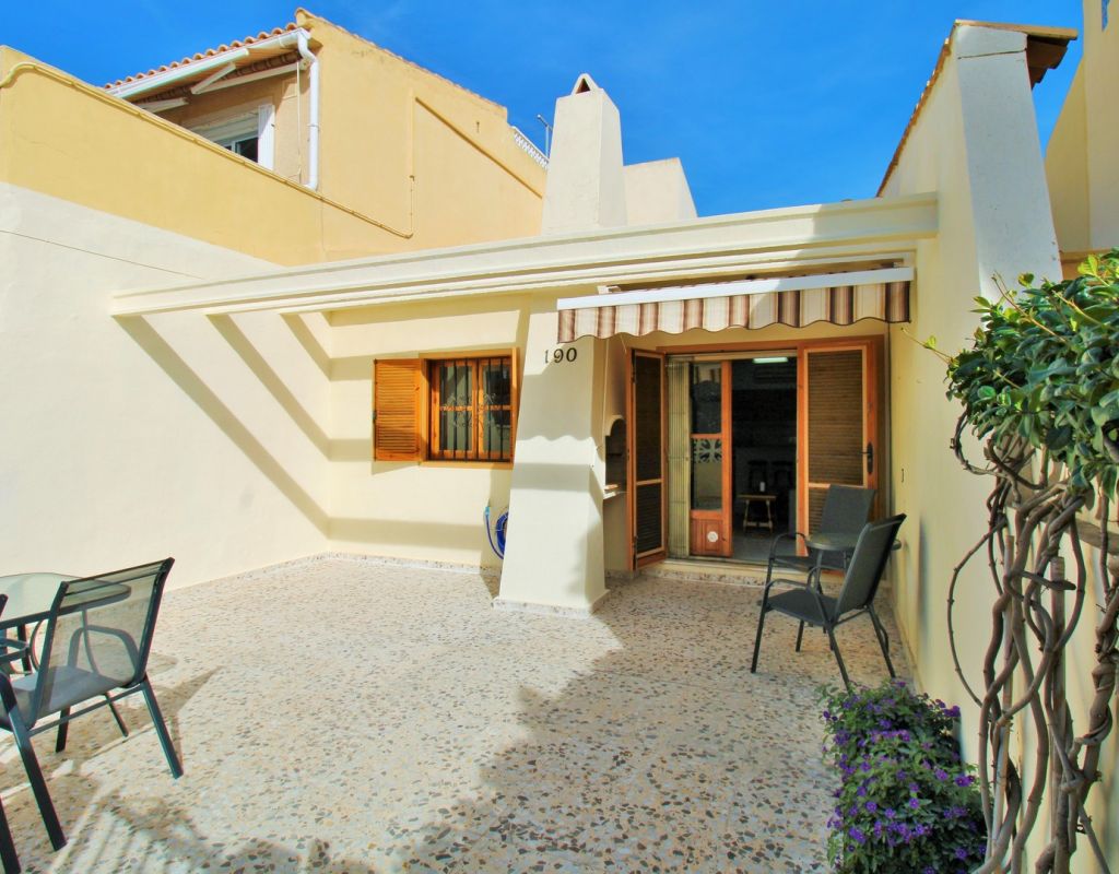 Vistacasas presents this exceptional end-of-terrace bungalow offering superb value in the gated community of Manzana 7, La Chismosa (Playa Flamenca). Enjoying a desirable south-west orientation, the home benefits from sunshine throughout the day and features a generous front terrace complete with built-in BBQ and retractable awnings—perfect for relaxing or entertaining. Residents also have access to beautifully maintained communal green areas. All living accommodation is arranged on one level, comprising a bright living room with feature fireplace, an open fully fitted kitchen to the rear with access to an exterior utility area, and a small hallway leading to a light and airy double bedroom with fitted wardrobes and a bathroom with walk-in shower. The property is offered fully furnished and includes air-conditioning. Ideally situated within walking distance of local bars and restaurants in La Chismosa and La Florida, and just a short drive from the blue-flag beaches of the Orihuela Costa, Zenia Boulevard, and several top-class golf courses. A fantastic opportunity in a sought-after location—early viewings are highly recommended!