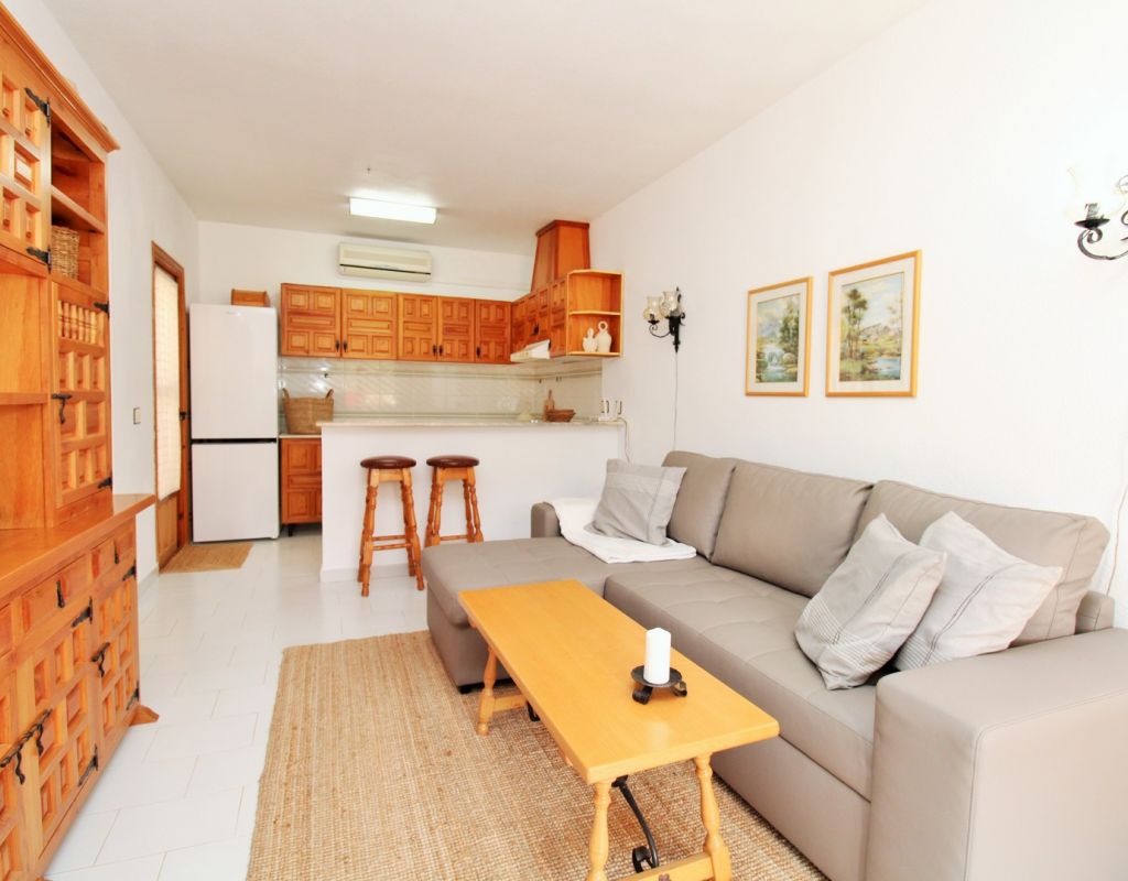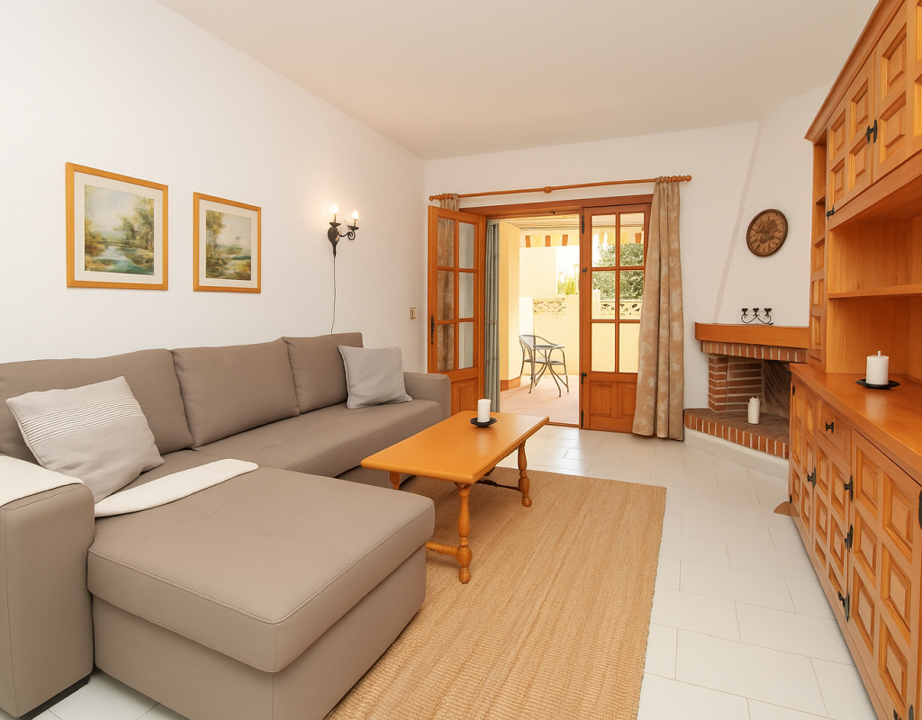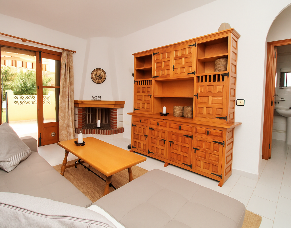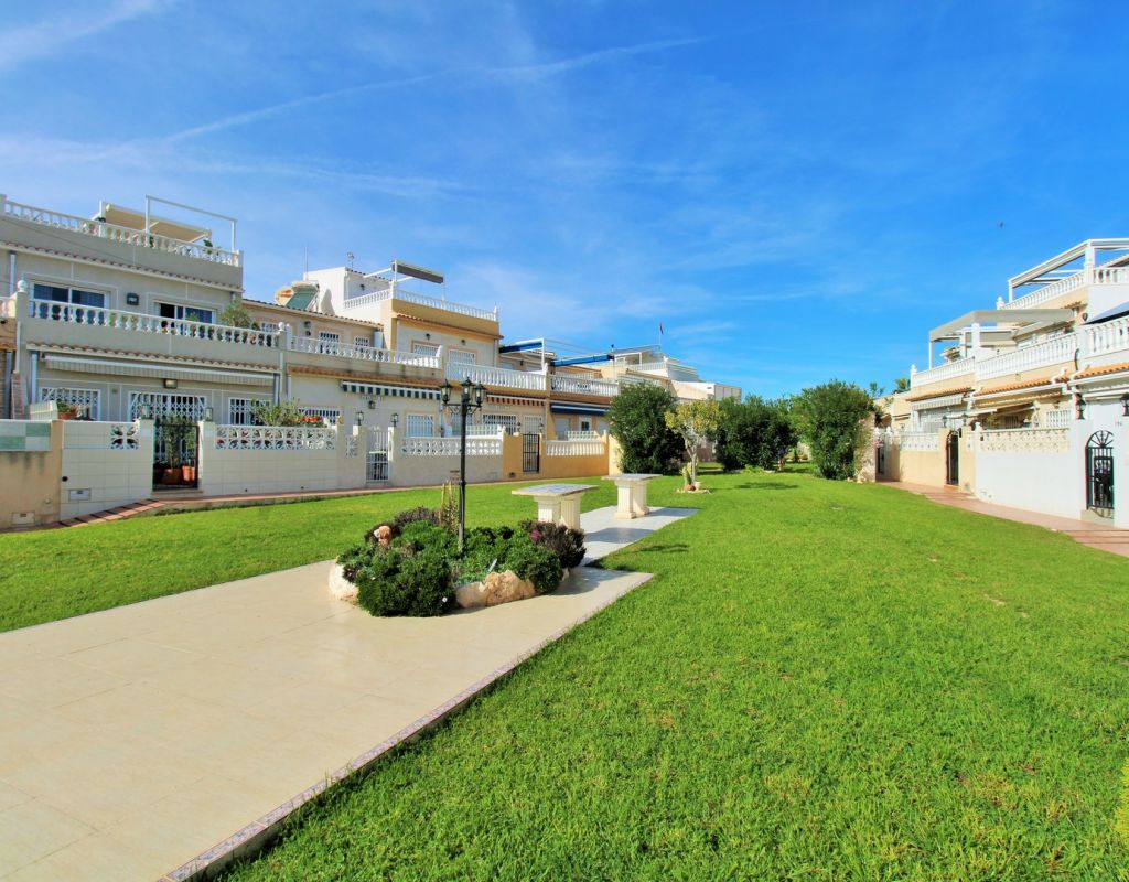Vistacasas presents this exceptional end-of-terrace bungalow offering superb value in the gated community of Manzana 7, La Chismosa (Playa Flamenca). Enjoying a desirable south-west orientation, the home benefits from sunshine throughout the day and features a generous front terrace complete with built-in BBQ and retractable awnings—perfect for relaxing or entertaining. Residents also have access to beautifully maintained communal green areas. All living accommodation is arranged on one level, comprising a bright living room with feature fireplace, an open fully fitted kitchen to the rear with access to an exterior utility area, and a small hallway leading to a light and airy double bedroom with fitted wardrobes and a bathroom with walk-in shower. The property is offered fully furnished and includes air-conditioning. Ideally situated within walking distance of local bars and restaurants in La Chismosa and La Florida, and just a short drive from the blue-flag beaches of the Orihuela Costa, Zenia Boulevard, and several top-class golf courses. A fantastic opportunity in a sought-after location—early viewings are highly recommended!