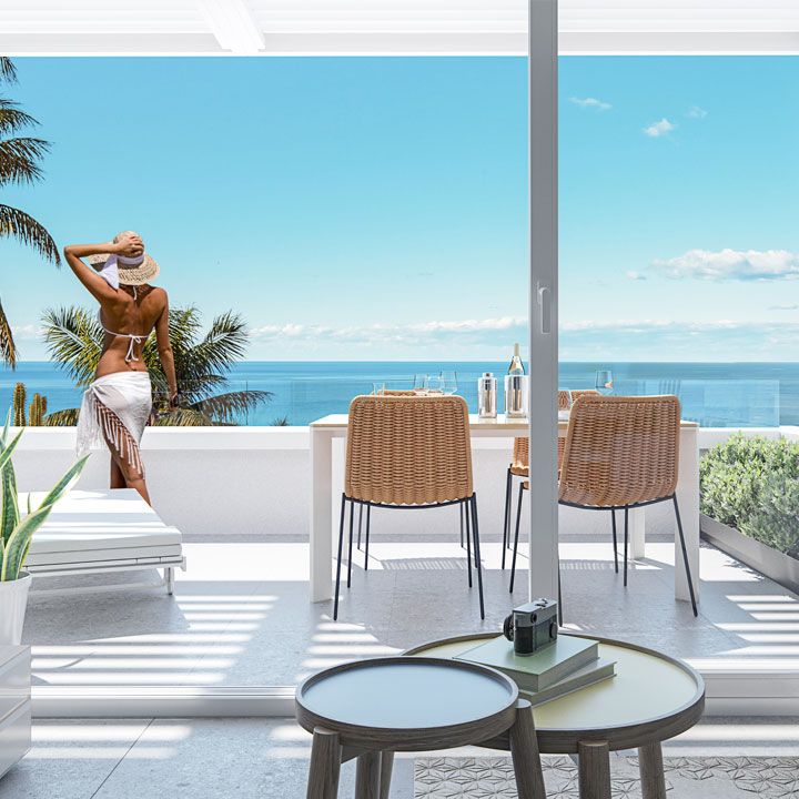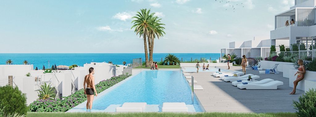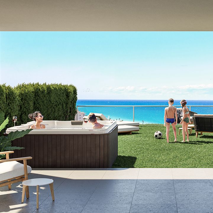 For sale new apartments with panoramic sea views in Costa Blanca, Spain.For sale is a unique project of 66 apartments and houses located just south of Villajoyosa on the Costa Blanca North.Unique for its unbeatable panoramic views and incredible common areas. You can have a relaxing swim all year round while overlooking the Mediterranean Sea, as the pool and jacuzzis are heated. Sports enthusiasts will enjoy a full gym, a paddle court and an enviable environment for practicing water sports. Little ones will have a great time in the children's play areas in and out of the water.The common areas and residences have beautiful sea views. Depending on the orientation and elevation, you can enjoy views of the common areas, the pool and the various beaches and coves.Houses with 2 and 3 bedrooms, with beautiful sea views. They all have a large terrace, garden or solarium. Excellent qualities that include, among others, hot/cold air conditioning through ducts and underfloor heating in the bathrooms. You have the opportunity to personalize your home with different finishing options. All properties include a parking space.