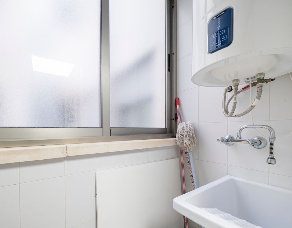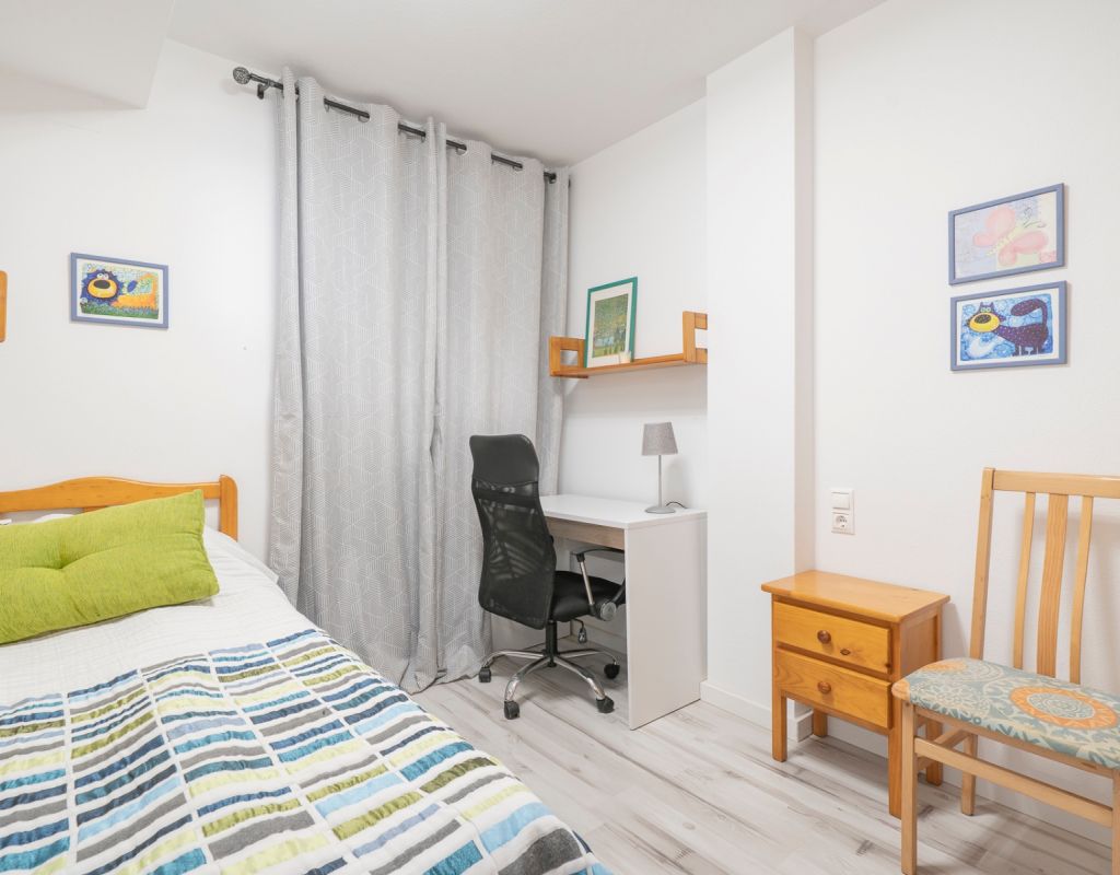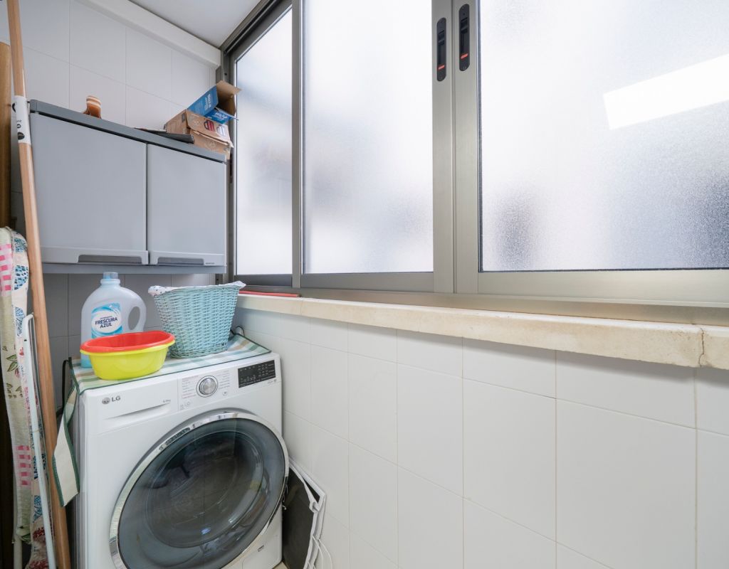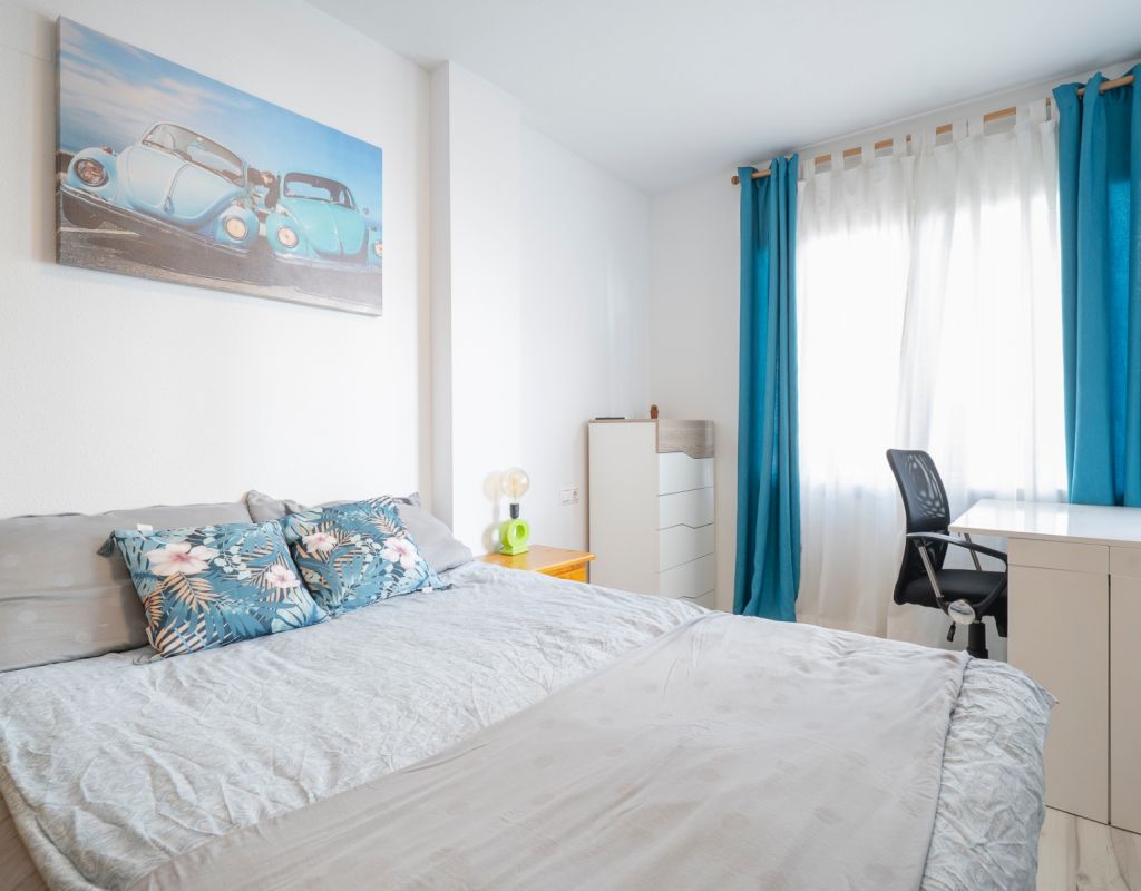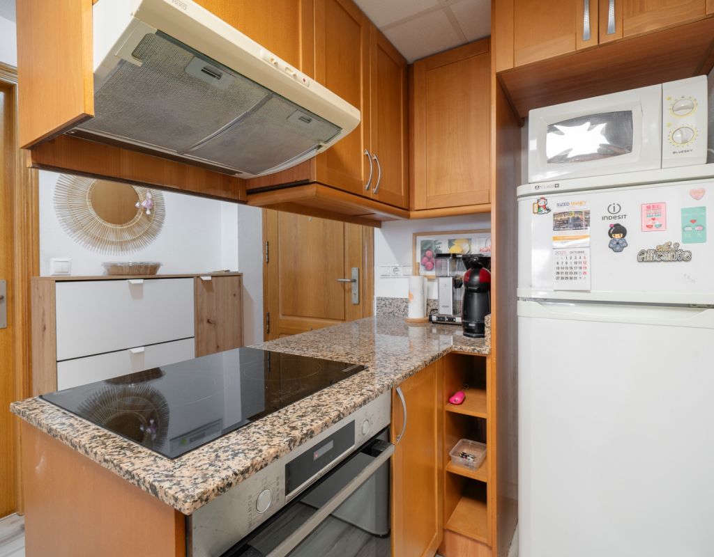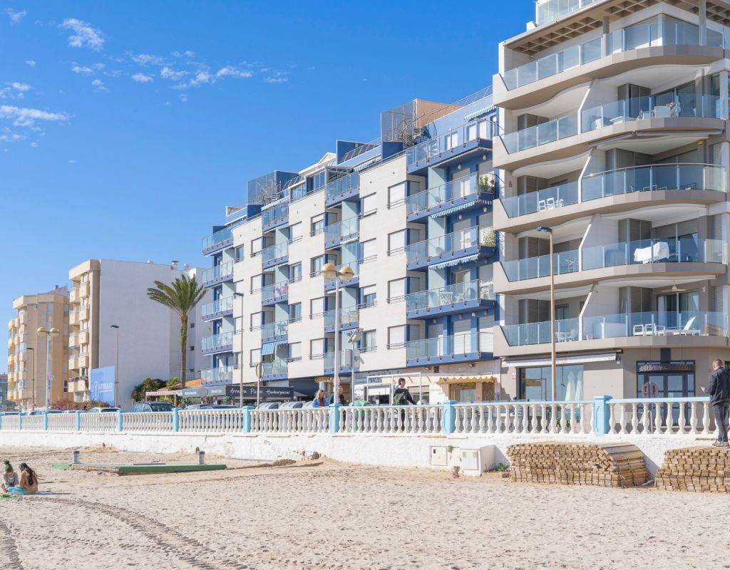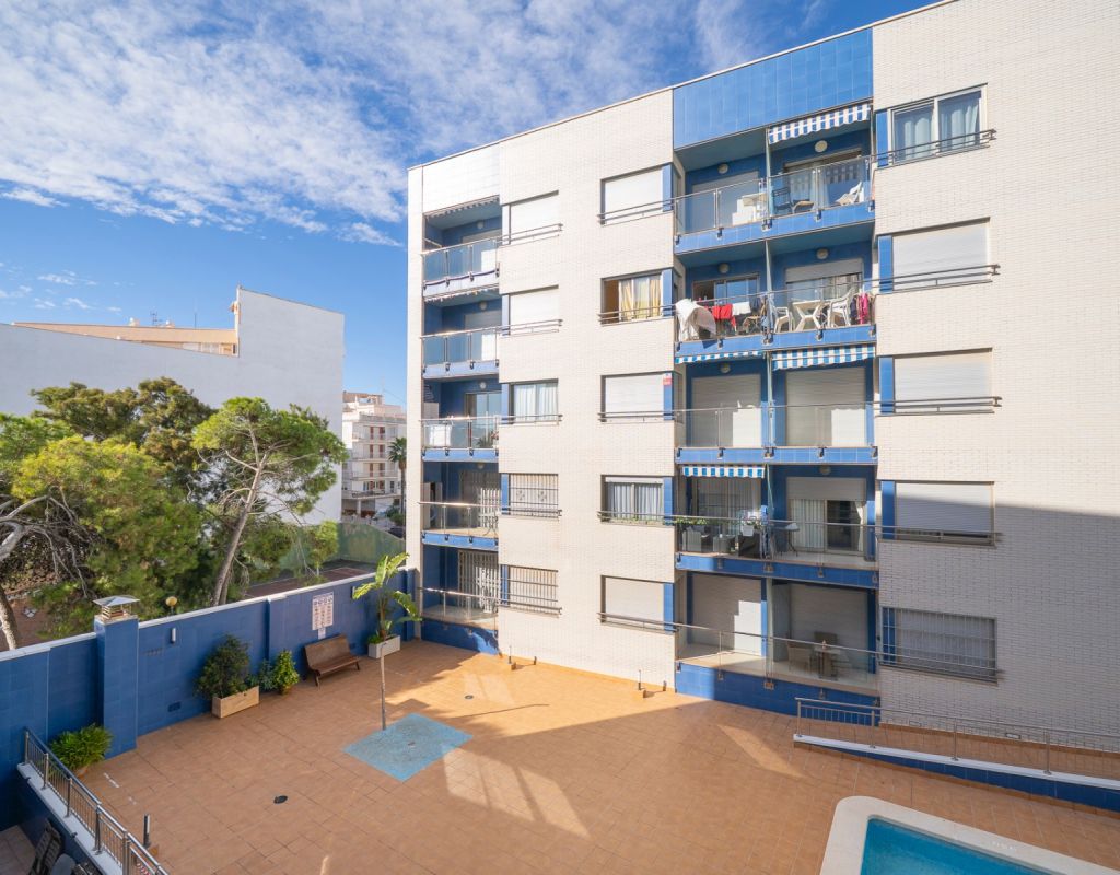 2 bedroom apartment located in a first line residential complex in Playa de los Locos in Torrevieja. The apartment consists of two bedrooms with fitted wardrobes, one bathroom, an open plan kitchen, living and dinig room, and a utility room with access from the kitchen. From the living room you have access to a terrace overlooking the communal areas. The apartment is located in the third floor with elevator. In the residential complex there is a communal swimming pool with a tiled area around the pool to relax. There is also an underground parking garage in the residential complex, where one parking space is included. The complex is located in the first line of Playa de los Locos in Torrevieja. You have immediate access to both the beach and a large selection of amenities.