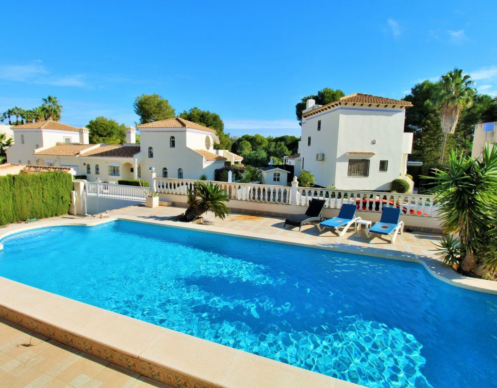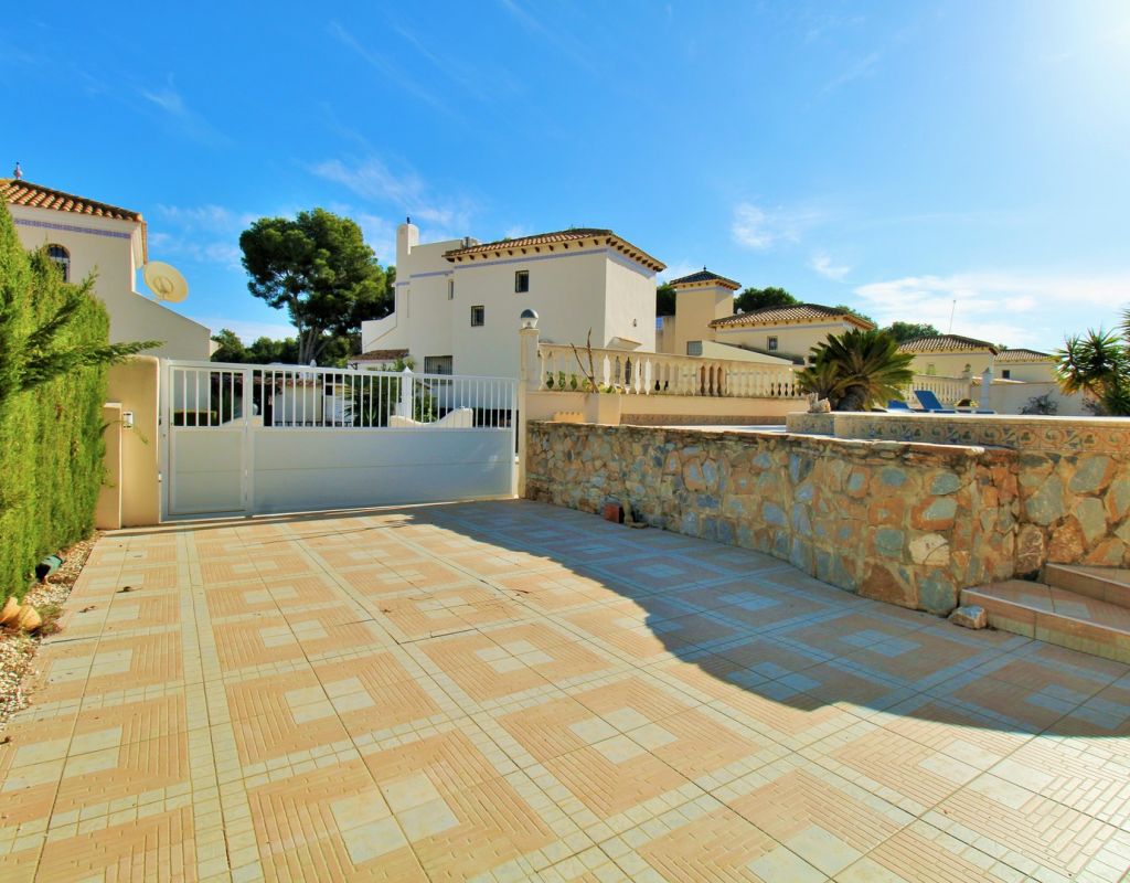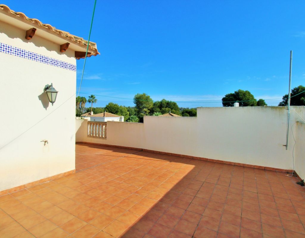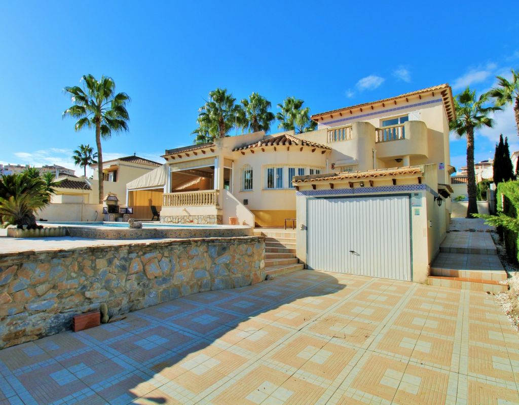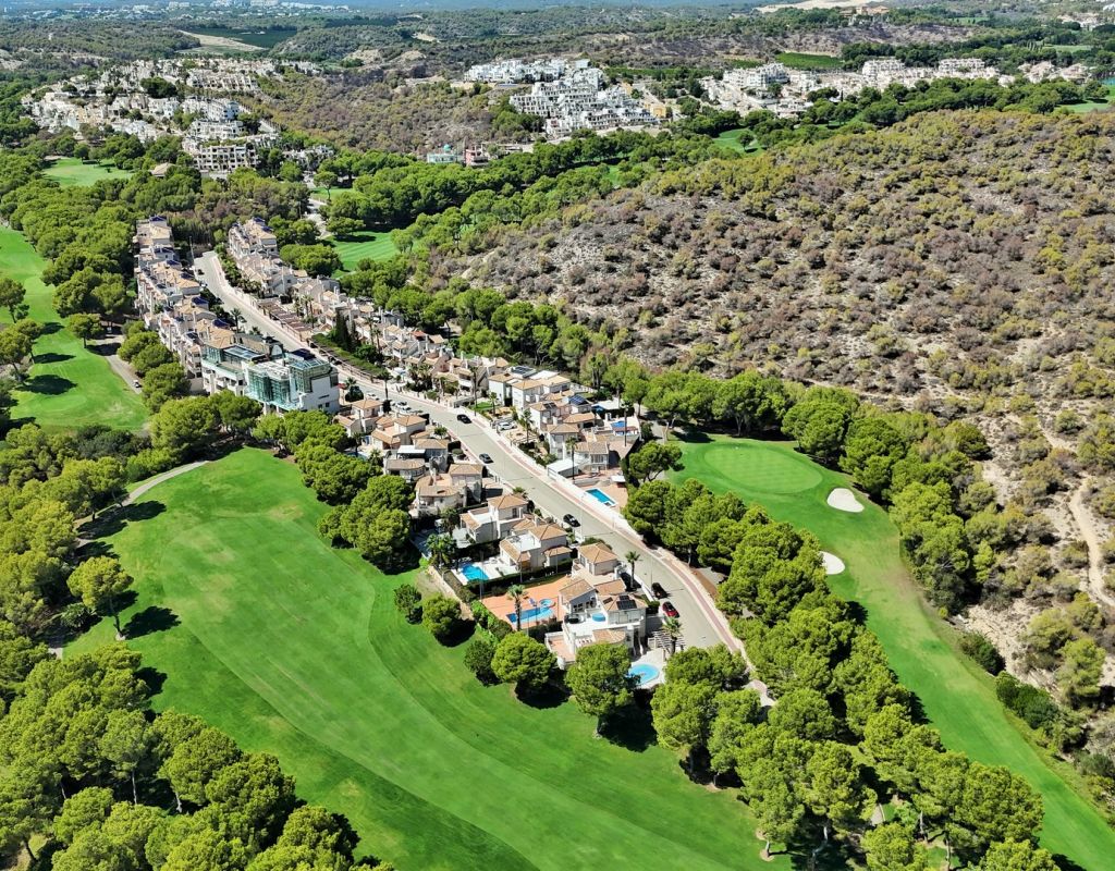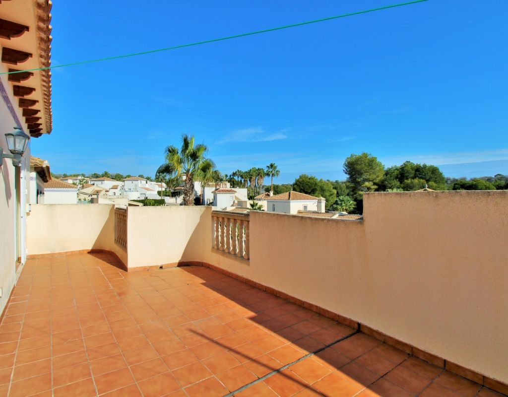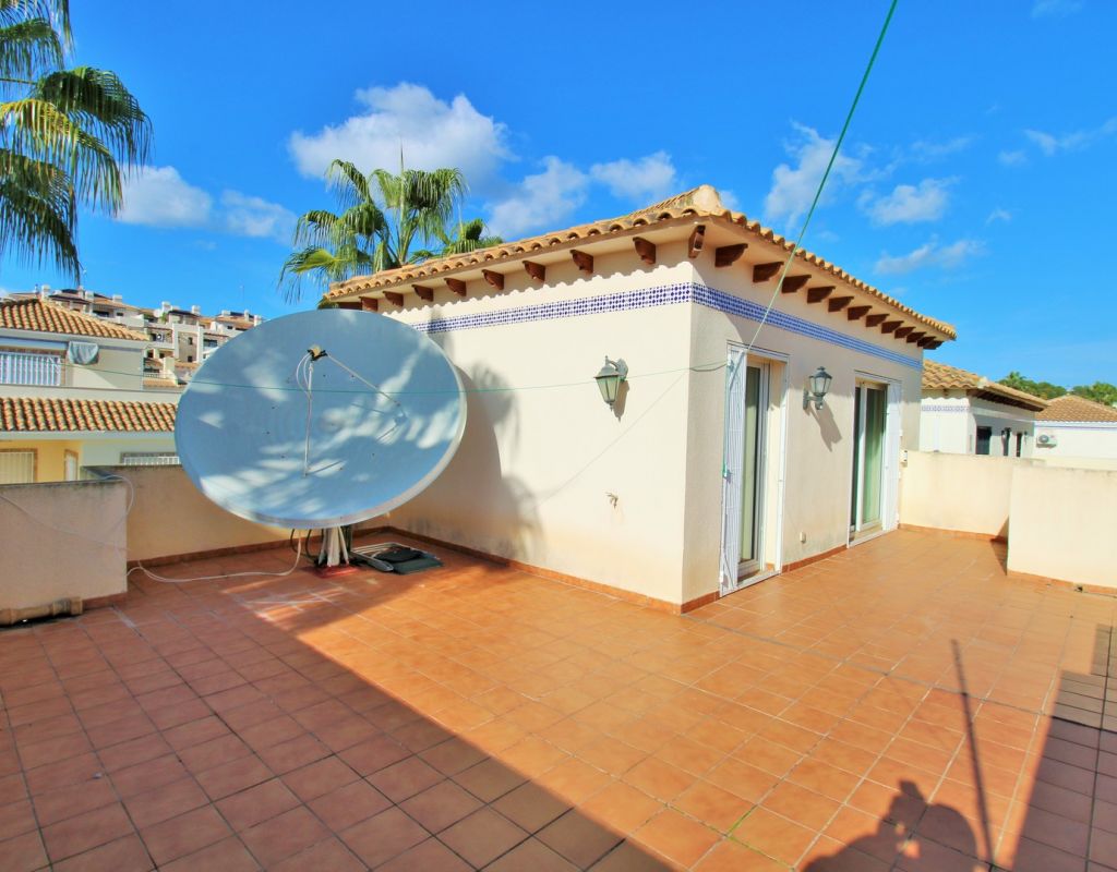 Situated second line to the fairways of Las Ramblas Golf, this fantastic detached villa represents an exceptional opportunity within one of Orihuela Costa’s most established and sought-after golf resorts. Set on a generous 500m² plot, the property offers spacious and well-balanced accommodation designed for comfortable Mediterranean living. The main level features a bright open-plan living and dining area with a modern kitchen, two bedrooms, a full family bathroom, and an additional guest toilet. Upstairs, the master bedroom with en-suite bathroom enjoys direct access to a large private roof terrace with panoramic golf course views, making it the perfect space to relax or entertain. Outside, the villa benefits from a beautifully landscaped garden with a large private swimming pool, BBQ area, and plenty of space for outdoor dining and sunbathing. The property also includes a garage and is located on a quiet private road with no through traffic, offering both peace and privacy. Despite its tranquil setting, amenities are close by. The La Fuente commercial centre is just a short drive away, two large supermarkets are within walking distance, and the beaches of Orihuela Costa can be reached in approximately 10 minutes by car. Considering its plot size, location, and features, this villa offers outstanding value and is a rare opportunity on Las Ramblas Golf. Early viewing is highly recommended.