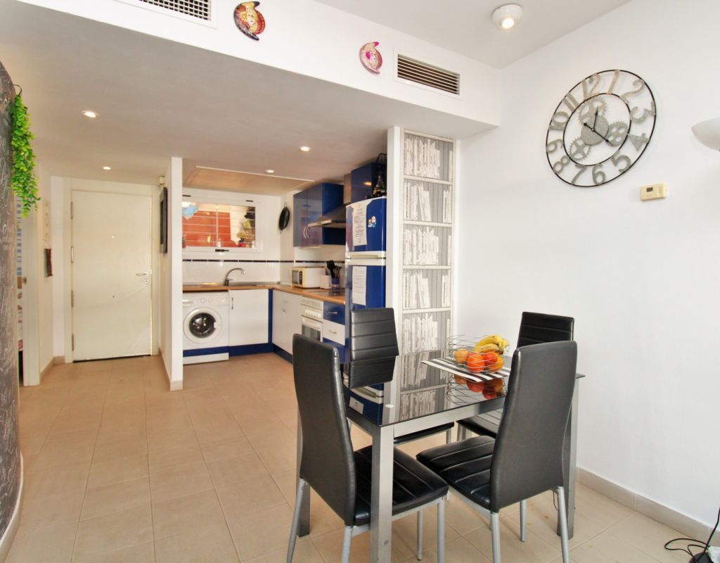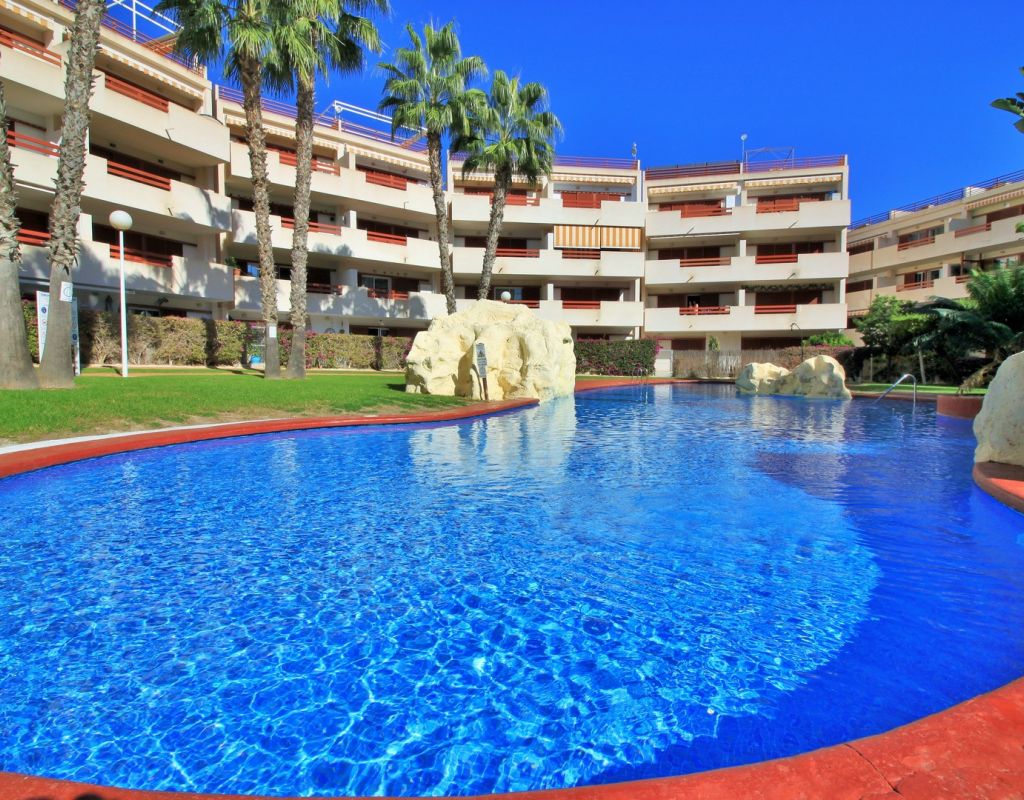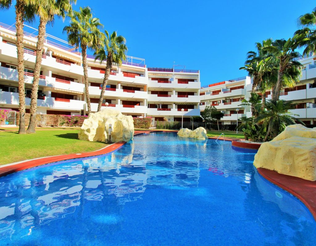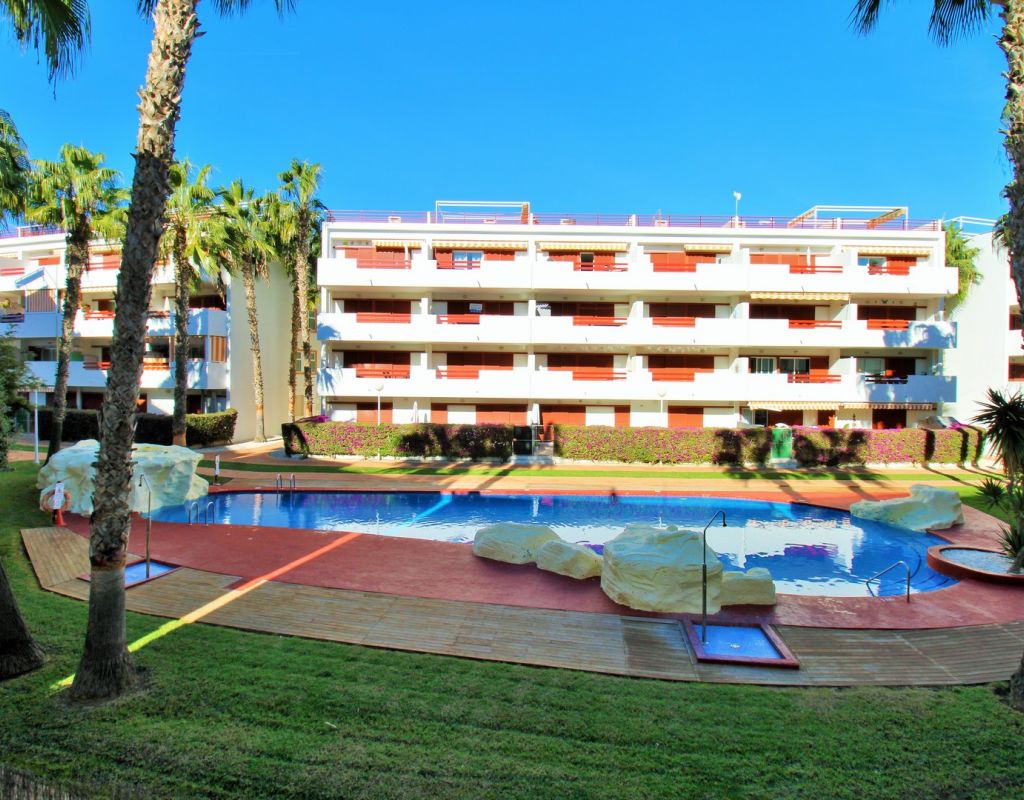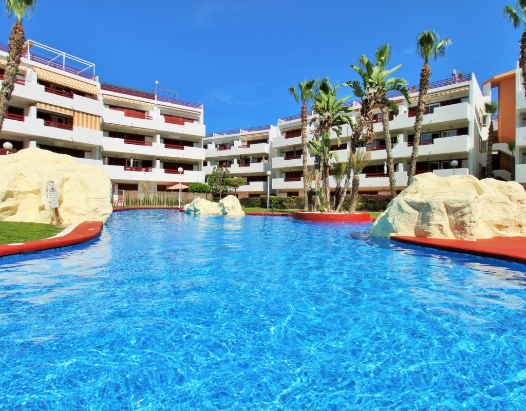 This well-presented 2-bedroom, 2-bathroom apartment is located on the first floor of the popular El Rincon gated community in Playa Flamenca, offering a prime position with views across one of the two communal swimming pools. Inside, the property features a bright living and dining area with sliding doors leading to a private terrace overlooking the pool, a fitted open-plan kitchen, and two double bedrooms—each with fitted wardrobes and their own bathroom, providing excellent privacy and convenience for owners and guests. The apartment is sold furnished including white goods, making it ready to enjoy from day one. Additional features include lift access, two attractive communal pools, and a private parking space inside the gated complex. Ideally located, El Rincon is just a short walk from supermarkets, cafés, bars, and restaurants, while Zenia Boulevard, the Saturday market, and Playa Flamenca beach are only a few minutes away by car. A great turnkey option in one of the area’s most sought-after communities.