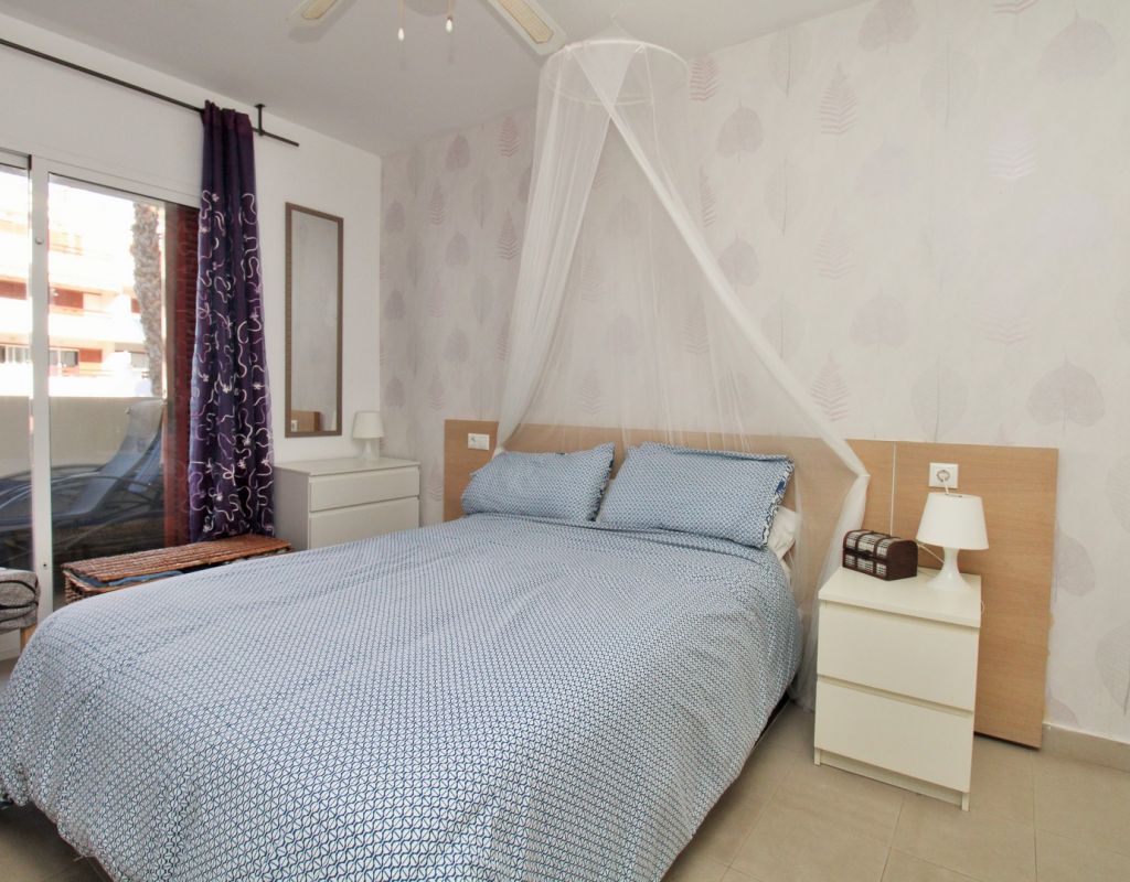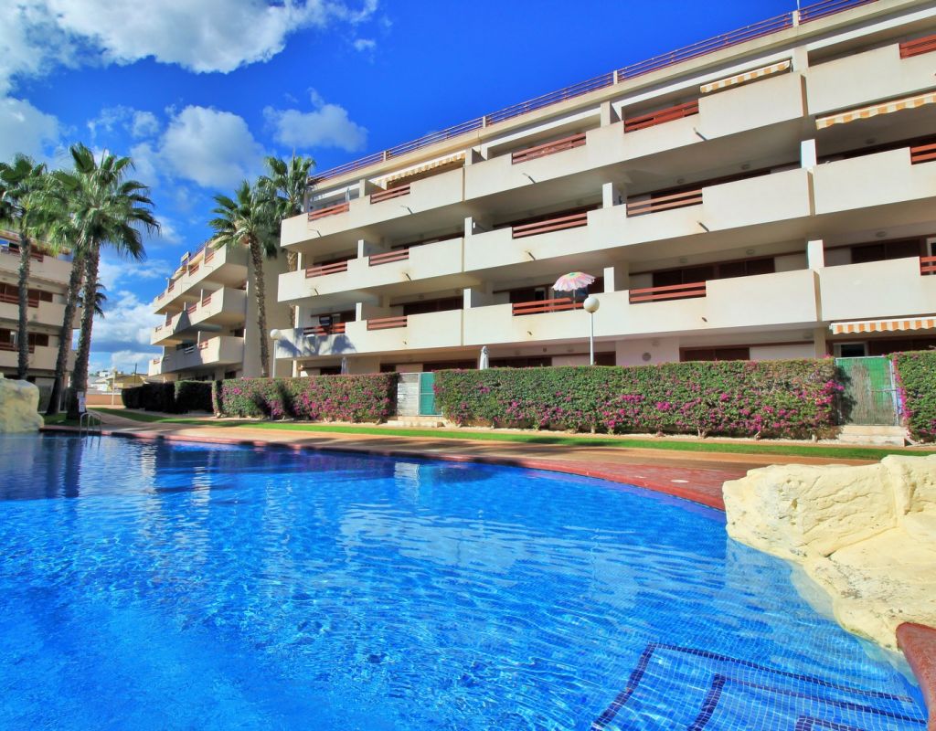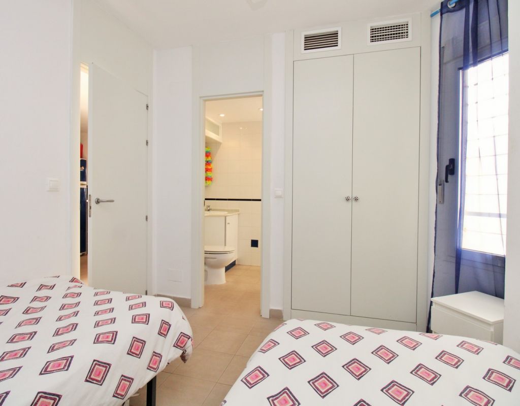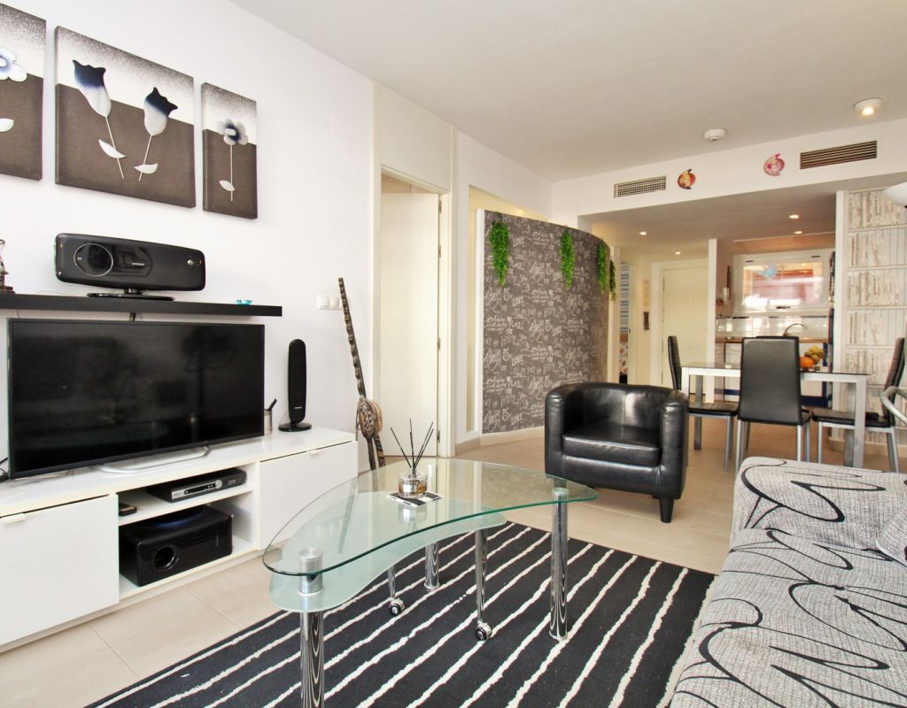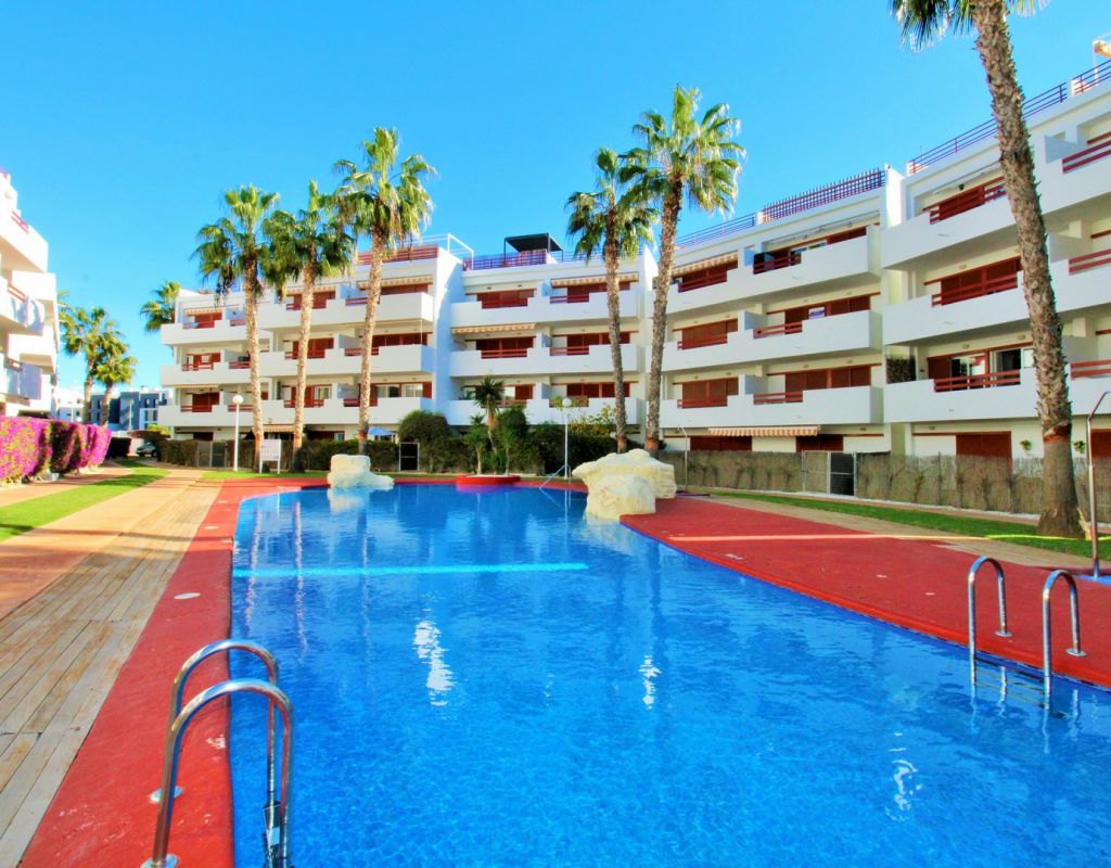 This well-presented 2-bedroom, 2-bathroom apartment is located on the first floor of the popular El Rincon gated community in Playa Flamenca, offering a prime position with views across one of the two communal swimming pools. Inside, the property features a bright living and dining area with sliding doors leading to a private terrace overlooking the pool, a fitted open-plan kitchen, and two double bedrooms—each with fitted wardrobes and their own bathroom, providing excellent privacy and convenience for owners and guests. The apartment is sold furnished including white goods, making it ready to enjoy from day one. Additional features include lift access, two attractive communal pools, and a private parking space inside the gated complex. Ideally located, El Rincon is just a short walk from supermarkets, cafés, bars, and restaurants, while Zenia Boulevard, the Saturday market, and Playa Flamenca beach are only a few minutes away by car. A great turnkey option in one of the area’s most sought-after communities.