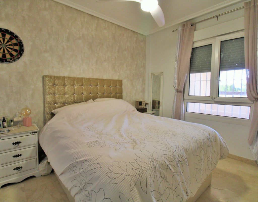 This well-presented ground floor 2-bedroom, 2-bathroom Jumilla-style apartment is located within the highly sought-after gated community of Jumilla II in Playa Flamenca. Positioned in one of the best blocks within the complex, the property enjoys open views over the communal swimming pool and landscaped garden areas. The accommodation comprises an entrance hallway, a bright lounge-dining area, a separate fully fitted kitchen, two double bedrooms with fitted wardrobes, and a family bathroom. The master bedroom benefits from an en-suite bathroom with a walk-in shower, offering excellent privacy and comfort. From the lounge, patio doors lead out to a covered front terrace with retractable glass curtains, creating a versatile outdoor living space that can be enjoyed year-round while taking in the attractive pool and garden views. The apartment is part of a secure, well-maintained community and is ideally located within walking distance of local amenities in La Florida, including The Abbey Tavern, Emerald Isle, local bars and restaurants, and the popular Saturday street market. The renowned Zenia Boulevard shopping centre is just a short distance away, along with several golf courses and a choice of blue-flag beaches along the Orihuela Costa coastline. An excellent option as a holiday home, permanent residence, or rental investment in one of Playa Flamenca’s most established residential communities.