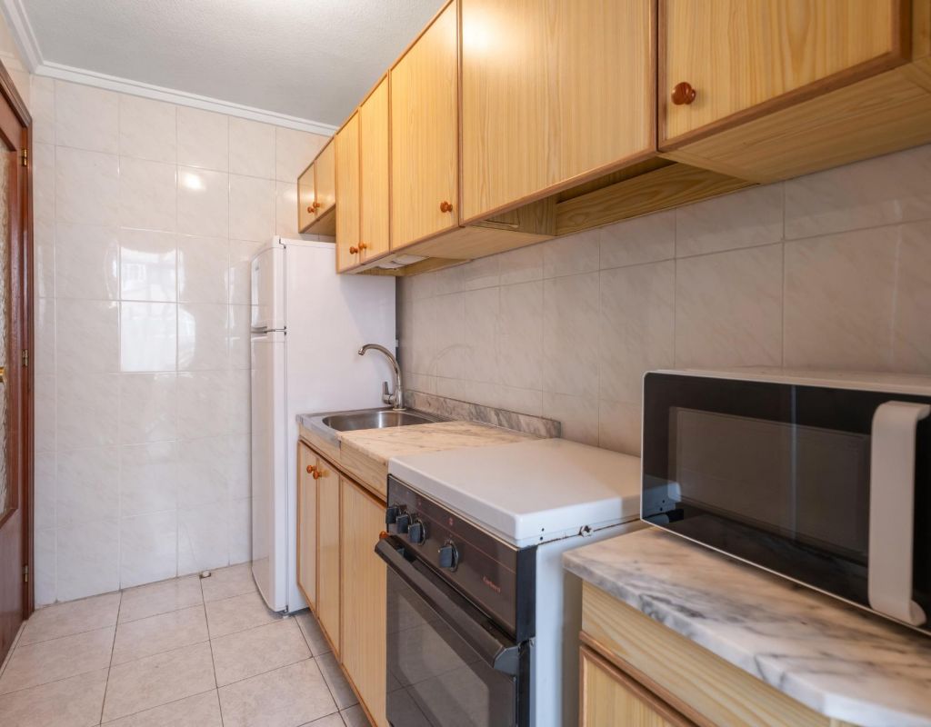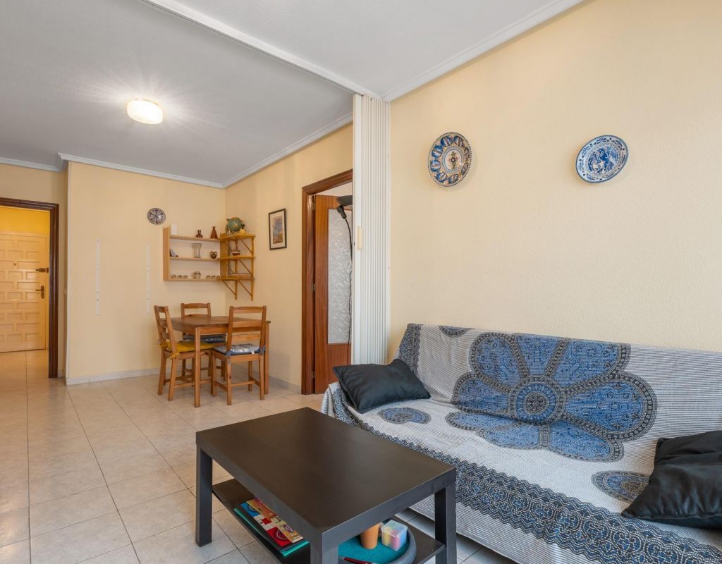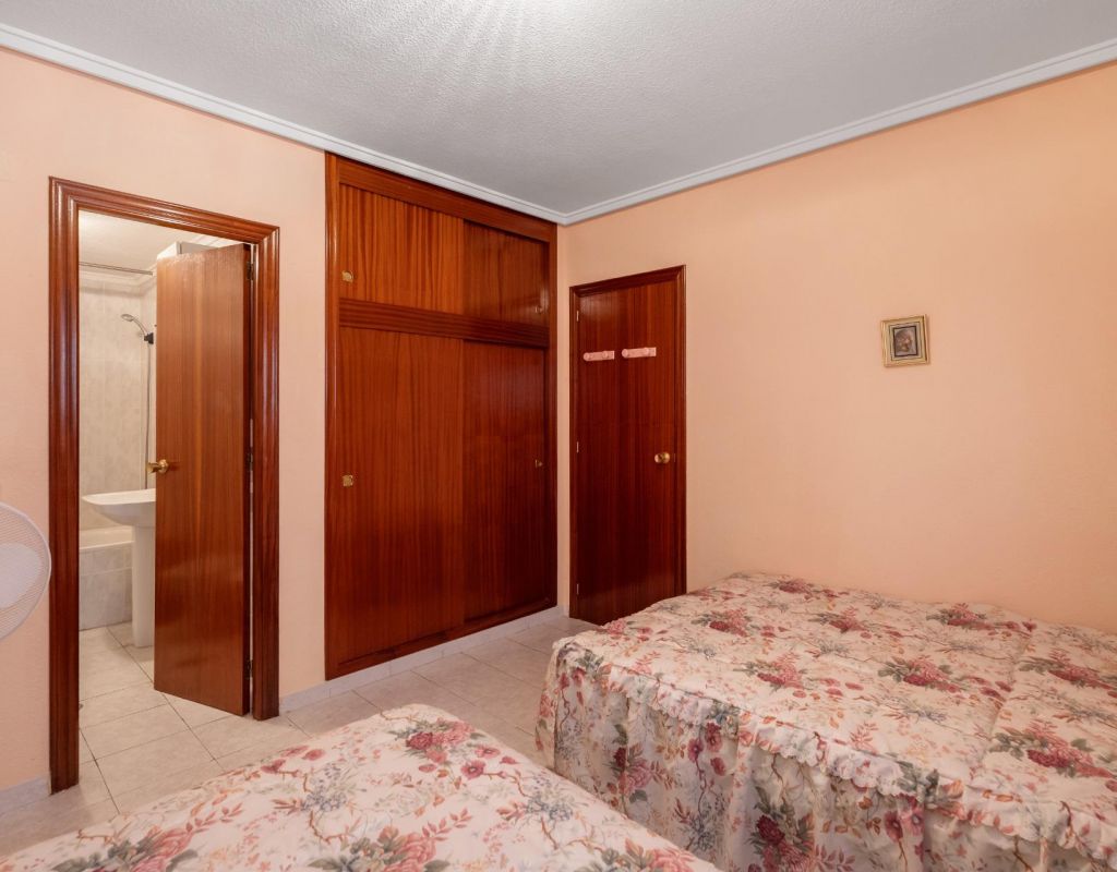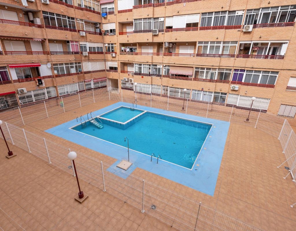 We present this second-floor apartment located in Torrevieja, in an area surrounded by shops and services, ideal for everyday living.~~The property features a spacious bedroom with en-suite bathroom, offering comfort and privacy. It has an independent kitchen with a utility room, ideal for laundry and storage.~~From the living room, there is access to a balcony with direct views of the communal swimming pool, a pleasant space to enjoy the Mediterranean climate. The property is part of a complex with a communal pool.~~The beach is just 1.5 km away, easily reachable by car or on foot.~~An ideal property as a second home, holiday apartment or investment in Torrevieja.