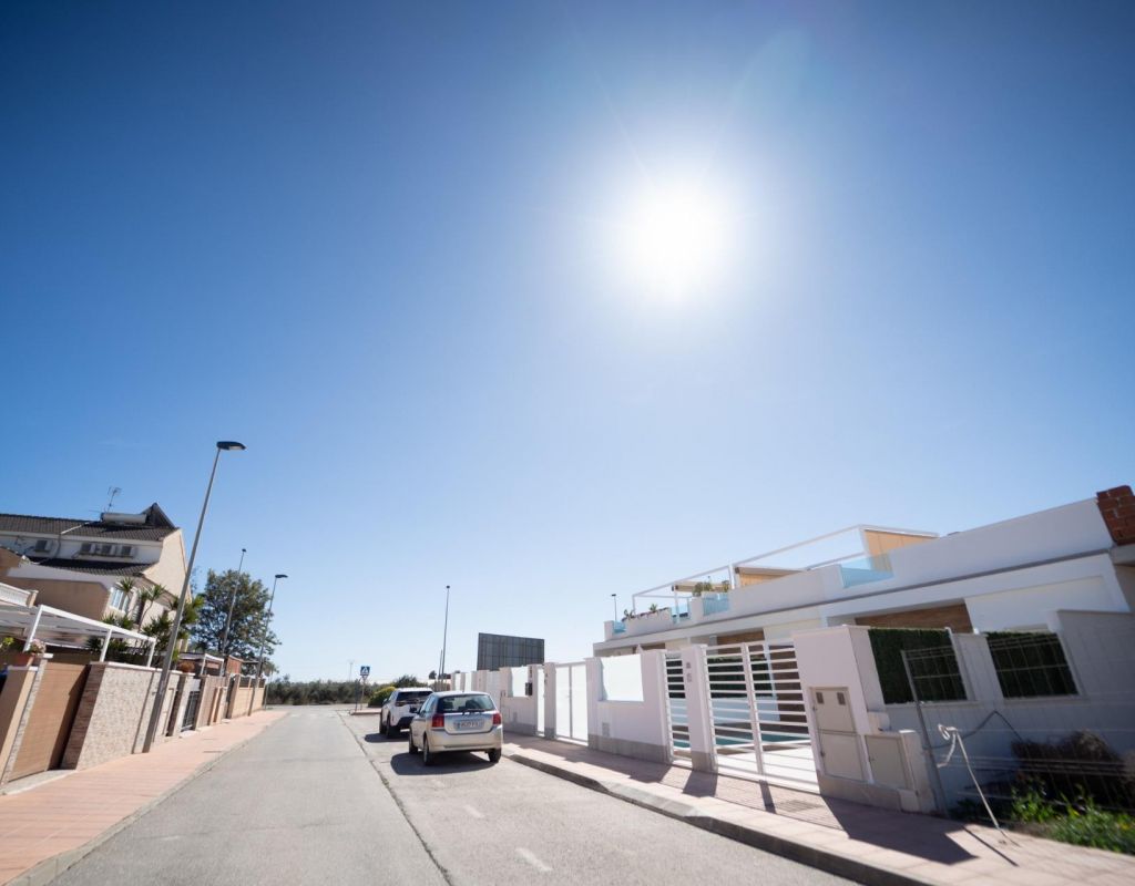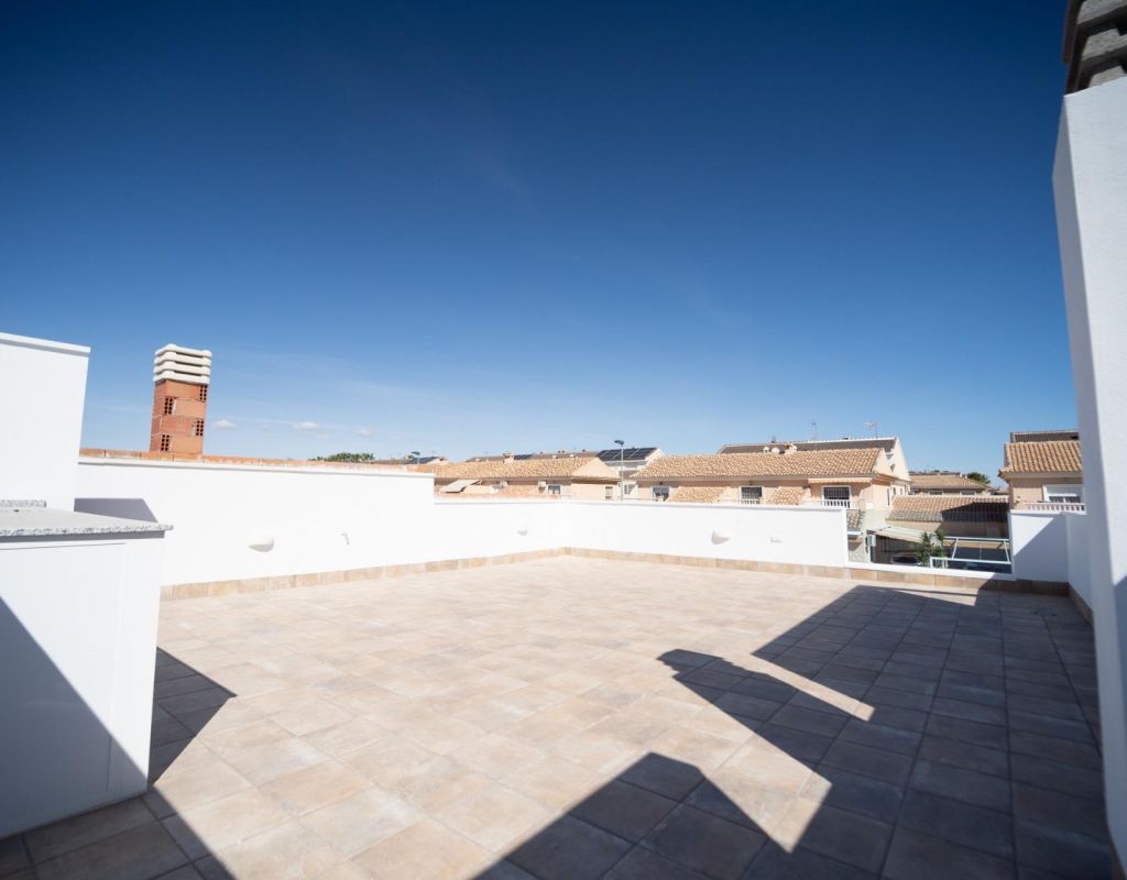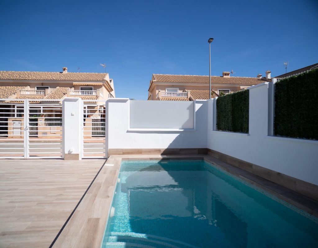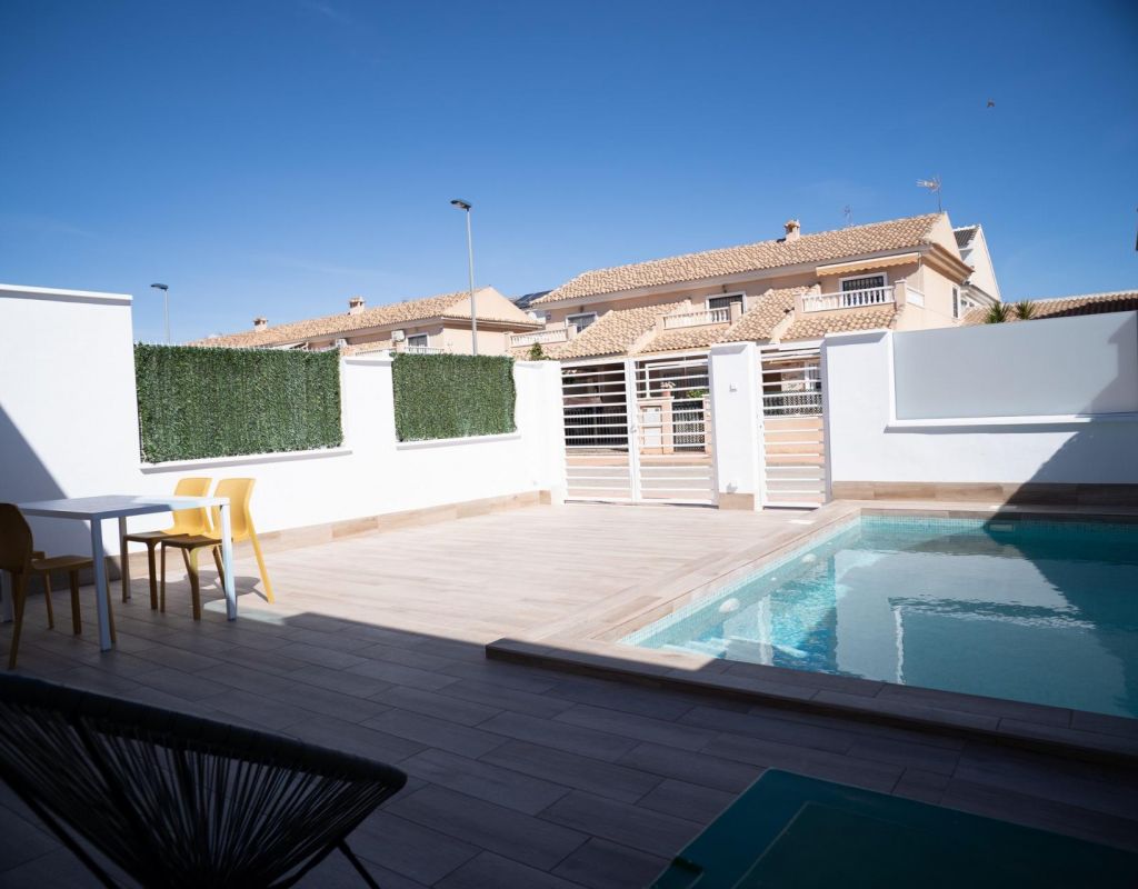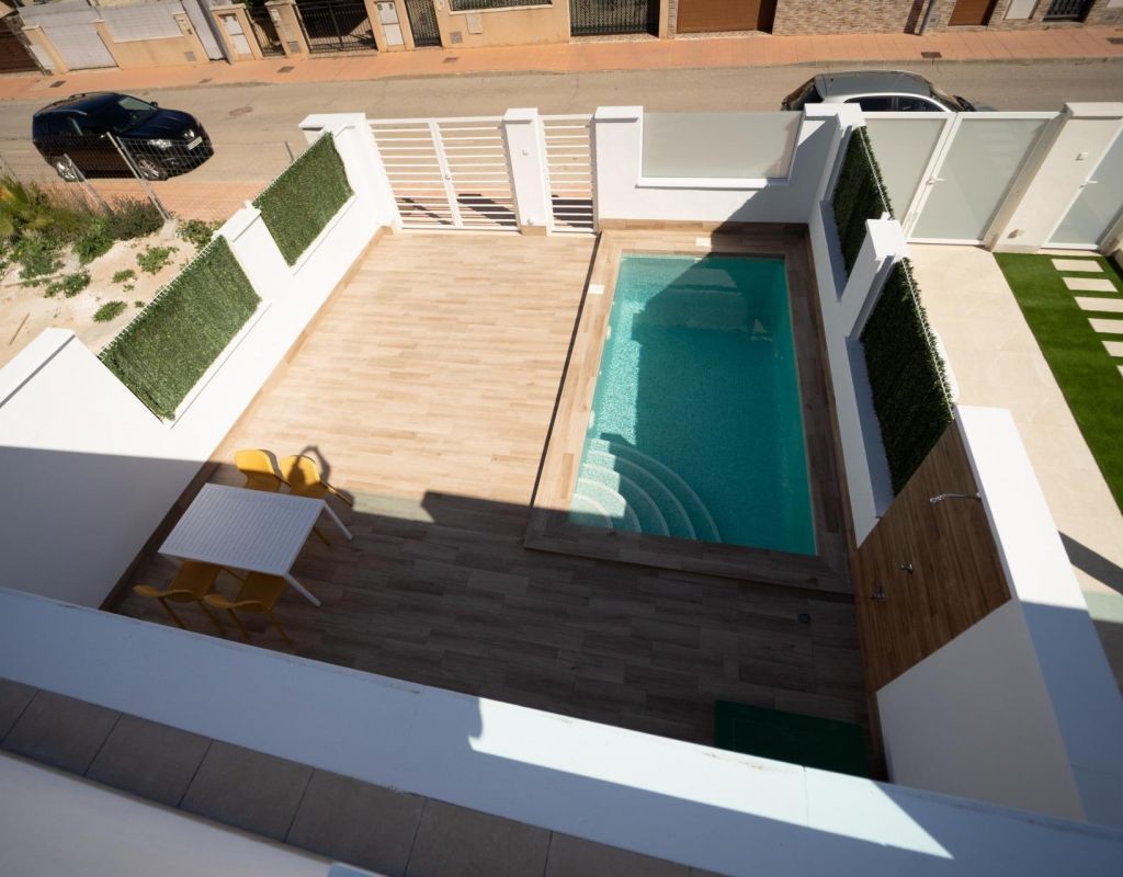 NEW BUILD TOWNHOUSES IN SAN JAVIER New Build luxury complex of 24 one level villas or on 2 floors with private pool, terraced area and solarium with Summer kitchen that allows you to enjoy all hours of sunshine, every day of the year. Each villa has 2 or 3 bedrooms and 2 fitted bathrooms on one level or 3 bedrooms and 3 fitted bathrooms on two levels. Designed with a contemporary style and open planned concept, comprising a fully-fitted kitchen and lounge-dining room. The development is located in San Javier (Murcia), near the beach, surrounded by services, parks, sports facilities and several Golf Courses. The property will meet the highest standards and will be equipped with: Private swimming pool with shower. Kitchen completely furnished and equipped with oven, microwave, fridge, integrated dishwasher, hob and extractor fan. Lighting: inside the property (dining room, kitchen, corridors and bathrooms) as well as in outdoor areas. Lined wardrobes with drawers. Fully fitted bathrooms with toilet, vanity unit, mirror and shower with screen panels. Pre-installation for ducted air conditioning. Solarium with Summer kitchen. Parking space on the plot. San Javier is close to all amenities with easy access to the beach, water sports, shops and the transport network. Here you can enjoy all of the facilities that San Javier has to offer such as the local shops, bars and restaurants as well as being near to shopping centres, the airport of Murcia and all of the beautiful places to be found along the Mar Menor. Corvera/Murcia airport is 30 minutes away and Alicante airport is 45 minutes away.