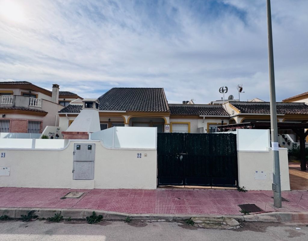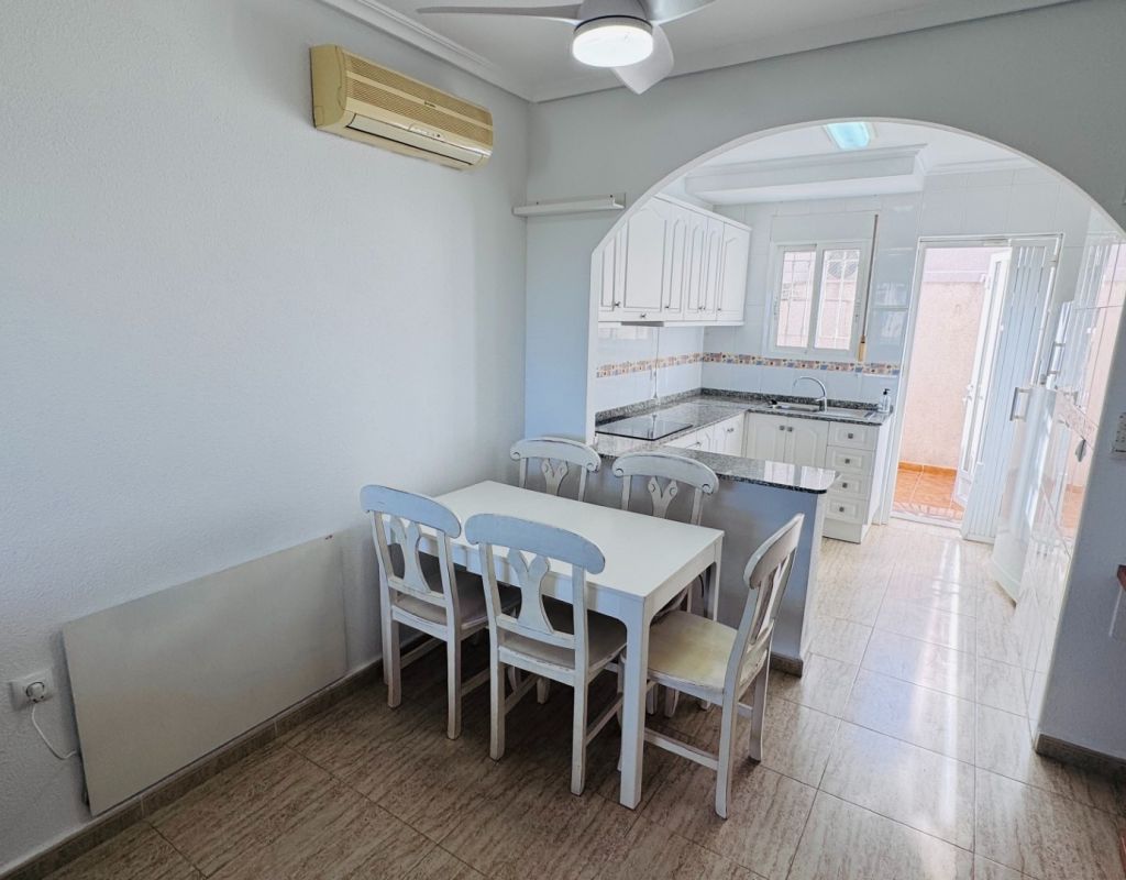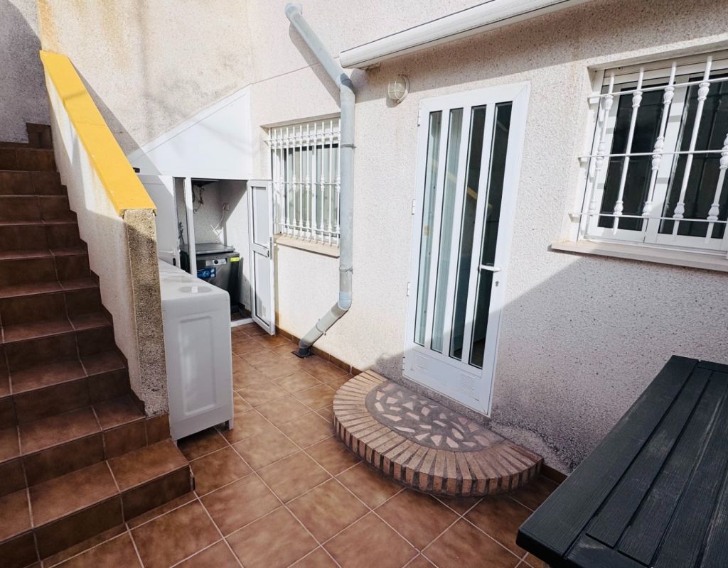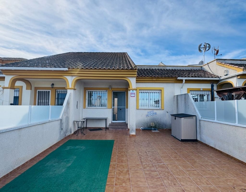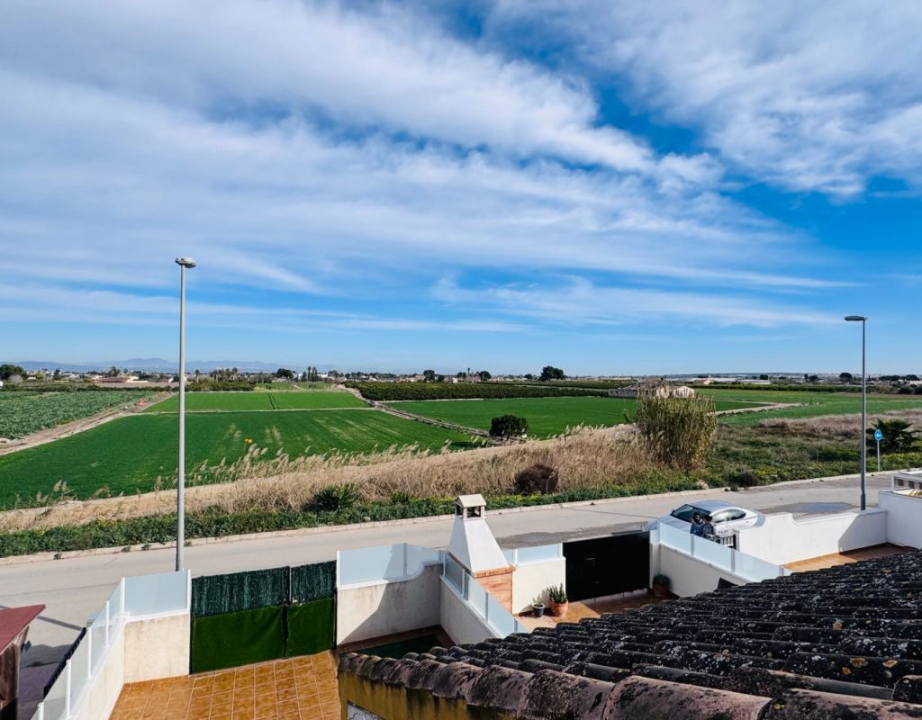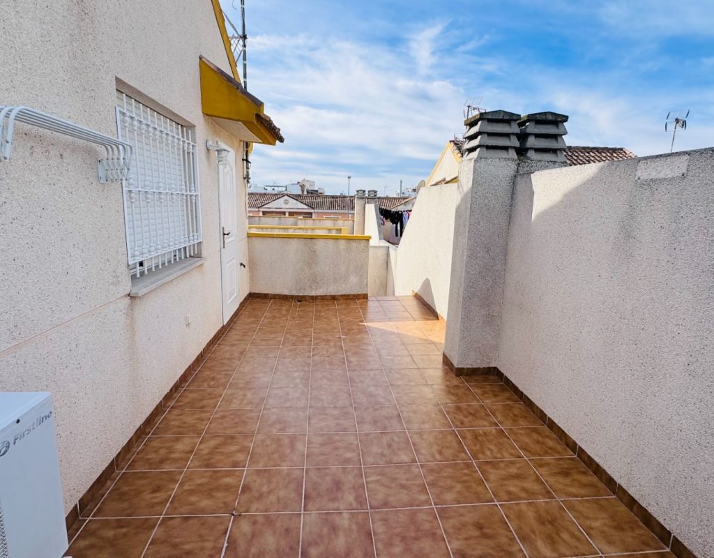 This spacious three bedroom townhouse is located on the 'Pinada Gardens' development in the charming village of Daya Nueva. The north facing property overlooks open farmland and the mountains, providing a serene and peaceful setting and has a large front garden with off-road parking and plenty of room for relaxing and entertaining. This main house has a bright open plan lounge/diner and kitchen. The kitchen has a range of wall and base units, built in oven/hob/extractor and fridge freezer. There are two double bedrooms, both with fitted wardrobes along with a family bathroom. The rear courtyard off the kitchen has a storage cupboard housing a washing machine and newly installed water boiler. Stairs lead up to a roof terrace with a separate studio apartment containing one bedroom and a shower room - providing a versatile living space for guests or additional family members. The communal pool is just a few minutes walk away and is perfect for a refreshing dip on hot summer days. Additionally, the beaches of Guardamar are just a 15-minute drive away, offering a range of water sports and activities. Overall, this partly furnished townhouse/bungalow in Daya Nueva is an ideal property for those seeking a peaceful and relaxing lifestyle in the sunny climate of Spain. With its spacious and modern living areas, stunning roof terrace with a separate studio apartment and easy access to local amenities, the property is a must-see for anyone looking to buy in this area.