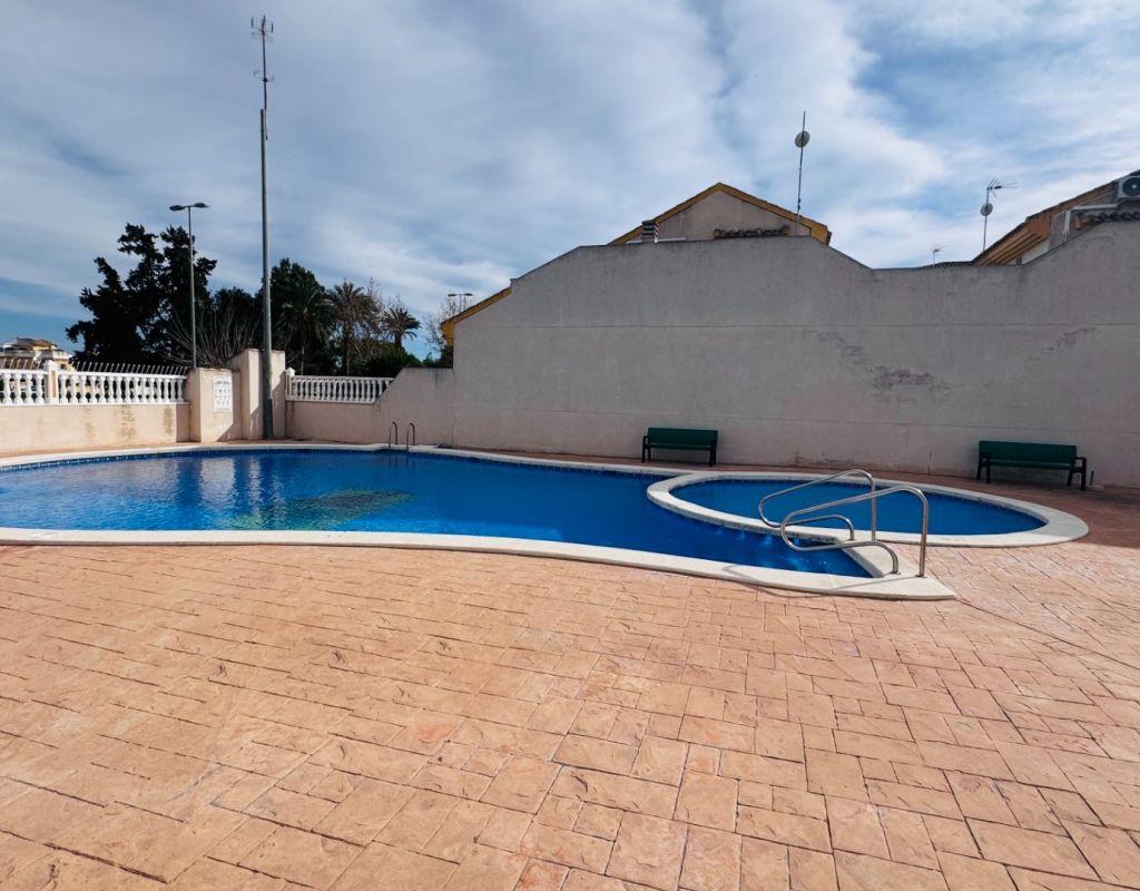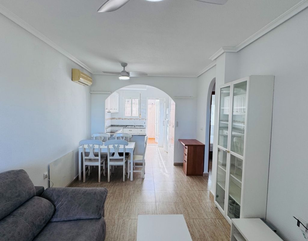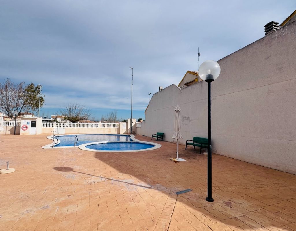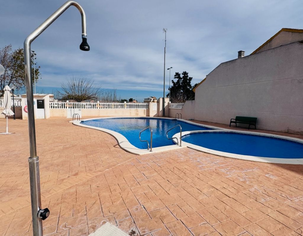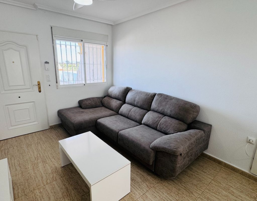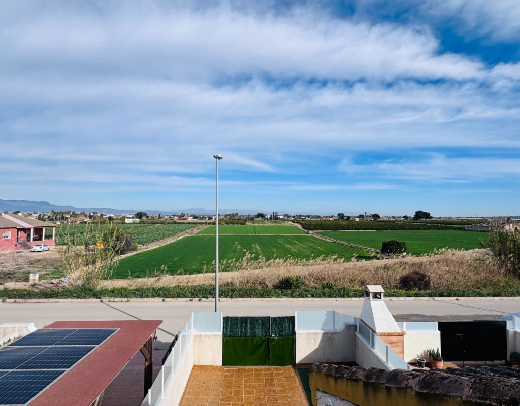 This spacious three bedroom townhouse is located on the 'Pinada Gardens' development in the charming village of Daya Nueva. The north facing property overlooks open farmland and the mountains, providing a serene and peaceful setting and has a large front garden with off-road parking and plenty of room for relaxing and entertaining. This main house has a bright open plan lounge/diner and kitchen. The kitchen has a range of wall and base units, built in oven/hob/extractor and fridge freezer. There are two double bedrooms, both with fitted wardrobes along with a family bathroom. The rear courtyard off the kitchen has a storage cupboard housing a washing machine and newly installed water boiler. Stairs lead up to a roof terrace with a separate studio apartment containing one bedroom and a shower room - providing a versatile living space for guests or additional family members. The communal pool is just a few minutes walk away and is perfect for a refreshing dip on hot summer days. Additionally, the beaches of Guardamar are just a 15-minute drive away, offering a range of water sports and activities. Overall, this partly furnished townhouse/bungalow in Daya Nueva is an ideal property for those seeking a peaceful and relaxing lifestyle in the sunny climate of Spain. With its spacious and modern living areas, stunning roof terrace with a separate studio apartment and easy access to local amenities, the property is a must-see for anyone looking to buy in this area.