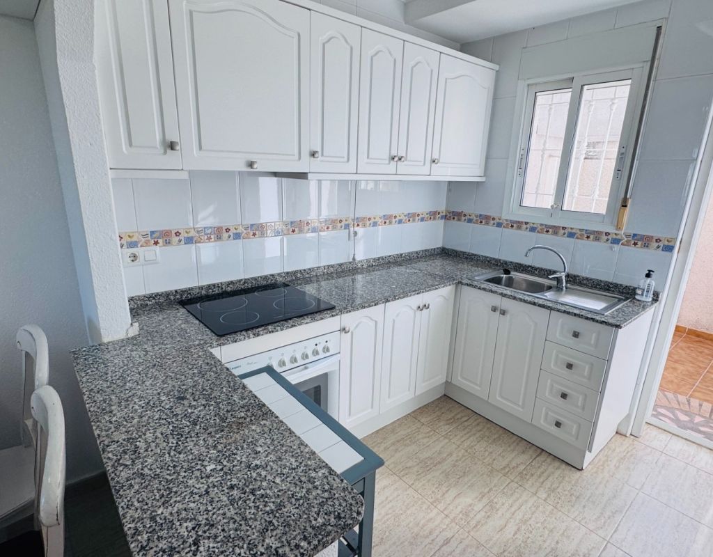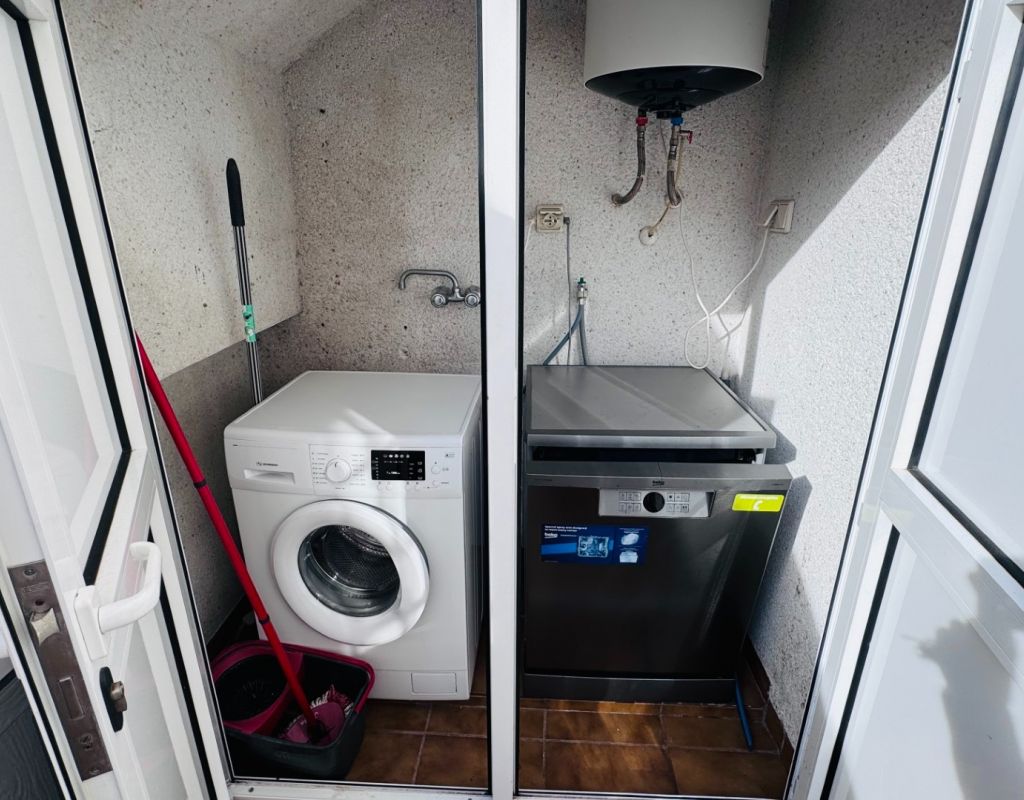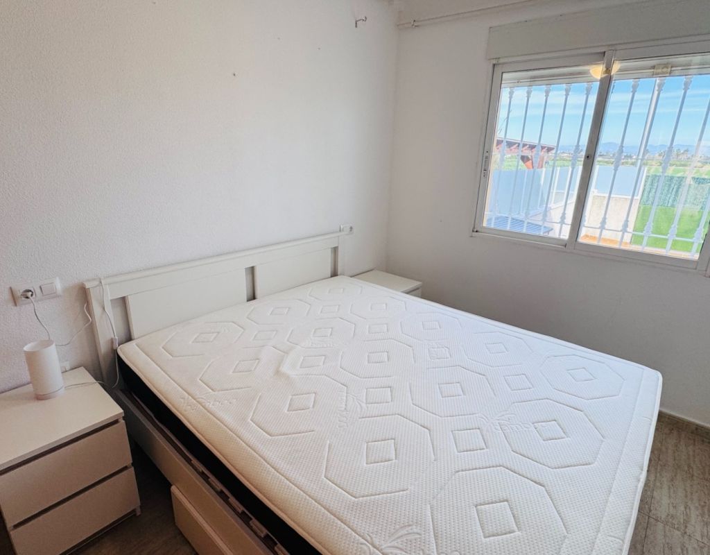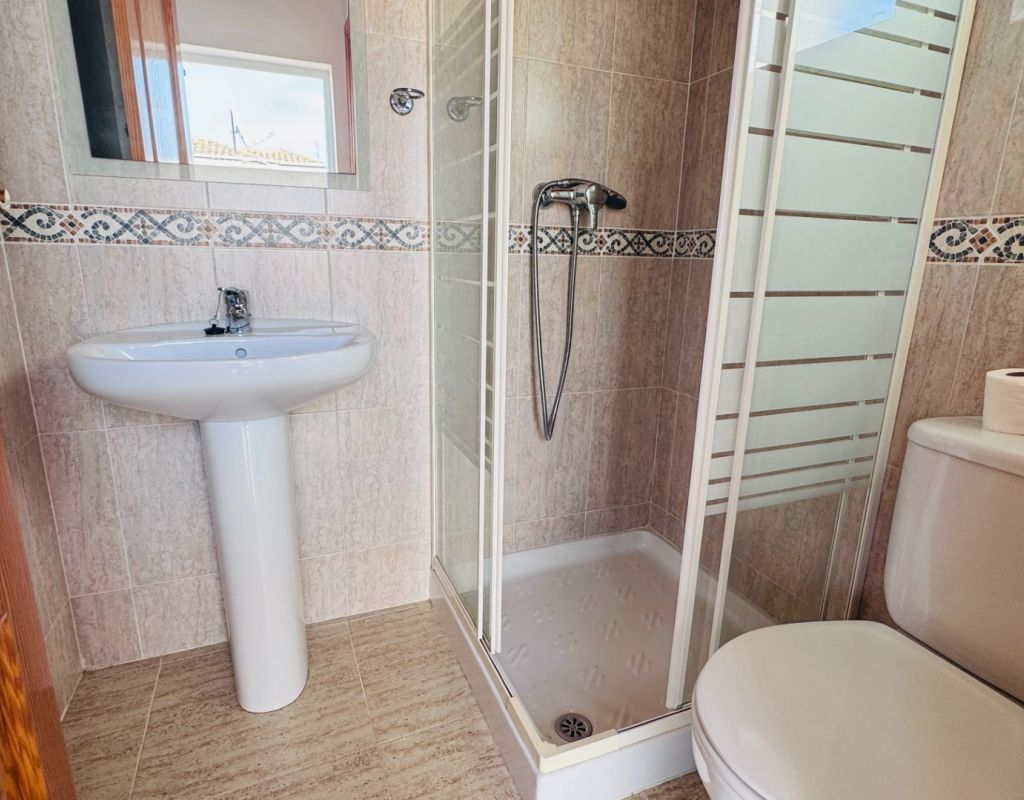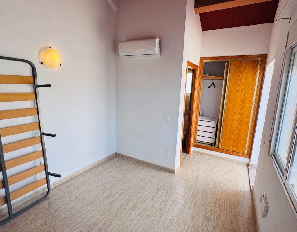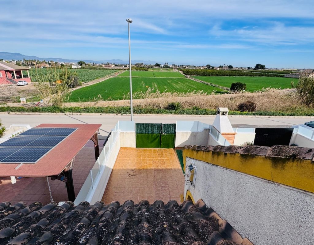 This spacious three bedroom townhouse is located on the 'Pinada Gardens' development in the charming village of Daya Nueva. The north facing property overlooks open farmland and the mountains, providing a serene and peaceful setting and has a large front garden with off-road parking and plenty of room for relaxing and entertaining. This main house has a bright open plan lounge/diner and kitchen. The kitchen has a range of wall and base units, built in oven/hob/extractor and fridge freezer. There are two double bedrooms, both with fitted wardrobes along with a family bathroom. The rear courtyard off the kitchen has a storage cupboard housing a washing machine and newly installed water boiler. Stairs lead up to a roof terrace with a separate studio apartment containing one bedroom and a shower room - providing a versatile living space for guests or additional family members. The communal pool is just a few minutes walk away and is perfect for a refreshing dip on hot summer days. Additionally, the beaches of Guardamar are just a 15-minute drive away, offering a range of water sports and activities. Overall, this partly furnished townhouse/bungalow in Daya Nueva is an ideal property for those seeking a peaceful and relaxing lifestyle in the sunny climate of Spain. With its spacious and modern living areas, stunning roof terrace with a separate studio apartment and easy access to local amenities, the property is a must-see for anyone looking to buy in this area.