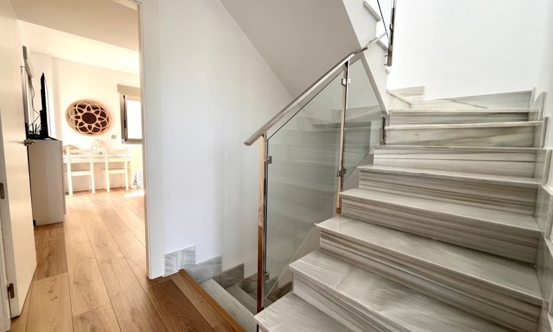 Step into modern coastal living with this exceptional 4 bedroom, 4 bathroom semi-detached home in the sought-after Torre de la Horadada. Located just 800 metres from pristine beaches, this property offers a rare combination of style, convenience, and Mediterranean charm. A short stroll takes you to the vibrant Nueva Plaza, filled with bars, restaurants, and local services, while the well-known main plaza is just two minutes away. For golf lovers, Lo Romero Golf Course is only a 15-minute drive. Sold fully furnished and ready to move into, this home is designed for effortless living. The open, light-filled spaces lead onto a large wraparound terrace with all-day sun, a private solarium with stunning sea views, pristine communal pool that can be accessed directly from the street — perfect for coming back from the beach and enjoying a swim without entering the house.. Every detail has been considered, from electric blinds with an automated security system in every room, to air conditioning throughout, built-in wardrobes, and two beautifully appointed en-suite bedrooms. The bathrooms feature underfloor heating for a touch of luxury all year round. With its unbeatable location just metres from the beach, top-quality finishes, and thoughtful design, this property is everything you need to enjoy your dream life on the Costa Blanca.