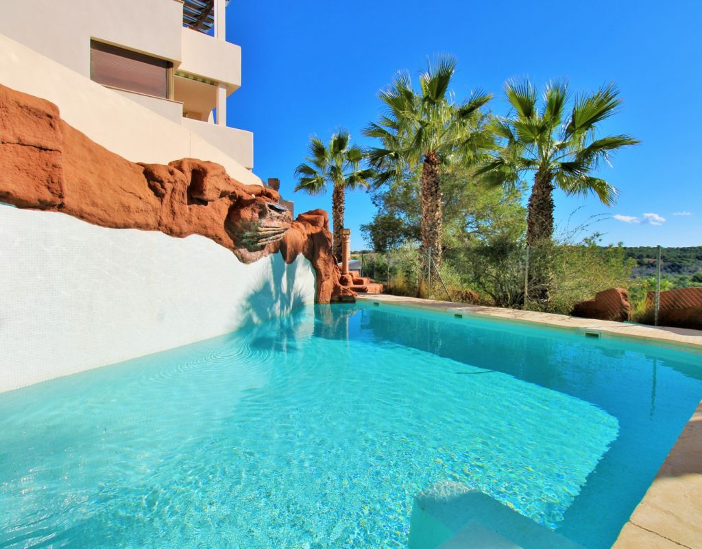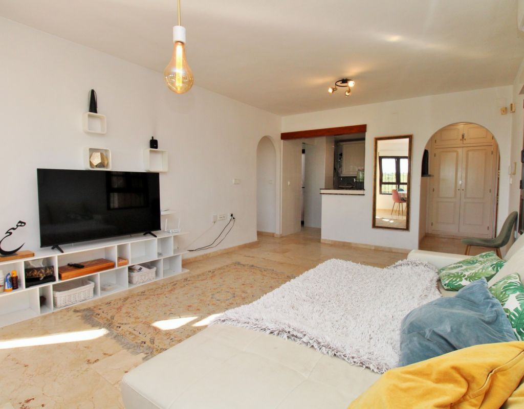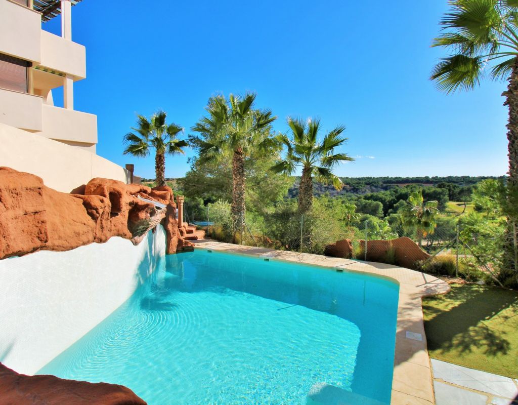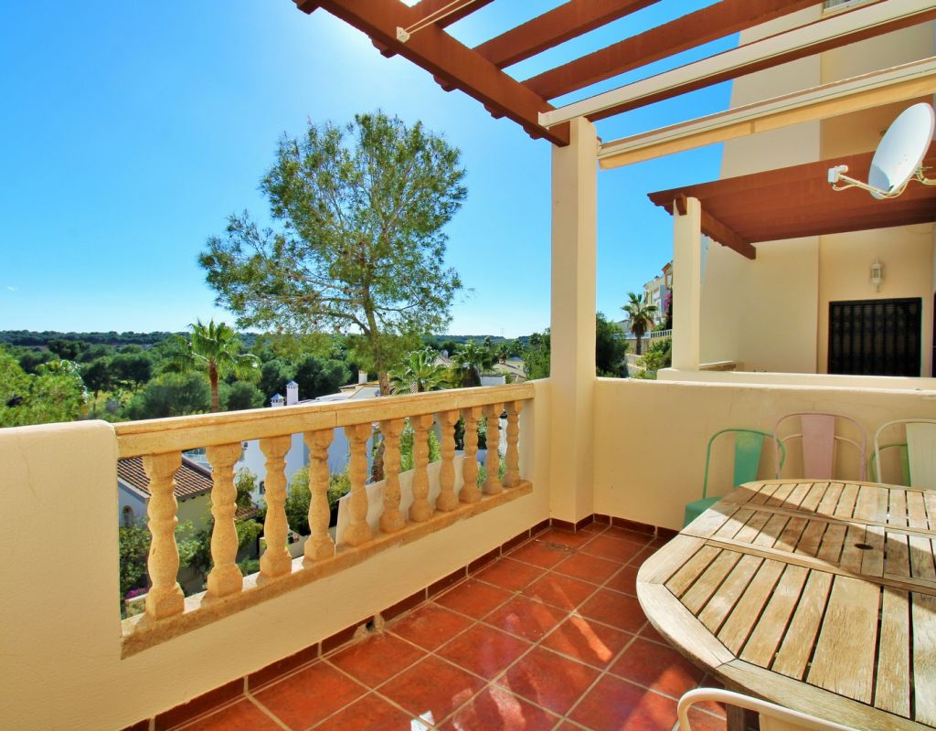 A spacious South-facing 2 bedroom, 2 bathroom ground floor apartment located within the sought-after Altamira V community in Las Ramblas Golf, just a short walk from the prestigious golf clubhouse. The property offers a bright and airy interior and comprises a generous lounge-dining area, leading to a fully equipped kitchen with separate utility room to the rear. There are two double bedrooms with fitted wardrobes, including a master bedroom with en-suite bathroom featuring a walk-in shower, along with a family bathroom. From the living area, you access a private South-facing terrace enjoying pleasant views towards the golf course — an ideal space for outdoor dining or relaxing in the sun throughout the year. Altamira V is a well-maintained community offering residents access to a communal swimming pool and jacuzzi area, surrounded by landscaped gardens. The apartment is perfectly positioned just a couple of minutes’ walk from the Las Ramblas Golf Club House, while the popular La Fuente Commercial Centre, supermarkets, restaurants, and the beautiful Orihuela Costa beaches are all just a short drive away. An excellent opportunity whether you are looking for a holiday home, permanent residence, or investment property in one of the most desirable golf communities on the Orihuela Costa.
