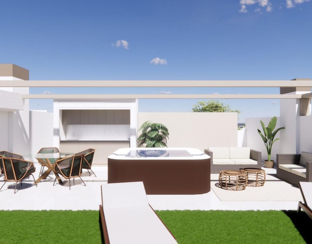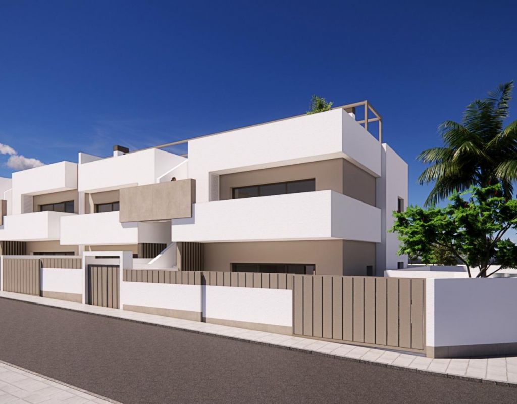 New Build Bungalows for Sale in Pilar de la Horadada 3 km from Beach Boutique Residential Development in Pilar de la Horadada Discover this exclusive new build residential complex of modern bungalows located in Pilar de la Horadada, the southernmost town of the Costa Blanca. This boutique project consists of only 14 carefully designed homes with 2 or 3 bedrooms and 2 bathrooms, offering an ideal combination of comfort, style and Mediterranean lifestyle. The development is situated in a quiet residential area within walking distance of the town center, allowing residents to enjoy easy access to shops, restaurants, supermarkets and essential services. Pilar de la Horadada is known for its welcoming atmosphere, traditional Spanish charm and lively main street filled with cafes, boutiques and charming squares. Modern Bungalows with Private Outdoor Spaces The homes have been designed to offer bright interiors and functional layouts, perfect for both permanent living and holiday use. Ground floor bungalows feature a private garden and private swimming pool, creating the perfect setting to enjoy outdoor living, sunbathing or entertaining family and friends. Top floor bungalows include a spacious terrace and a private rooftop solarium. The solarium comes with a summer kitchen and offers the option to add a private pool or jacuzzi at an extra cost, making it an ideal space to relax while enjoying the warm Mediterranean climate and open views. Each property includes a private parking space within the residential complex for added convenience. Quality Construction and Modern Features These new build homes are built with quality materials and modern installations designed to ensure comfort and energy efficiency throughout the year. Aluminum exterior carpentry with thermal break Fully fitted kitchens with included appliances Bathrooms equipped with mirrors and shower screens Interior and exterior LED lighting Hot water system with energy efficient aerothermal technology Pre installation for ducted air conditioning The combination of modern design and practical features makes these homes an excellent option for buyers looking for a contemporary property on the Costa Blanca. Excellent Location Close to Beaches and Golf Pilar de la Horadada enjoys a strategic location close to some of the best beaches and golf courses in the region. Torre de la Horadada beach 3 km Mil Palmeras beach 3 km Lo Romero Golf 6 km Region de Murcia International Airport 45 km Alicante Elche Airport 75 km The area also offers excellent road connections to nearby coastal towns, marinas and leisure facilities, making it a perfect base to explore the Costa Blanca and Costa Calida. Find Your New Home on the Costa Blanca If you are looking for a modern new build bungalow near the beach with excellent amenities and a fantastic location, this residential development in Pilar de la Horadada is an outstanding opportunity. Contact us today for more information or to schedule a visit.