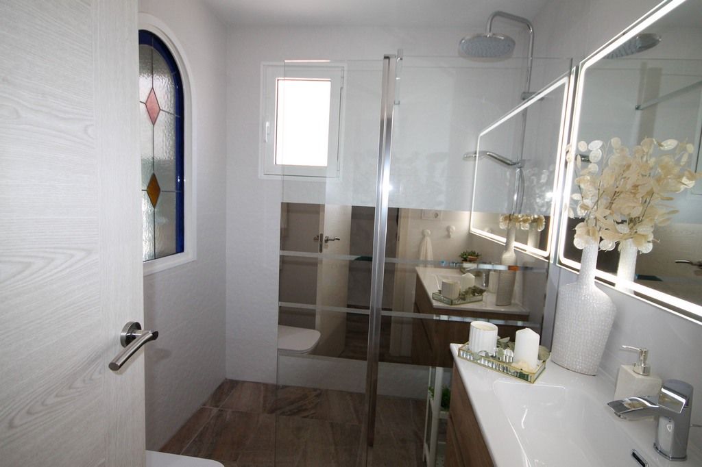 A beautifully renovated detached villa with a large basement. It comprises of a entrance porch into the hallway which leads to a shower room and a large double bedroom. The hall opens into a light and spacious lounge diner with a large well equipped kitchen adjacent. Patio doors access the enclosed terrace which overlooks the patio garden and swimming pool. Stairs from the hall lead up to the family shower room, a guest room, currently used as a walk in wardrobe. There is also a spacious master bedroom with mirrored wardrobe doors. Patio doors access the large solarium overlooking the pool. The garden also has a gazebo and plenty of space to relax and entertain. Accessed from the garden, there is a very large basement. This has a shower room, a utility room, storage, a double bedroom and a large room which is currently used as an office space. However this is large enough to make into a lounge diner with kitchen and offer a completely separate apartment. The entire villa has been tastefully renovated from windows, doors, floors, kitchen, bathrooms and the outside too. The villa also benefits from off road parking and sun awnings on the solarium. The villa is tastefully decorated and furnished throughout and is included in the sale. Viewing highly recommended!
