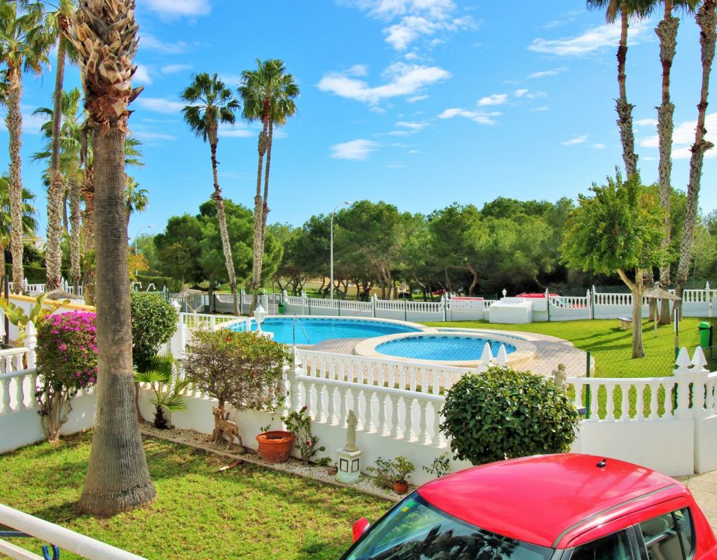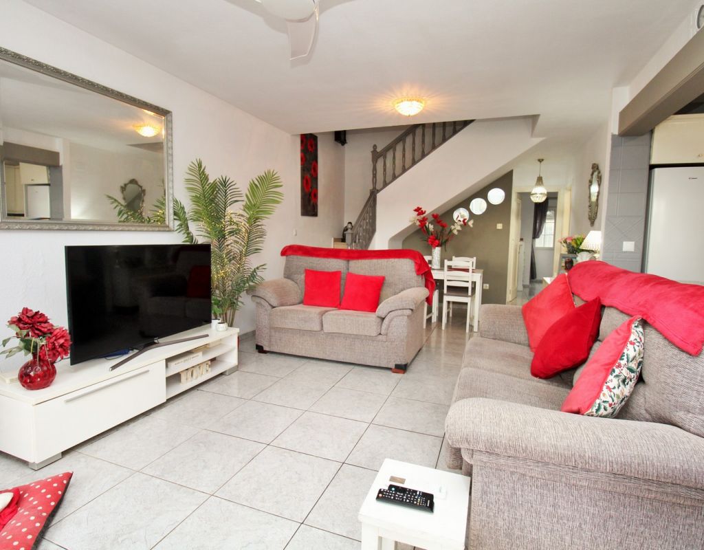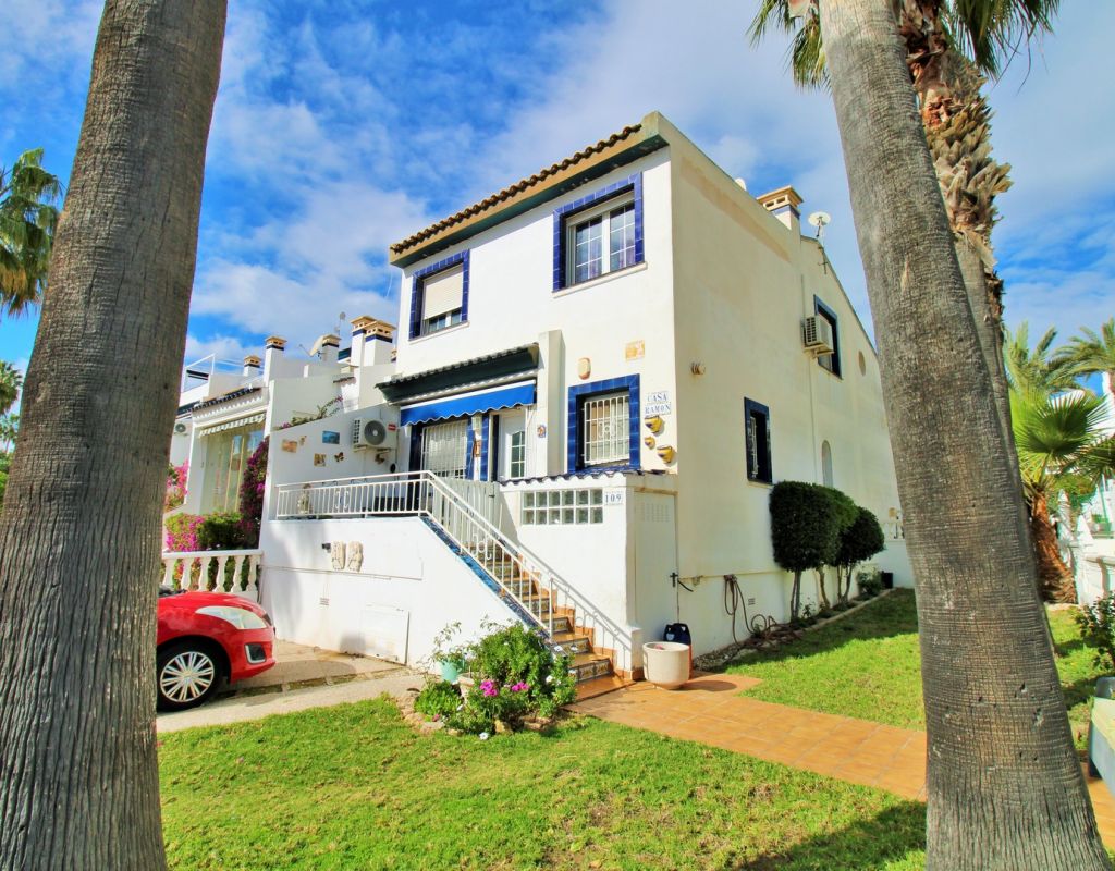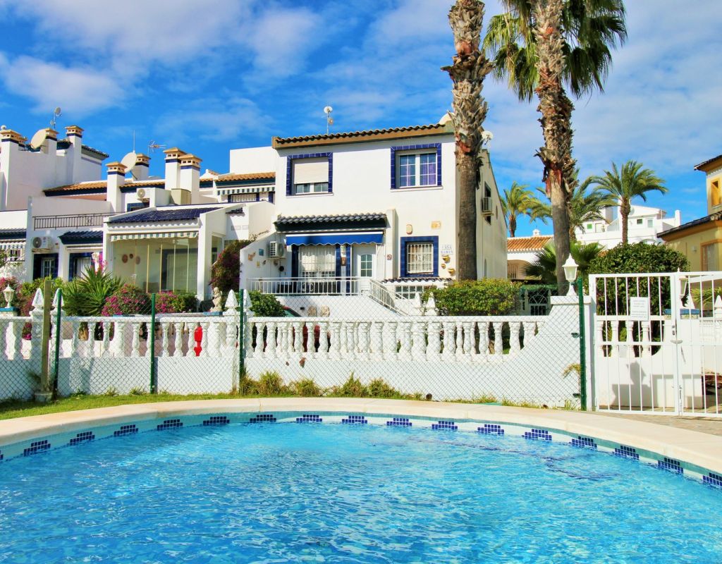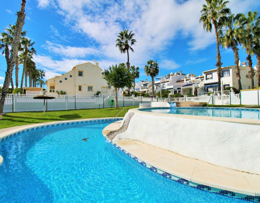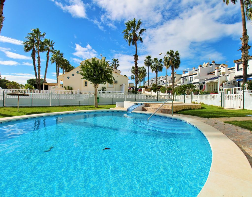 A rare opportunity to purchase a South-East facing corner Buhardilla townhouse located in the sought-after La Rioja community near Los Dolses, occupying an end-of-terrace position overlooking the beautiful communal swimming pool — a highly desirable and rarely available setting within this development. This unique property benefits from a front and rear wrap-around garden with off-road parking, along with a raised terrace enjoying open views across the pool area, creating an ideal space for outdoor dining and relaxing in the sun. The ground floor comprises a bright lounge-dining area, a fitted kitchen with separate utility area, two double bedrooms with fitted wardrobes, and a family bathroom positioned to the rear. One of the bedrooms provides direct access to the rear garden, adding practicality and outdoor connectivity. Upstairs, the property offers a second living space — a characteristic feature of the Buhardilla design — alongside two further double bedrooms with fitted wardrobes and a bathroom with walk-in shower, making this an exceptionally spacious home rarely found in this style. This is a very unique 4-bedroom Buhardilla townhouse in an outstanding position within the community, ideal as a permanent residence, holiday home, or investment property. Perfectly located within walking distance to the La Fuente and Los Dolses commercial centres, offering a wide selection of bars, restaurants, shops, supermarkets and services. The popular Villamartin Plaza and golf course are also reachable on foot, while the beaches of Orihuela Costa and Zenia Boulevard shopping centre are just a short drive away.