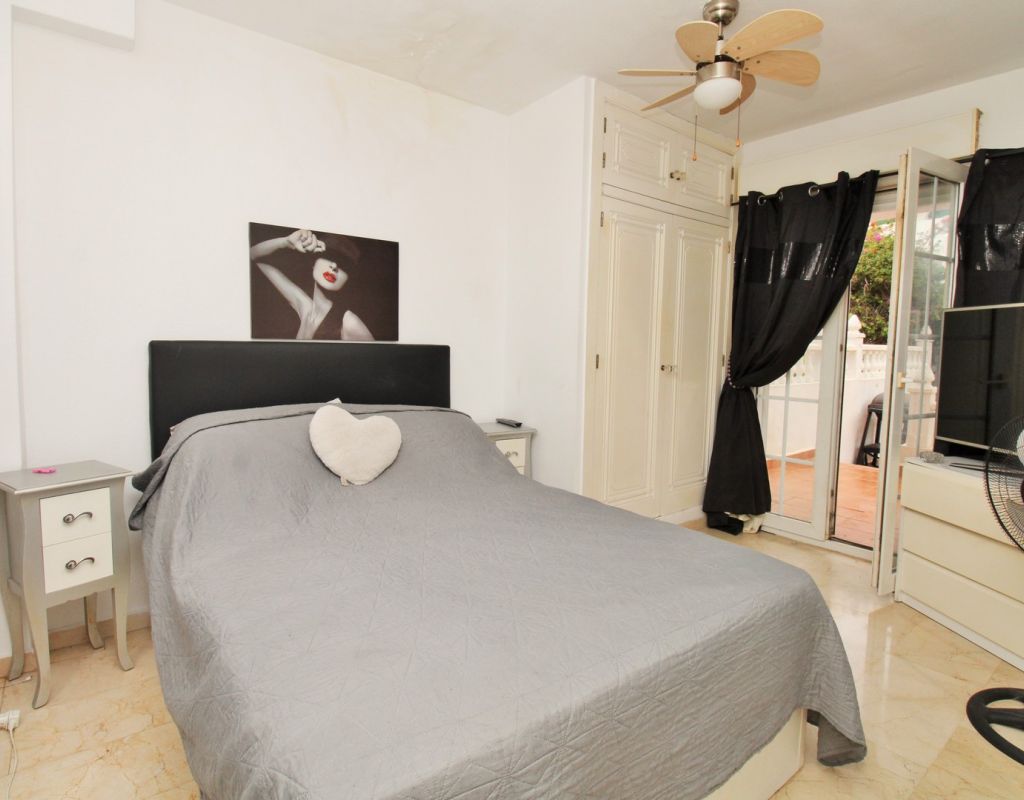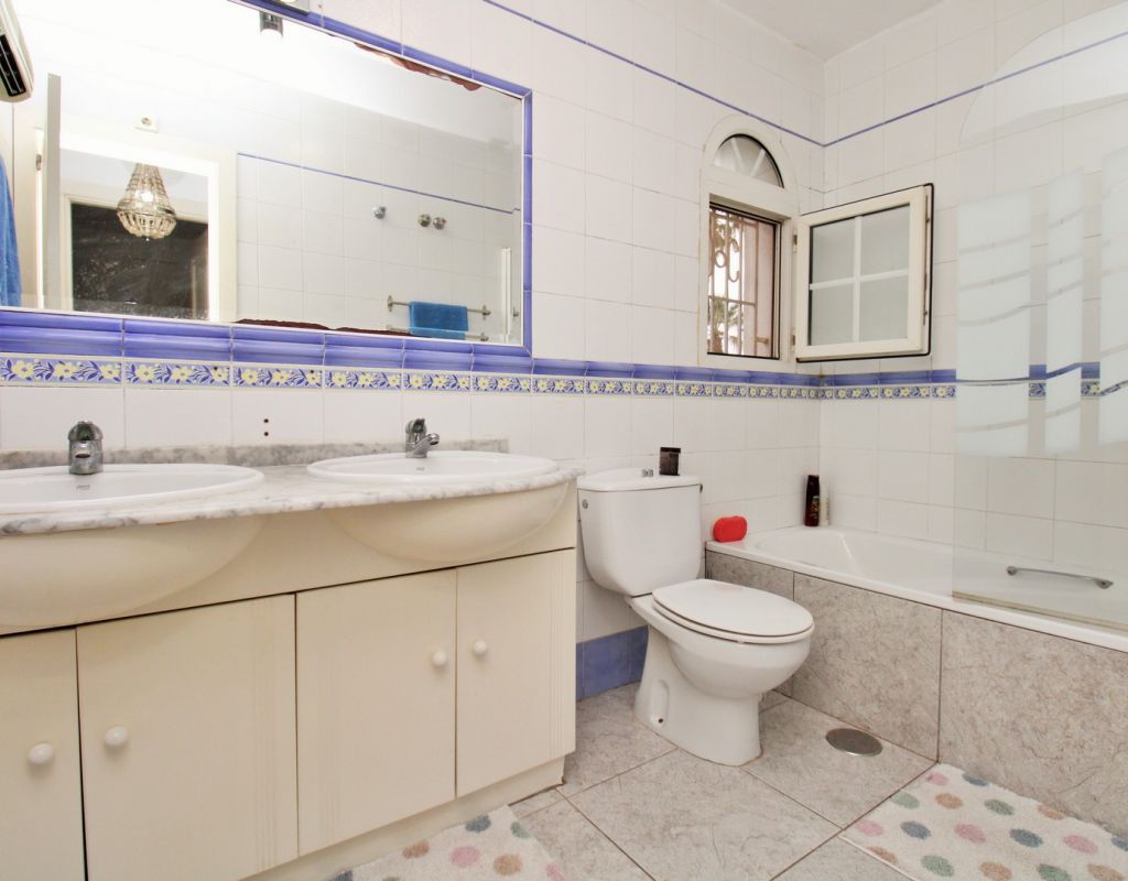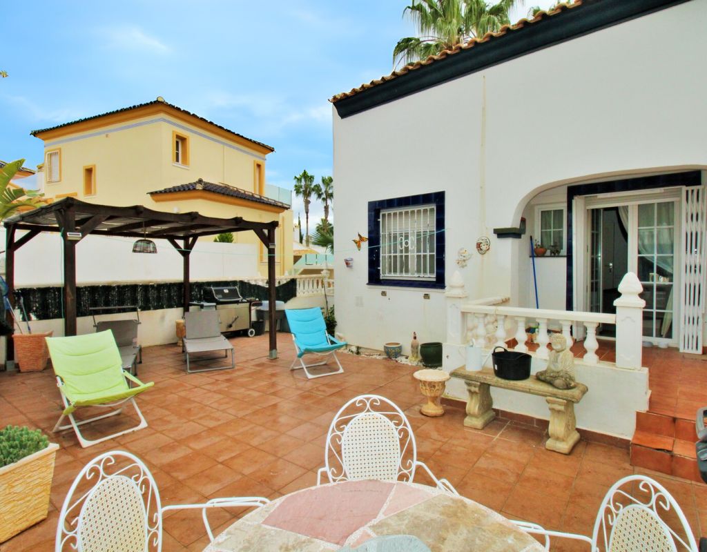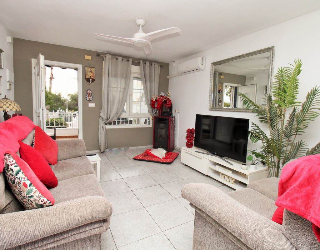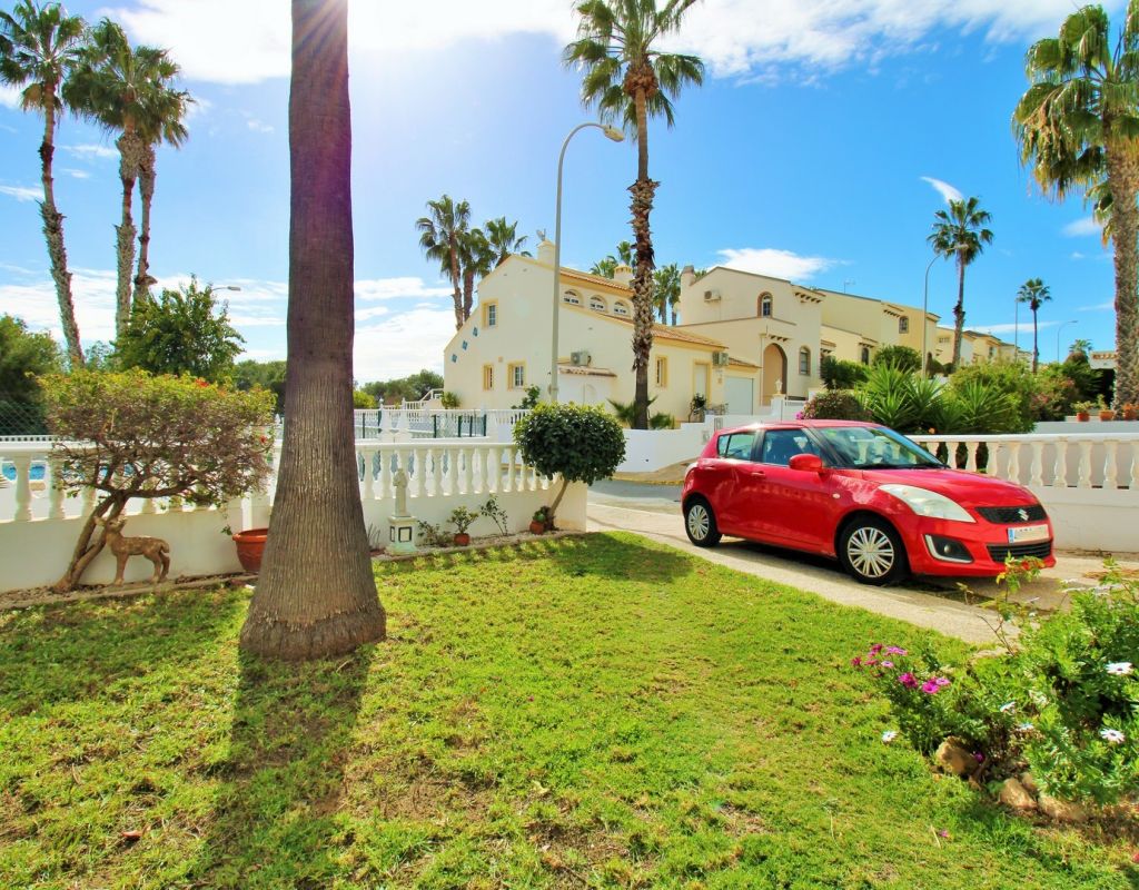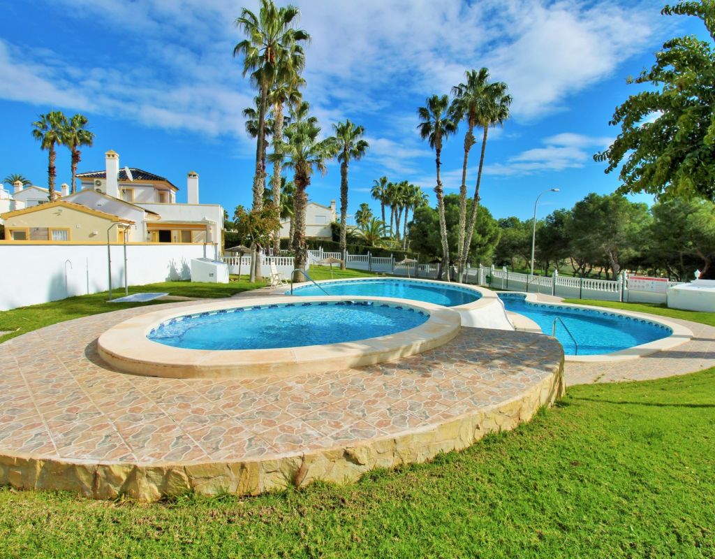 A rare opportunity to purchase a South-East facing corner Buhardilla townhouse located in the sought-after La Rioja community near Los Dolses, occupying an end-of-terrace position overlooking the beautiful communal swimming pool — a highly desirable and rarely available setting within this development. This unique property benefits from a front and rear wrap-around garden with off-road parking, along with a raised terrace enjoying open views across the pool area, creating an ideal space for outdoor dining and relaxing in the sun. The ground floor comprises a bright lounge-dining area, a fitted kitchen with separate utility area, two double bedrooms with fitted wardrobes, and a family bathroom positioned to the rear. One of the bedrooms provides direct access to the rear garden, adding practicality and outdoor connectivity. Upstairs, the property offers a second living space — a characteristic feature of the Buhardilla design — alongside two further double bedrooms with fitted wardrobes and a bathroom with walk-in shower, making this an exceptionally spacious home rarely found in this style. This is a very unique 4-bedroom Buhardilla townhouse in an outstanding position within the community, ideal as a permanent residence, holiday home, or investment property. Perfectly located within walking distance to the La Fuente and Los Dolses commercial centres, offering a wide selection of bars, restaurants, shops, supermarkets and services. The popular Villamartin Plaza and golf course are also reachable on foot, while the beaches of Orihuela Costa and Zenia Boulevard shopping centre are just a short drive away.